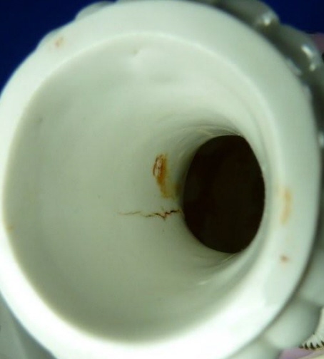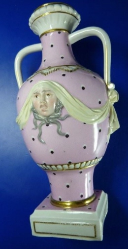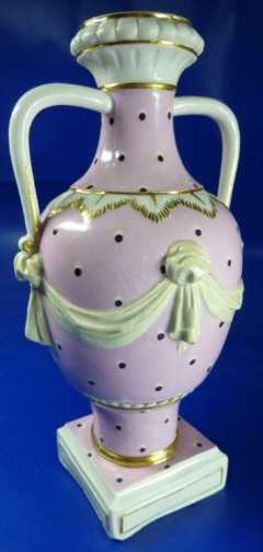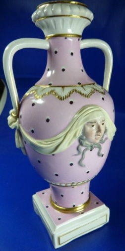 This is a vase made by Hoechst in the 18th century. It is handpainted with a nice pink ground color with black and white spots all around and has a gold raised design including garlands as well as face on the front and two handles. The vase is in great condition with a little gold wear, the base not being even (it moves a bit when on a level table) and a few tiny chips to the base. The vase is marked underneath with the underglaze blue wheel mark as well as an incised R and 38. It is 7.125 inches tall. Please email me for more information or other pictures.