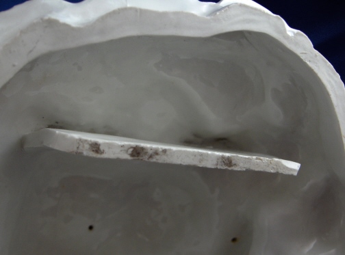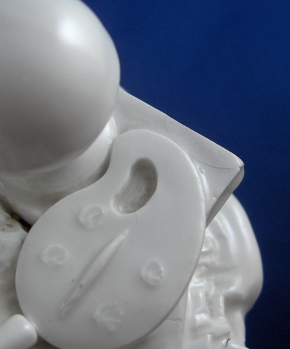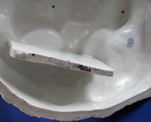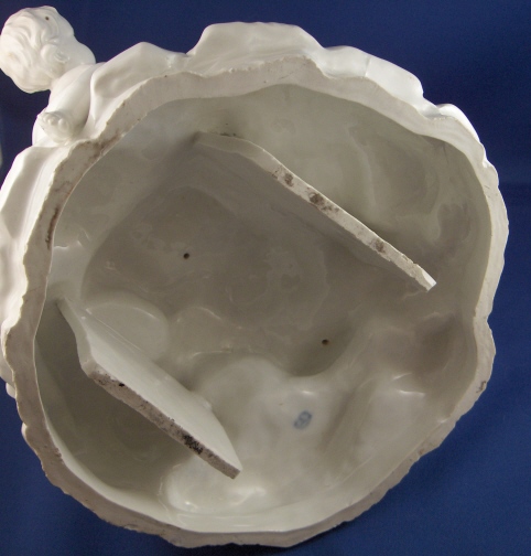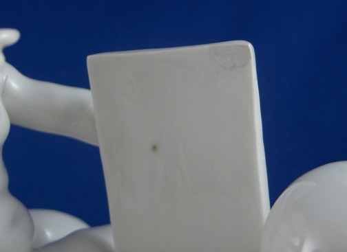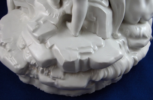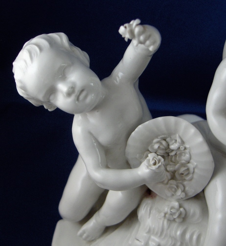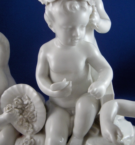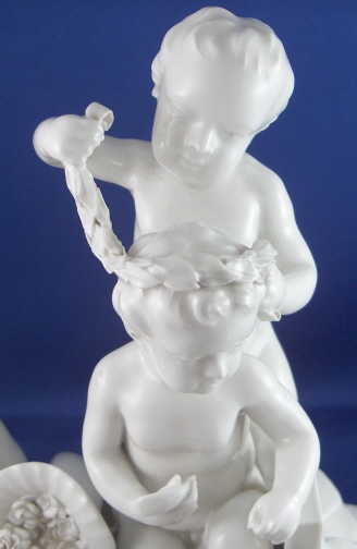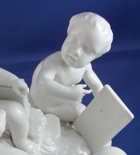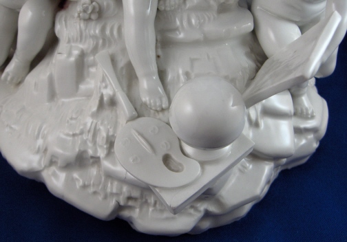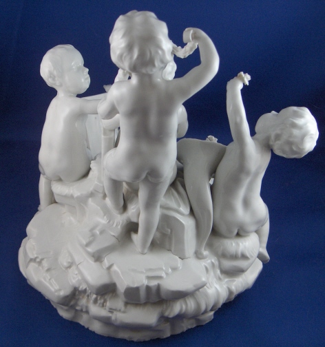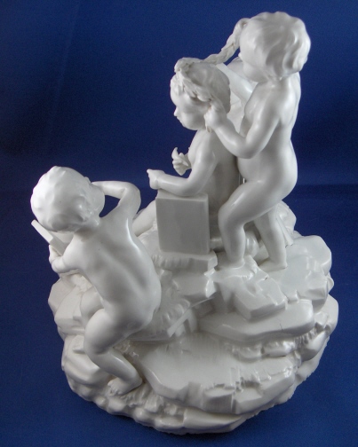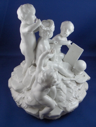 This is a figurine made by Hoechst in about 1790. It is of four puttos in various activities. One has a horn of plenty by his side with flowers in it, another is crowning his fellow putto with a garland of leaves, the other has a feather in his hand and a book by his side and the last has a tablet in his left hand. A globe, paint pallet and other items are in front of them on the grassy and rocky base. The figure is 9 inches tall and about 8 inches in diameter. It is in superb condition with a restored chip to the tablet corner as well as one to the book underneath the globe. Some small chipping to base rim all around and various firing cracks from the making. The figure is marked underneath with an underglaze blue wheel mark. Please email me for more information or other pictures.