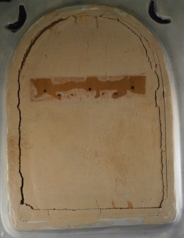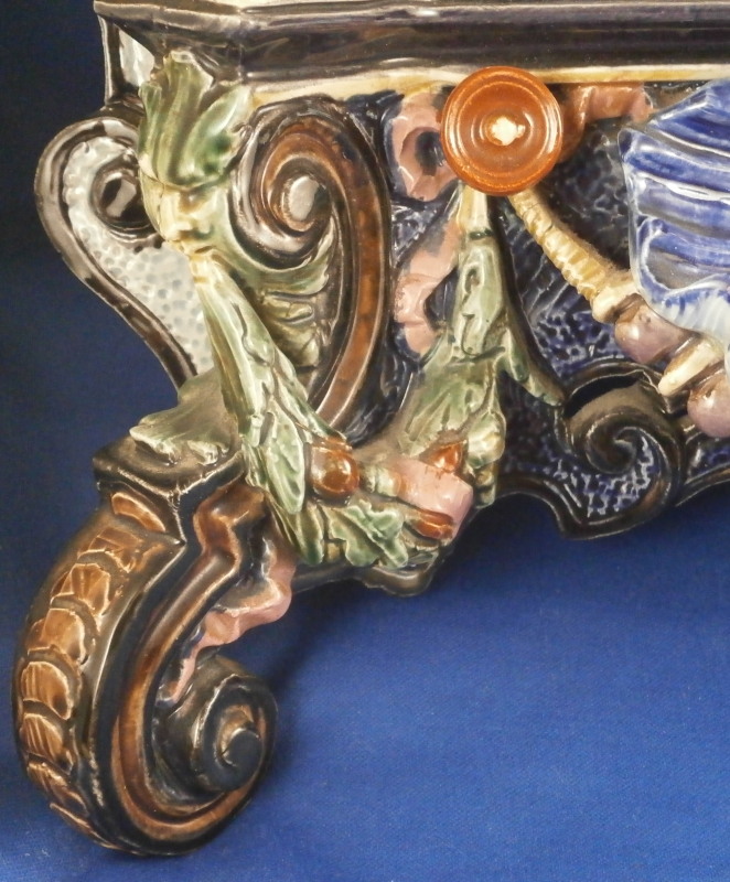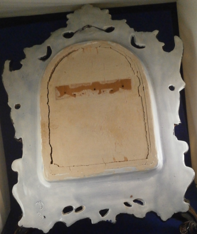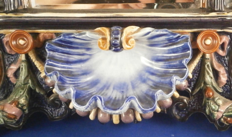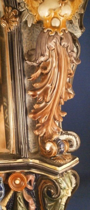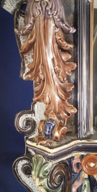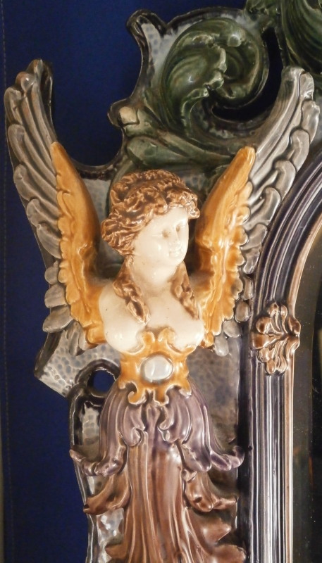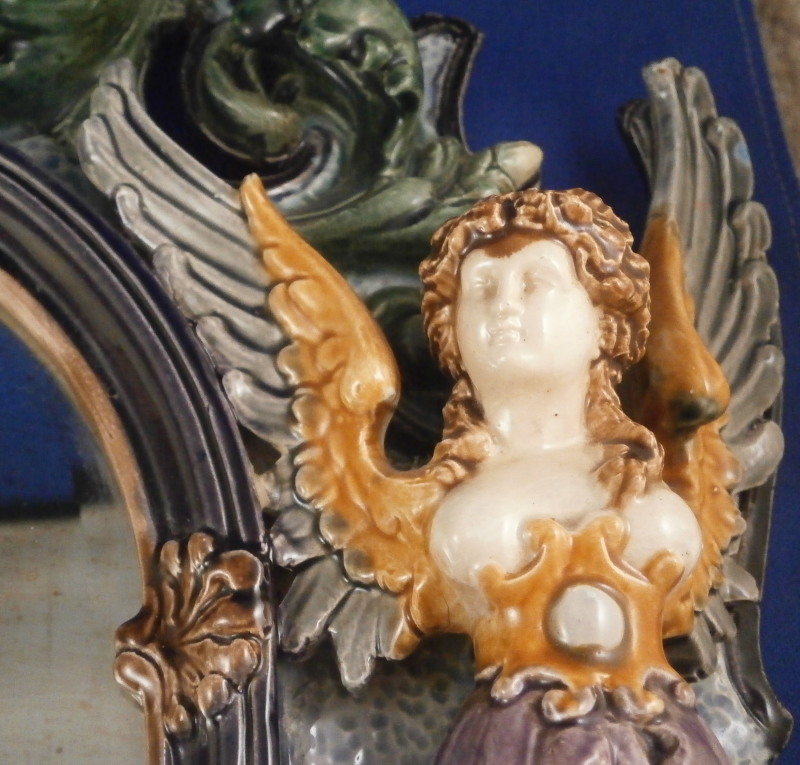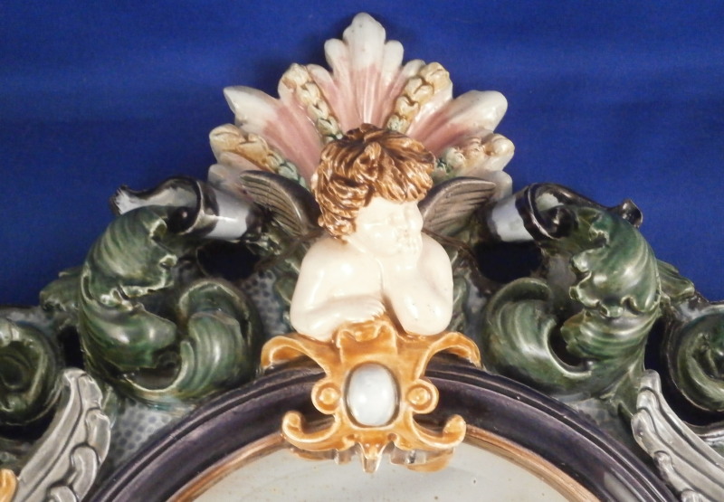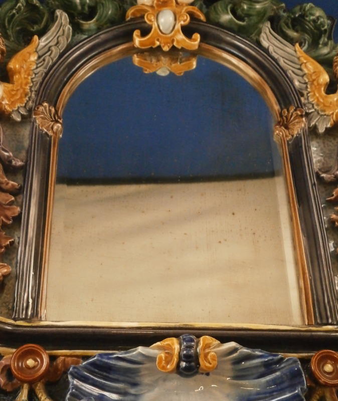 This is a superb majolica mirror frame made by Hugo Lonitz in the late 19th century. It is superbly modeled iIn the Renaissance style with winged angels to the side, a putto to the top and the lower section with a shell in the center likely for holy water with some fancy scrollwork and leaf garlands filling in the rest of the space. Hugo Lonitz was a German majolica maker that employed as many as 40 people during its peak and was located in Neuhaldensleben near Magdeburg in Prussia . He is best known for his naturalistic majolica pieces with his inspiration coming from the Black Forest carvings popular in Europe during this time. He exhibited at several of the 19th century world exhibitions including the 1876 International Exhibition in Philadelphia . The mirror was originally designed to be a table mirror and are thus often damaged but in this case it was converted to a hanging mirror and is in amazing condition with three or four very minor glaze chips and no real damage. The backside where the mirror is has been worked on likely to replace the mirror though this one is also older with some flaws to the reflective surface as shown. The mirror is bevelled. There used to be a stand attached to the wooden back cover of the mirror which is gone. All in all an amazing piece in amazing condition. The piece is about 19 inches tall, 14 inches wide and 2.5 inches deep. It is marked with the impressed double fish mark in an oval with the model number 1628 . Please email me for more information or photos!