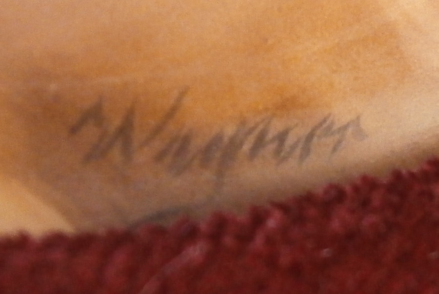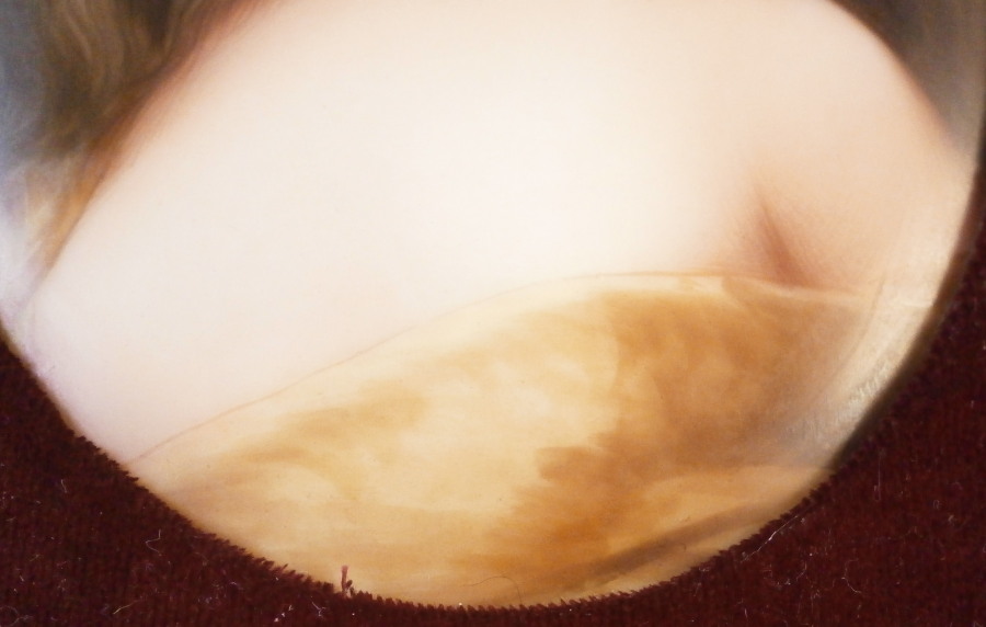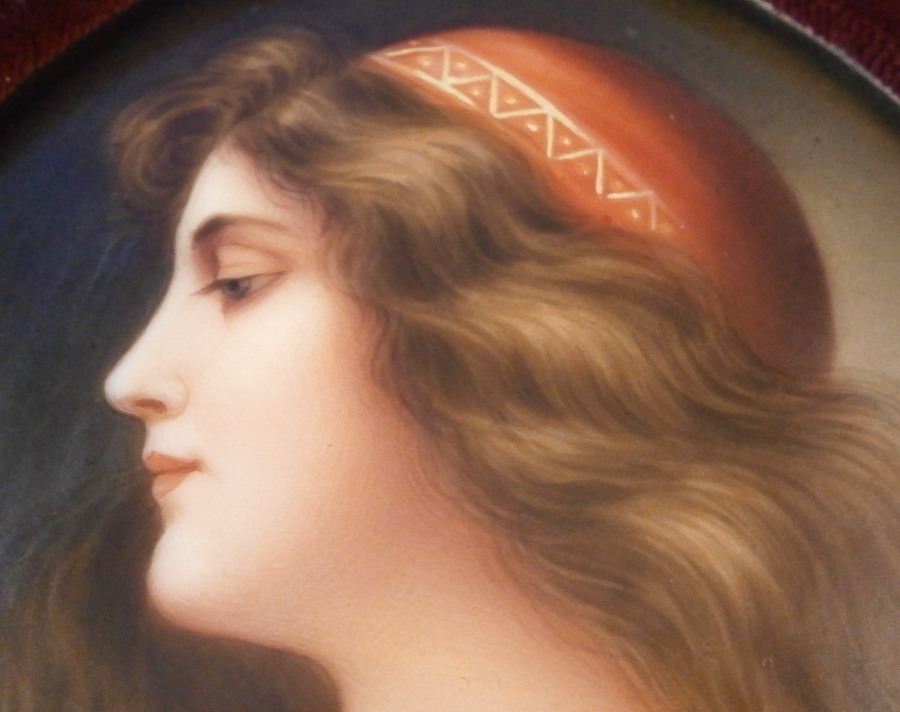 This is a superb quality large portrait plaque made by Hutschenreuther in the late 19th century. The piece is of a young lady with long brown hair wearing a red cap. The piece looks very elegant. It is signed by the painter Wagner which explains why the quality of the painting is top notch. This painter also painted on KPM plaques so he is well known! The lady is after a painting by Angelo Asti titled Una Gitana which means a Gypsy. The visible part of the plaque is about 4.875 inches tall and 3.75 inches wide so a nice size. It is framed in a cheap black frame with a gold trim to the inside and a burgundy velvet mat board. The plaque is in perfect condition. It is signed with the Hutschenreuther impressed mark of the crown over the shield with their letters inside as shown as well as an impressed number. The frame has some scratches to the black where the wood shiens through. They display nicely together! Please email me for more information or photos.