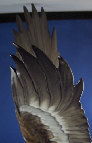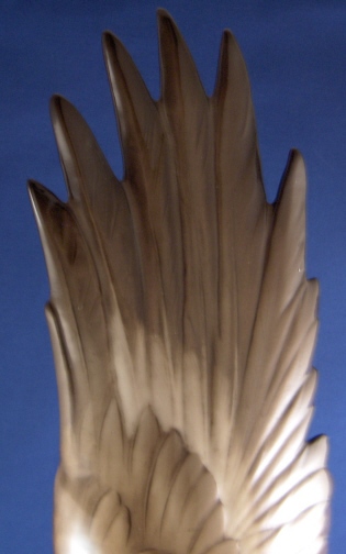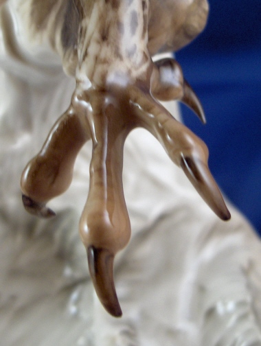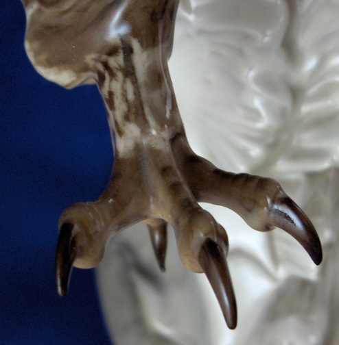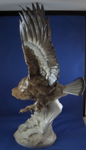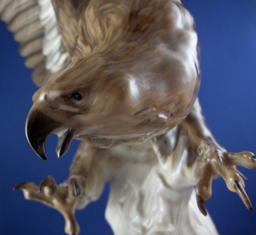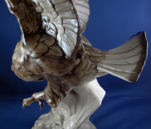 This is a large porcelain figurine of an eagle made by Hutschenreuther around 1960. It is very well modeled and handpainted to look very elegant and real. The figurine is in perfect condition which is amazing given the fragile nature of this piece! It is marked underneath with the green mark of a lion, etc. as shown in the pictures. Also incised is K. Tutter for the modeler Karl Tutter. The figurine is 17 inches tall, 9 inches wide and 8.5 inches deep. Please email me for more information or photos.