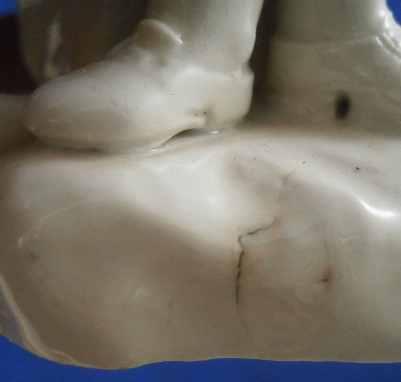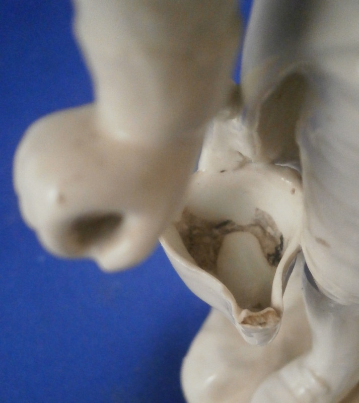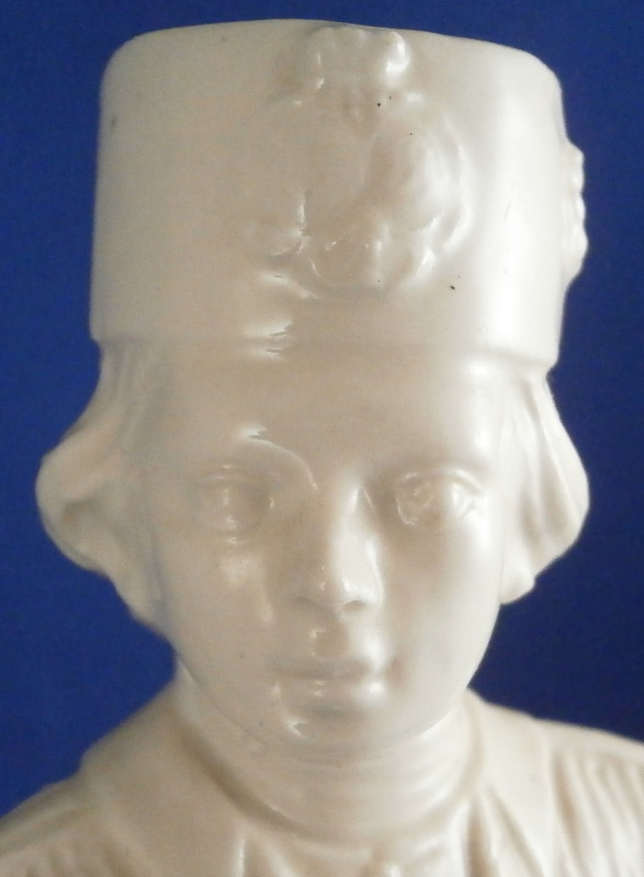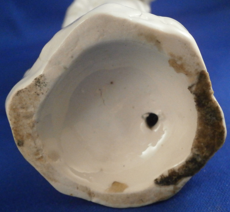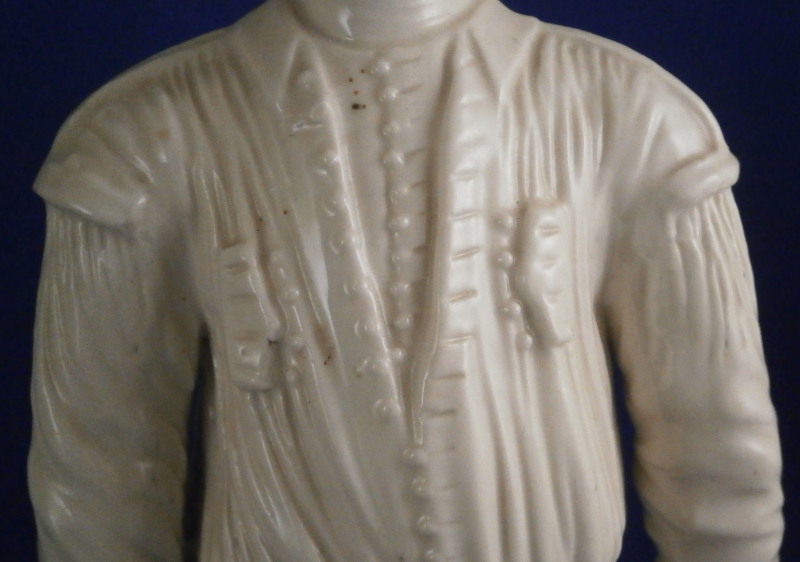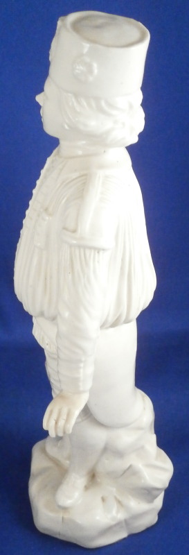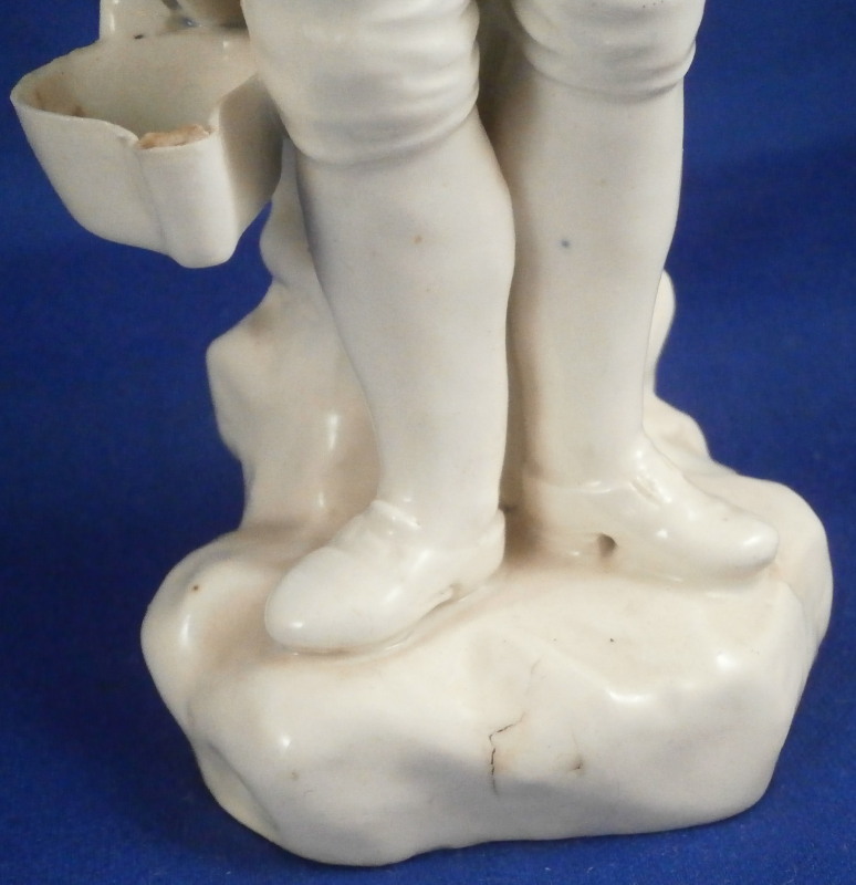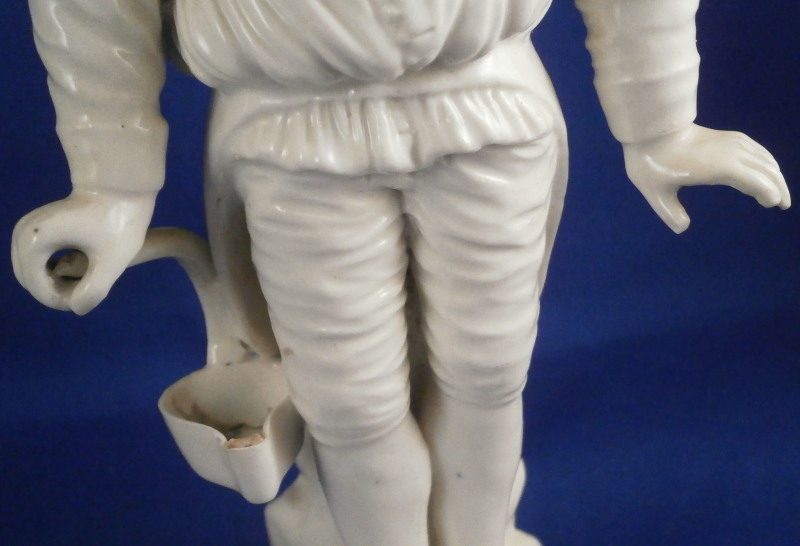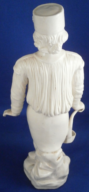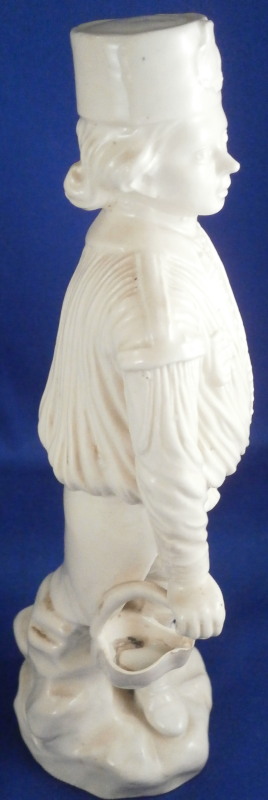 This is a very rare figurine made by Ilmenau around 1780. These miner figurines were modeled by Johann Lorenz Rink (aka Laurentius Rienck ) between 1780 and 1786. Most seem to have belonged to a band though this one here is holding some other sort of object that looks to be for pouring a liquid. These figures are very rare and the only other ones I found were in different museums. The figure is superbly modeled and from the early period of this makers. Left in the white to show off all their skill and let the detail speak for itself. The figurine is in great condition with some early firing flaws from the making common to these pieces and a chip to the very tip of the pouring cup. It is not marked underneath but a known model and there is no question as to the maker or age. The piece is 7.62 inches tall, 3.5 inches wide and 2 inches deep. Please email me for more information or photos.