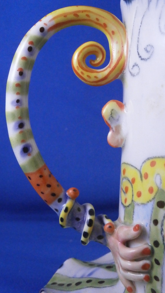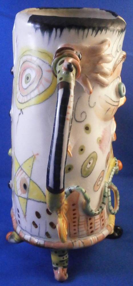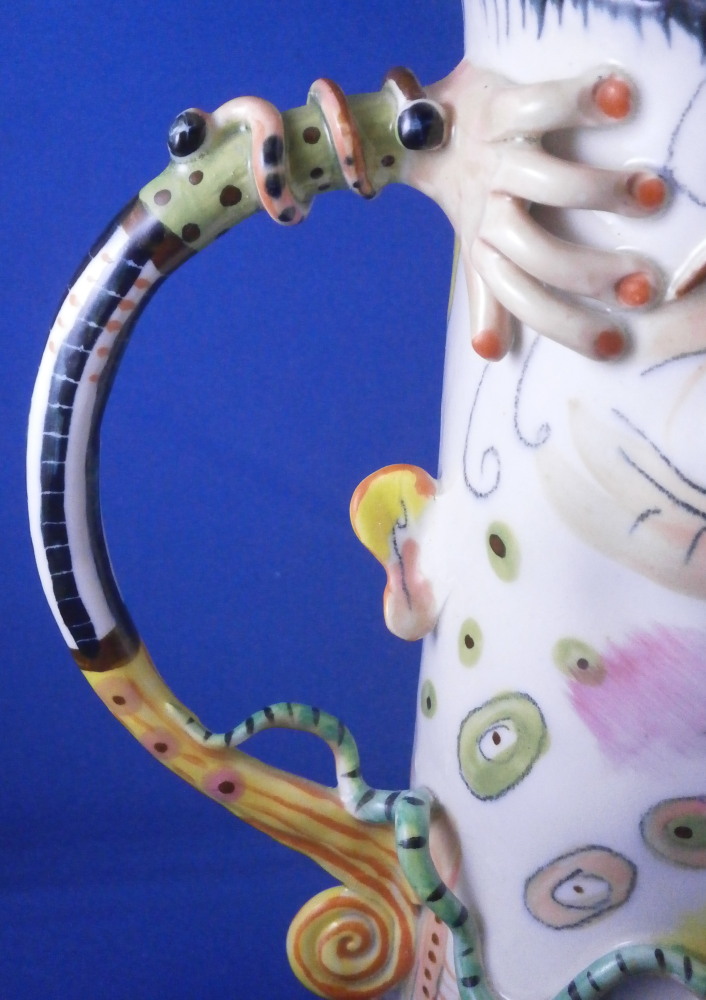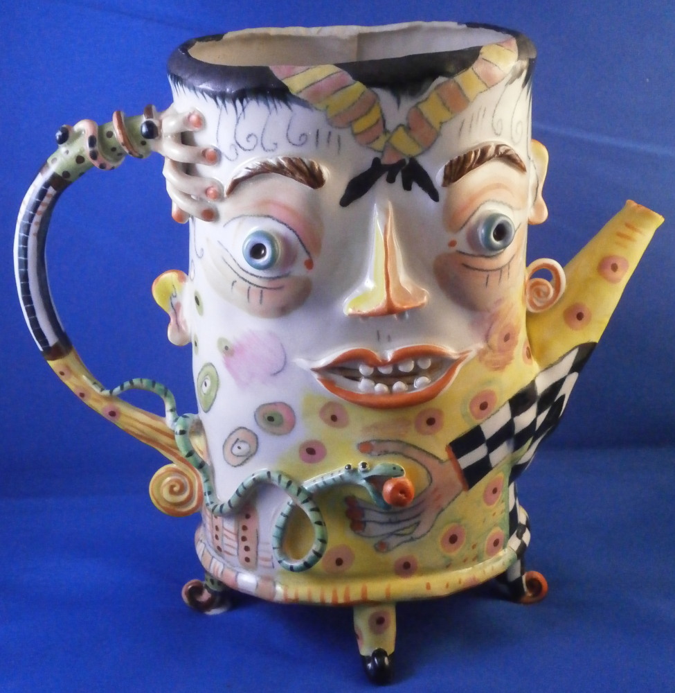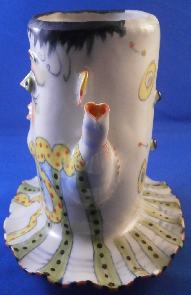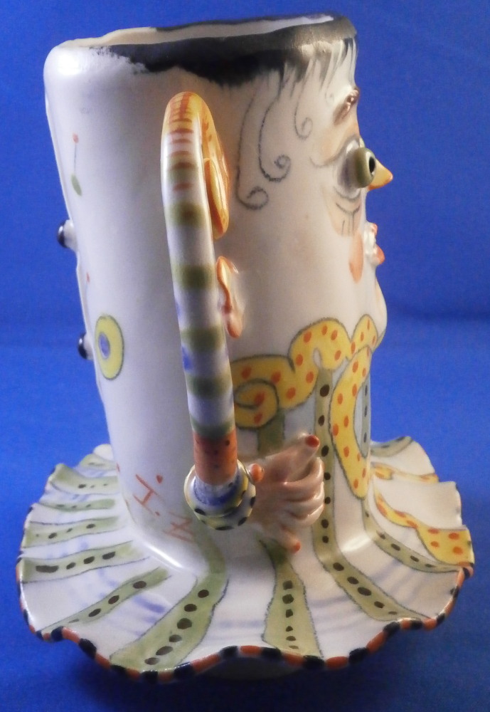 This is a really fun and rare treat - a figural porcelain stacked pot made by Russian American artist Irina Zaytceva in the later 20th century. Irina Zaytceva was born in Moscow and graduated from the Moscow Art Institute in 1982 with degree in book illustration but figured out that her true love was sculpting in porcelain. Who can blame her! :) Her pieces can be seen in museums in the United States as well as abroad like the Hermitage Museum in St. Petersburg, Russia. These are usually called stacked teapots though it could be a coffee pot and creamer or you can use it for anything esle you'd like. Display is off course the norm but you can water your flowers with it as well :) Both pieces are potted in her usual whimsical way with the faces to the front and the hand forming the handle. a snake as the finial on the lid and another to the front of the bigger pot. The bottom pot sits on four feet. I think she referred to these pieces as the snake charmers. The pieces are almost in the direction of folk art. Her pieces just make you smile everytime you look at them and these stacked ones are very ahrd to find! Definitely unlike anything else you'll come across. The set is in perfect condition. There is an area to the top edge of the bigger pot that look like some minor chips but they are from when she made it and not real damage. The bigger pot is signed on the back in orange I. Zaytceva and again underneath I. sZ. with a half moon or banana looking thing. The smaller pot is signed I.Z in orange in the back. The stacked set is about 14 inches tall,. The bottom bigger pot is 7.375 inches tall, about 7.75 inches from handle to spout and 3.75 inches deep. The smaller pot and its lid are 6.75 inches tall (including the ring that would sit inside the other pot) , 5.75 inches wide and 3.75 inches deep. Please email me for more information or other pictures.