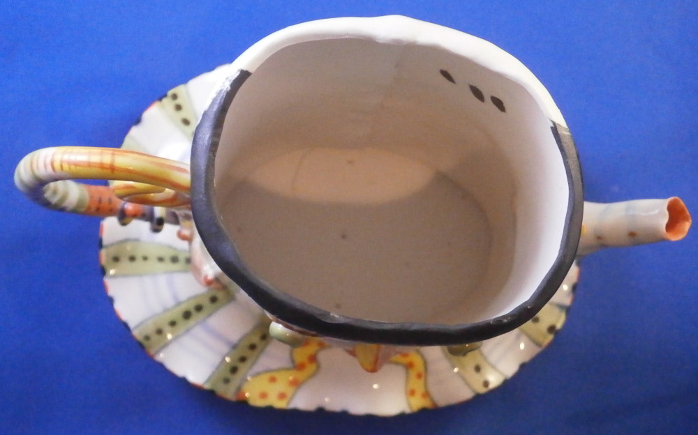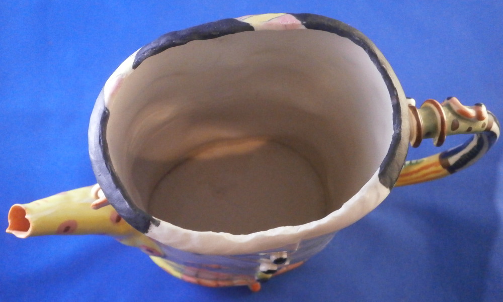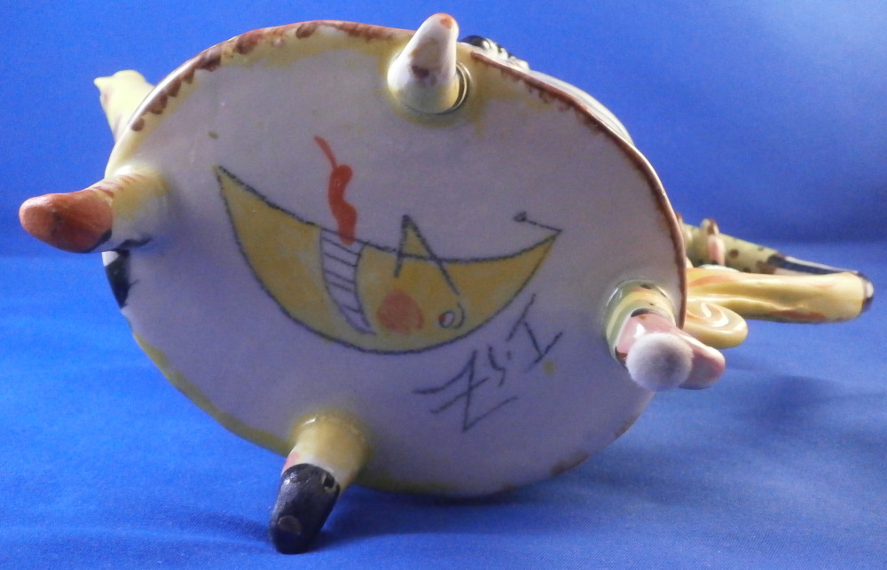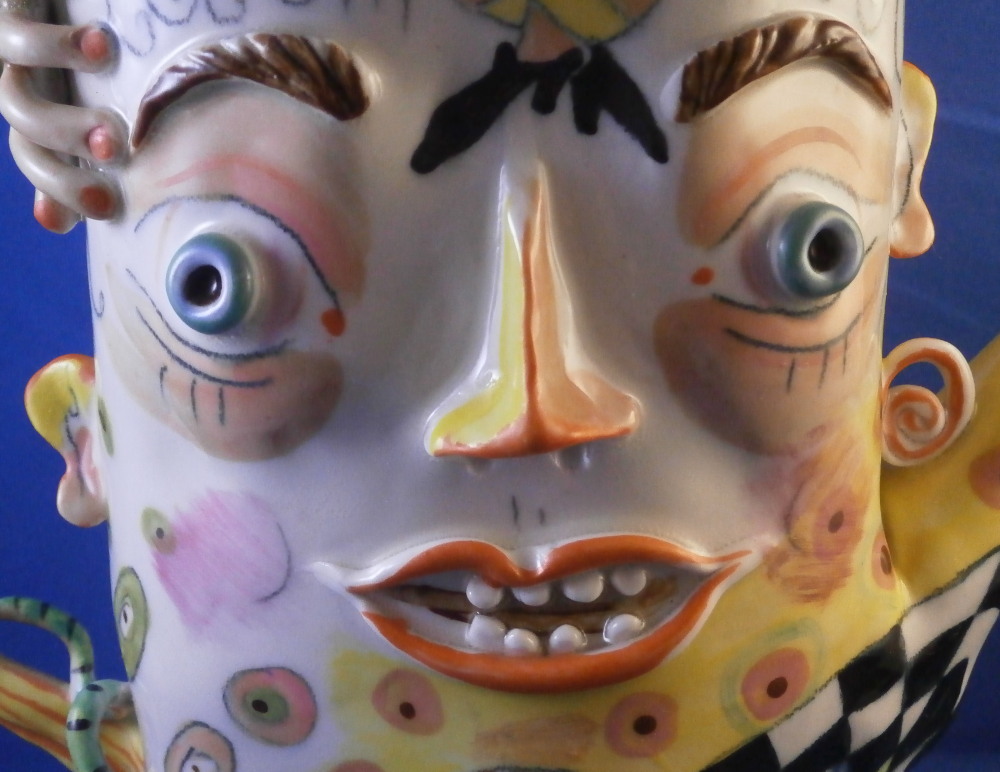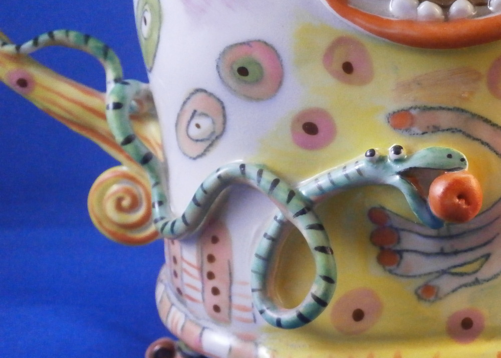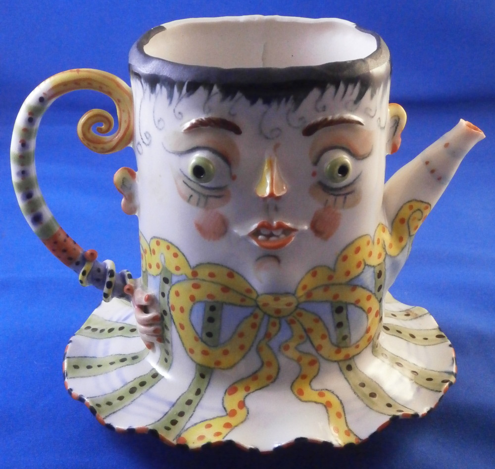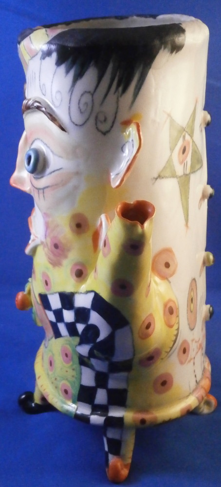 This is a really fun and rare treat - a figural porcelain stacked pot made by Russian American artist Irina Zaytceva in the later 20th century. Irina Zaytceva was born in Moscow and graduated from the Moscow Art Institute in 1982 with degree in book illustration but figured out that her true love was sculpting in porcelain. Who can blame her! :) Her pieces can be seen in museums in the United States as well as abroad like the Hermitage Museum in St. Petersburg, Russia. These are usually called stacked teapots though it could be a coffee pot and creamer or you can use it for anything esle you'd like. Display is off course the norm but you can water your flowers with it as well :) Both pieces are potted in her usual whimsical way with the faces to the front and the hand forming the handle. a snake as the finial on the lid and another to the front of the bigger pot. The bottom pot sits on four feet. I think she referred to these pieces as the snake charmers. The pieces are almost in the direction of folk art. Her pieces just make you smile everytime you look at them and these stacked ones are very ahrd to find! Definitely unlike anything else you'll come across. The set is in perfect condition. There is an area to the top edge of the bigger pot that look like some minor chips but they are from when she made it and not real damage. The bigger pot is signed on the back in orange I. Zaytceva and again underneath I. sZ. with a half moon or banana looking thing. The smaller pot is signed I.Z in orange in the back. The stacked set is about 14 inches tall,. The bottom bigger pot is 7.375 inches tall, about 7.75 inches from handle to spout and 3.75 inches deep. The smaller pot and its lid are 6.75 inches tall (including the ring that would sit inside the other pot) , 5.75 inches wide and 3.75 inches deep. Please email me for more information or other pictures.