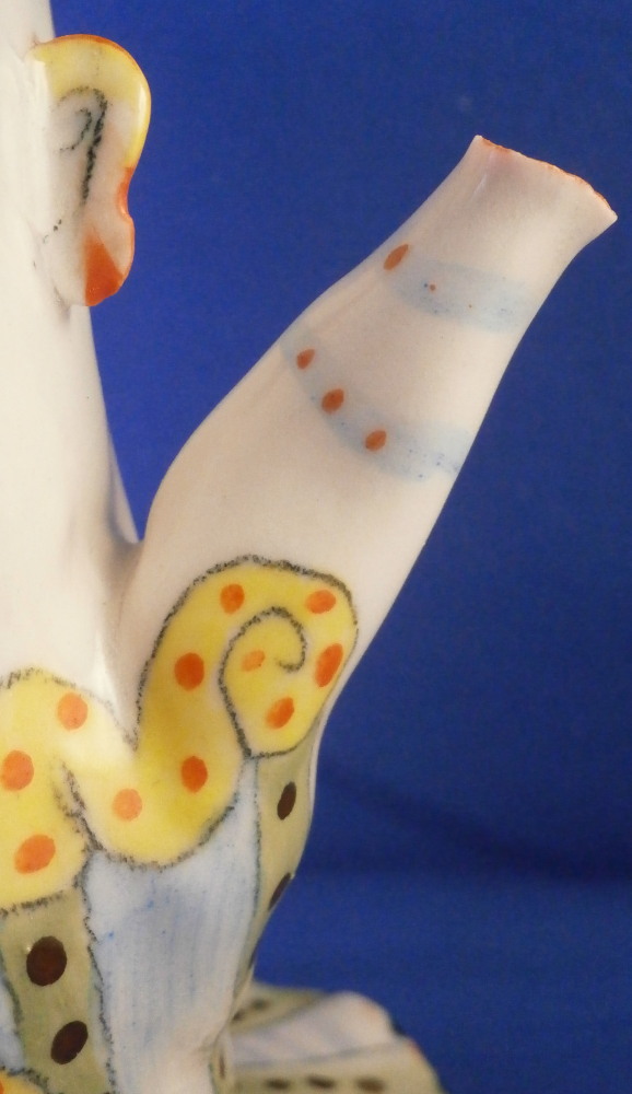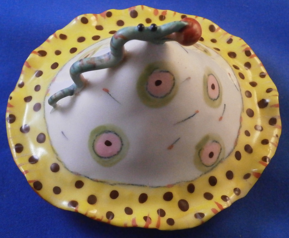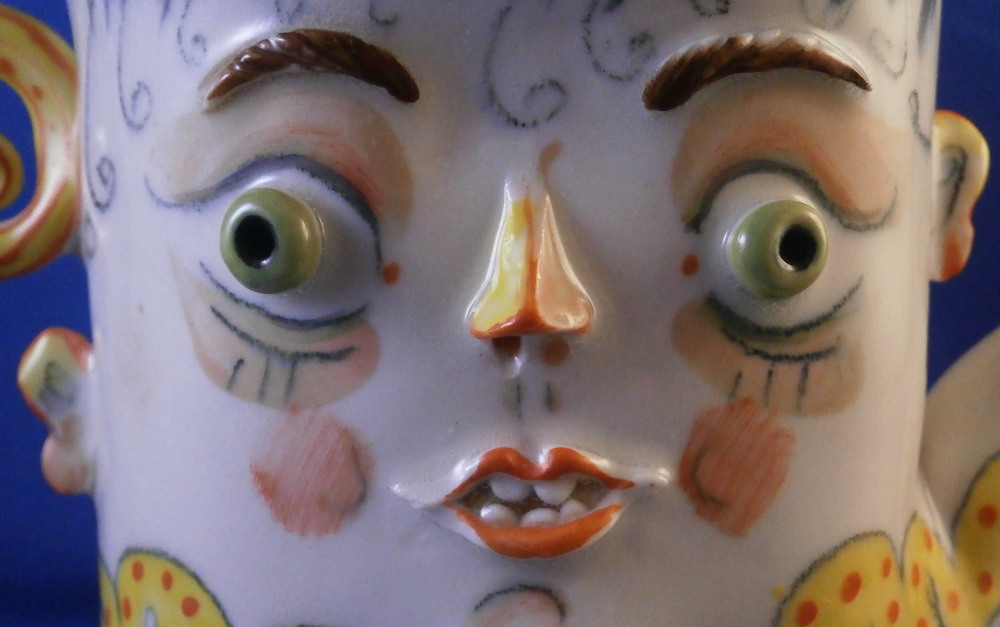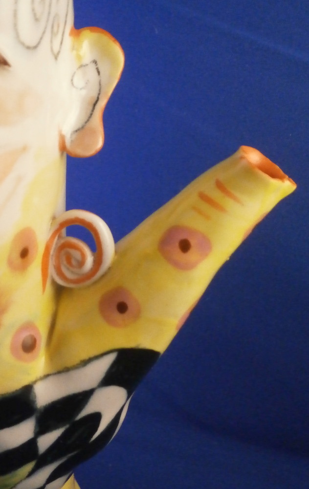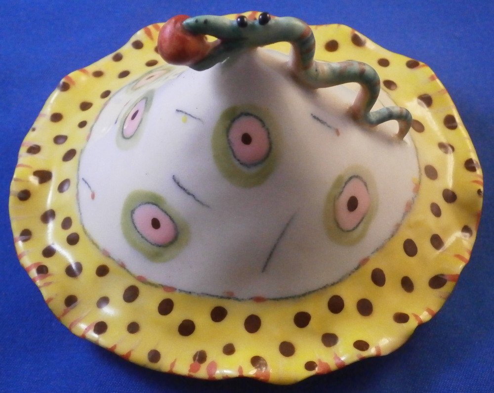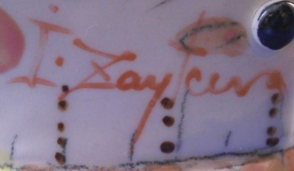 This is a really fun and rare treat - a figural porcelain stacked pot made by Russian American artist Irina Zaytceva in the later 20th century. Irina Zaytceva was born in Moscow and graduated from the Moscow Art Institute in 1982 with degree in book illustration but figured out that her true love was sculpting in porcelain. Who can blame her! :) Her pieces can be seen in museums in the United States as well as abroad like the Hermitage Museum in St. Petersburg, Russia. These are usually called stacked teapots though it could be a coffee pot and creamer or you can use it for anything esle you'd like. Display is off course the norm but you can water your flowers with it as well :) Both pieces are potted in her usual whimsical way with the faces to the front and the hand forming the handle. a snake as the finial on the lid and another to the front of the bigger pot. The bottom pot sits on four feet. I think she referred to these pieces as the snake charmers. The pieces are almost in the direction of folk art. Her pieces just make you smile everytime you look at them and these stacked ones are very ahrd to find! Definitely unlike anything else you'll come across. The set is in perfect condition. There is an area to the top edge of the bigger pot that look like some minor chips but they are from when she made it and not real damage. The bigger pot is signed on the back in orange I. Zaytceva and again underneath I. sZ. with a half moon or banana looking thing. The smaller pot is signed I.Z in orange in the back. The stacked set is about 14 inches tall,. The bottom bigger pot is 7.375 inches tall, about 7.75 inches from handle to spout and 3.75 inches deep. The smaller pot and its lid are 6.75 inches tall (including the ring that would sit inside the other pot) , 5.75 inches wide and 3.75 inches deep. Please email me for more information or other pictures.