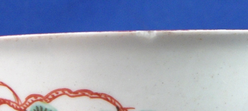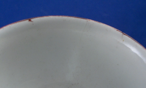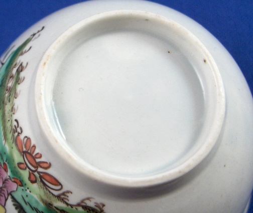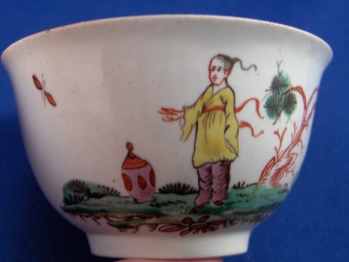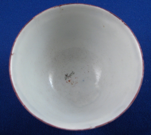 This is a rare cup made by William Reid of Liverpool in about 1758. I thought it was made by Chaffers but the newest research shows that he did in fact not make this type of porcelain. It was attributed to William Reid after excavation at that factory site! It is handpainted with a superb Chinoiserie scene of a lady in a landscape as well as orange/brown trim and a flower to the inside bottom. The colors are strong and the detail superb. The cup is in good condition but has a teeny chip to the top rim and a hairline plus the flower to the inside bottom is worn. The cup is unmarked which is the norm! The cup stands 1.625 inches tall and 2.875 inches in diameter. Please email me for more information or other pictures.