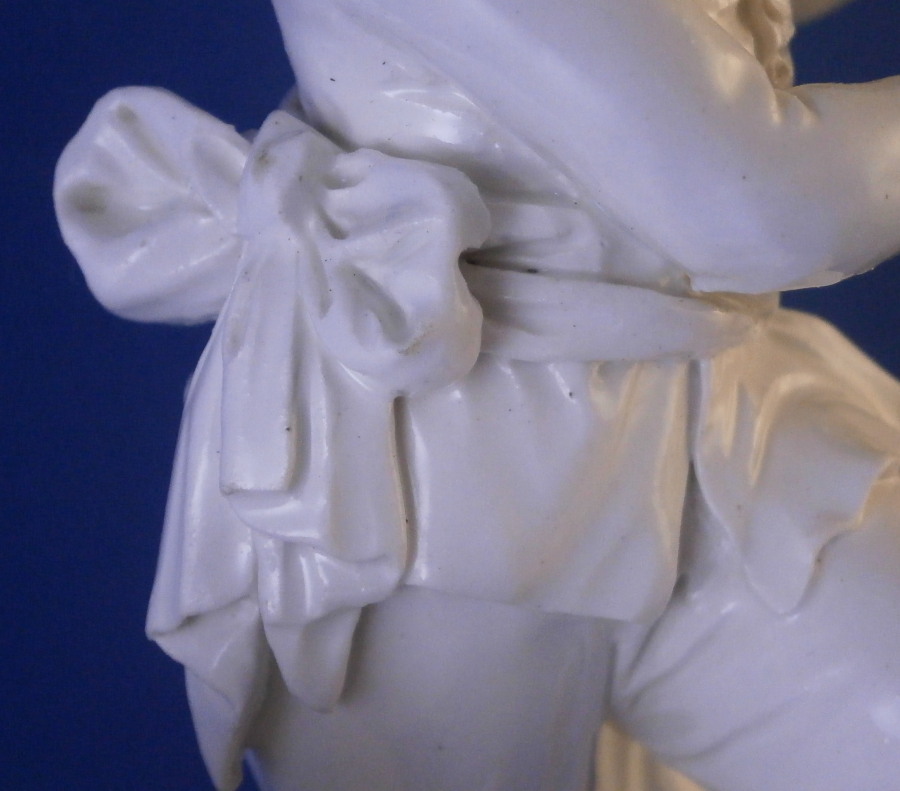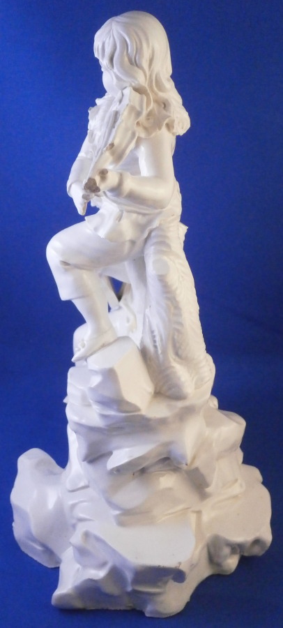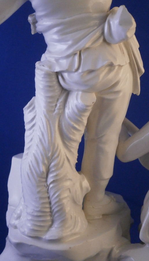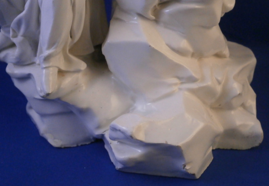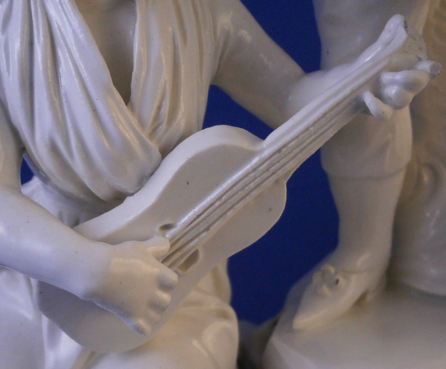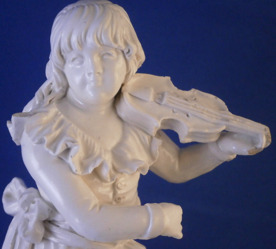 This is a figurine made in Italy in the 18th century probably by the Real Fabbrica Ferdinandea or Le Nove. It is made of some sort of creamware type ceramic with a glaze that has a bluish tint in the thickest areas where it has pooled during the firing. A really nice looking figure that is of and lady and gentleman musician stanidng on a rock base. She is playing a guitar while he is playing the violin. The piece is very detailed for this type of ware and looks to be an extremely high quality piece. Sadly I do not know a whole lot about these types of wares but it's certainly an early and good quality figurine! The piece is in good condition with some minor nibbles normal to this type of figurine, she has the guitar end missing and a nibble to her left index finger plus three fingers of her right hand are chipped. He has damage to four fingers of his right hand and the violin bow is missing and two chipped fingers on his left hand and the end of the violin is missing as well. It sounds worse than it is and it display beautifully! The figurine is not marked but that's normal and really does not help me make an ID at all :( The figurine is 9.25 inches tall, 5.5 inches wide and 4.5 inches deep. Please email me for more information or other pictures.