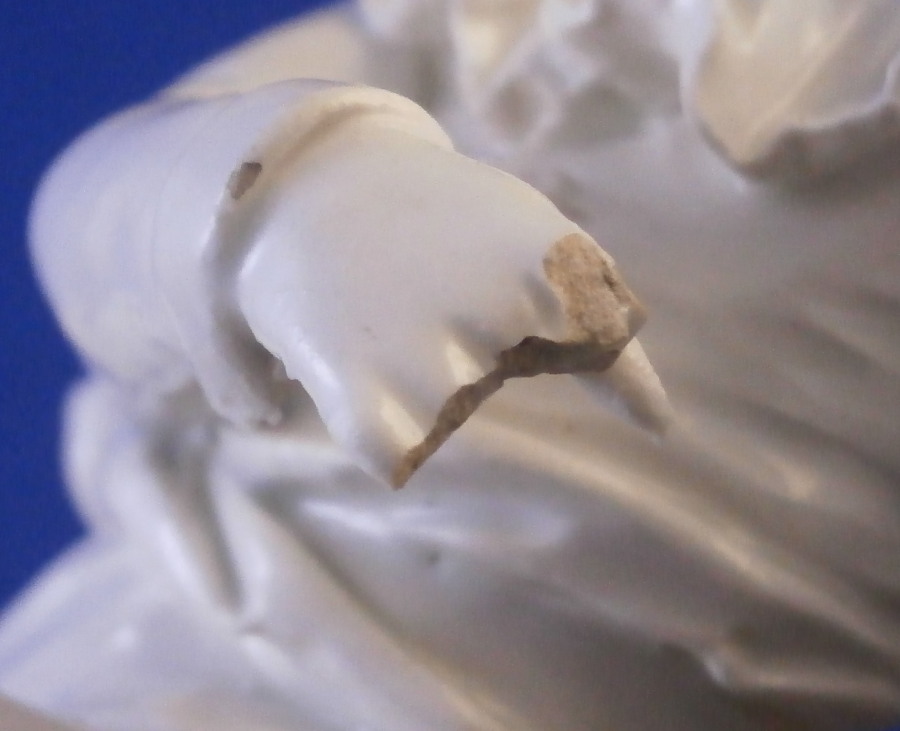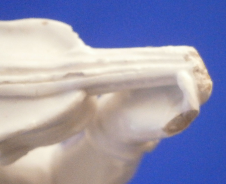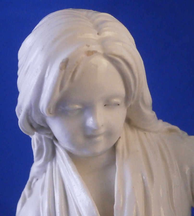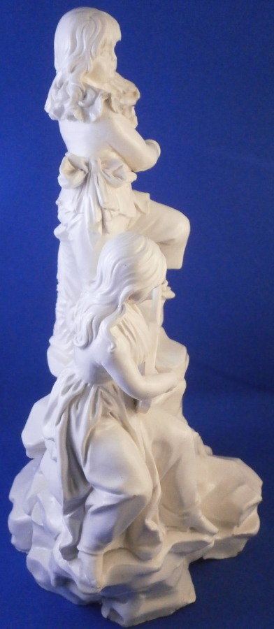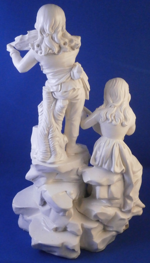 This is a figurine made in Italy in the 18th century probably by the Real Fabbrica Ferdinandea or Le Nove. It is made of some sort of creamware type ceramic with a glaze that has a bluish tint in the thickest areas where it has pooled during the firing. A really nice looking figure that is of and lady and gentleman musician stanidng on a rock base. She is playing a guitar while he is playing the violin. The piece is very detailed for this type of ware and looks to be an extremely high quality piece. Sadly I do not know a whole lot about these types of wares but it's certainly an early and good quality figurine! The piece is in good condition with some minor nibbles normal to this type of figurine, she has the guitar end missing and a nibble to her left index finger plus three fingers of her right hand are chipped. He has damage to four fingers of his right hand and the violin bow is missing and two chipped fingers on his left hand and the end of the violin is missing as well. It sounds worse than it is and it display beautifully! The figurine is not marked but that's normal and really does not help me make an ID at all :( The figurine is 9.25 inches tall, 5.5 inches wide and 4.5 inches deep. Please email me for more information or other pictures.