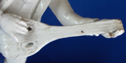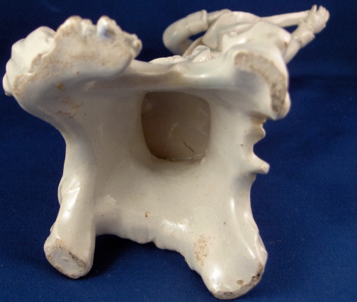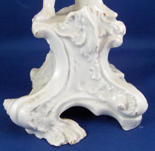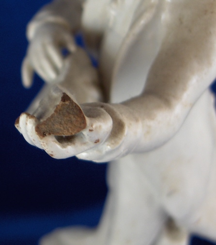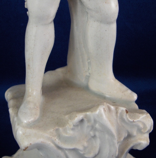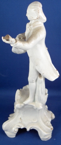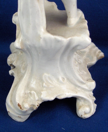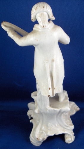 This is a figurine made in Italy in the 18th century probably by the Real Fabbrica Ferdinandea or Le Nove. It is made of earthenware with a glaze that has a bluish tint in the thickest areas where it has pooled during the firing. The figurine is of a gentleman playing a guitarlike instrument wearing a long coat with a fancy shirt underneath and pants that go over his knees. Typical attire of the times! The hairstyle of this figurine is typically Italian! He stands on a very fancy base with lots of fine detail to it. The piece is in good condition with the end guitar missing a piece, one finger chipped a little and some areas where the glaze is gone and the darkened eartherware colors shows through. All in all in very good condition considering this stuff is even more fragile than porcelain. The figurine is not marked but that's normal. It is 8.25 inches tall and the base is 3.375 inches wide and 3.25 inches deep. Please email me for more information or other pictures.