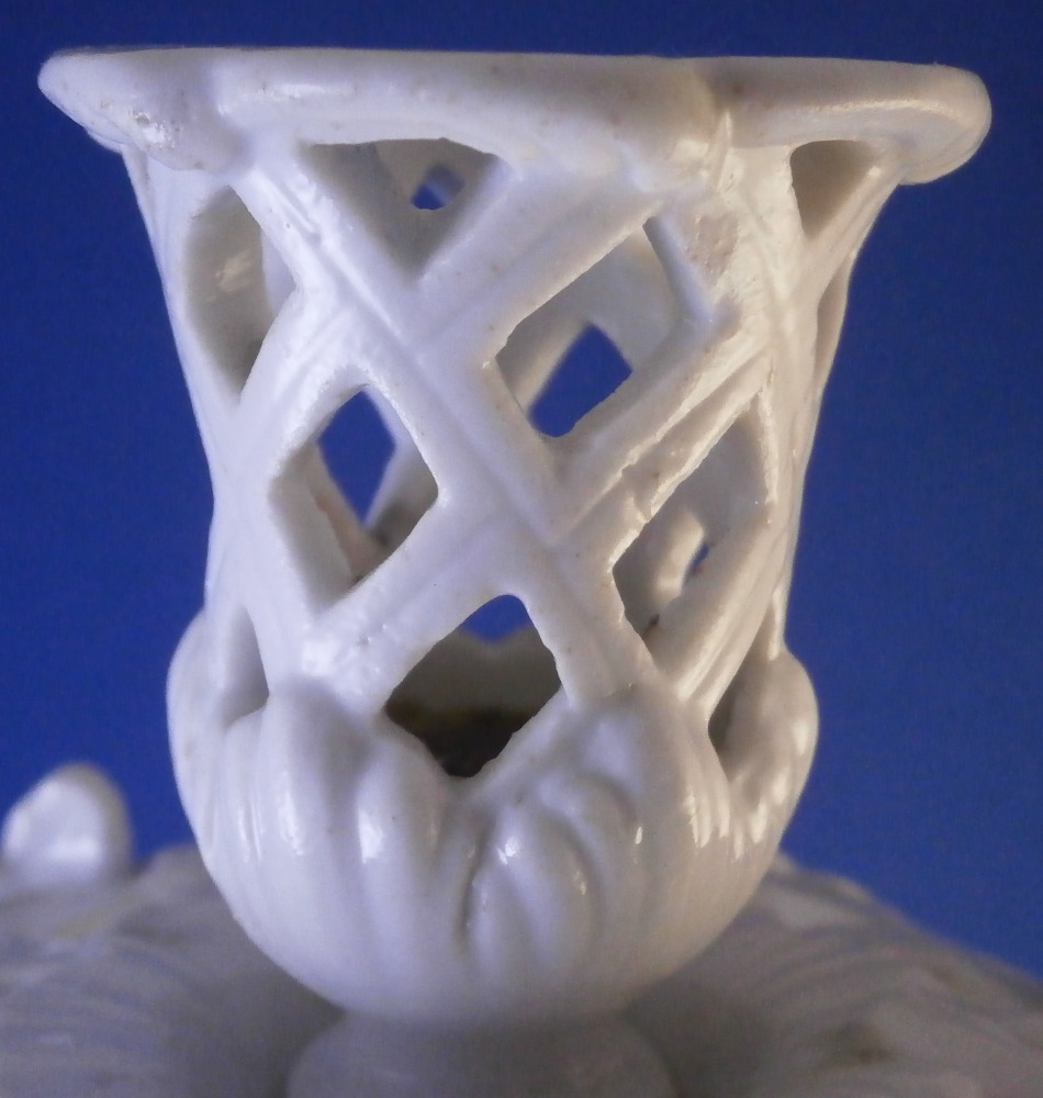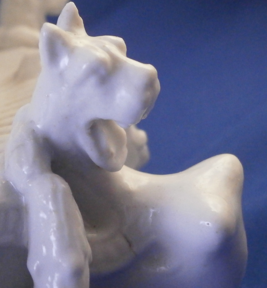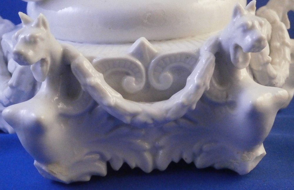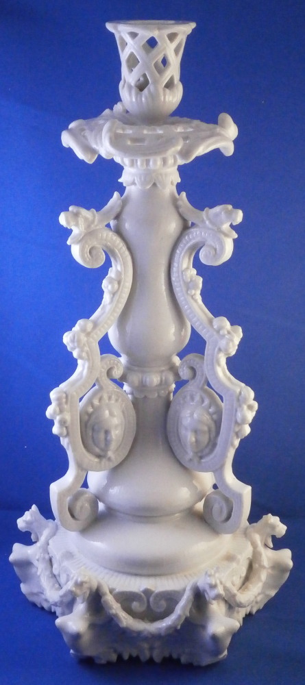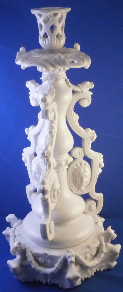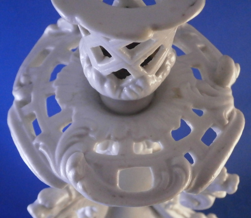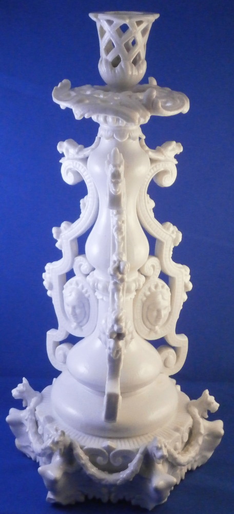 This is a really crazy candlestick I think was amde in Italy possibly Cozzi in the late 18th century. The paste is greyish and not entirely smooth so it is definitely not German or French and the Italians were the only ones crazy enough to make this Baroque inspired fun piece! The candleholder is made up of a reticulated cup to hold the candle up top, then a reticulated bobeche which I have never seen before and then the main body. They are held together with a pin and screws. The main body has wings jutting out decorated with fruit, a lady's face towards the bottom and these crazy lion ? heads on top. The base has leaf garland swags in between these busty gryphon type figures. It's hard to explain so have a look at the pictures! The piece is made of hard paste porcelain. The stick is in good condition with some issues. Surprisingly the top and the bobeche are fineas is the entire main body but the crazy gryphons type figures (they remind me of Scooby Doo) along the base have damage to them. Two have either an ear or both ears missing and all have the bttom part missing which likely had feet that the candlestick was standing on to raise it off the table. That is the only explanation I ahve for the shape and the holes on the udnerside near the damage. I assume one or two broke and then someone broke the rest to make it even. The way the breaks are and the shape of it it really is not obvious when the piece sits s superbly! It's jsut a crazy and fun piece to look at. Never seen anything The base is marked udnerneath with two crossing swords with a dot below taken from the top German maker but this was not amde by them! The entire candleholder is 13.5 inches tall with the base having a diameter of about 6.75 inches at the widest. No chance of this one tipping over! Please email me for more information or other pictures.