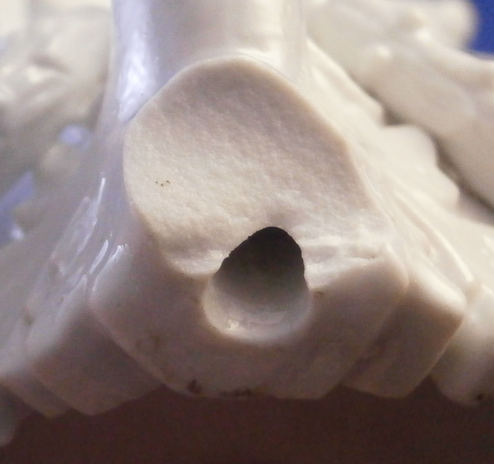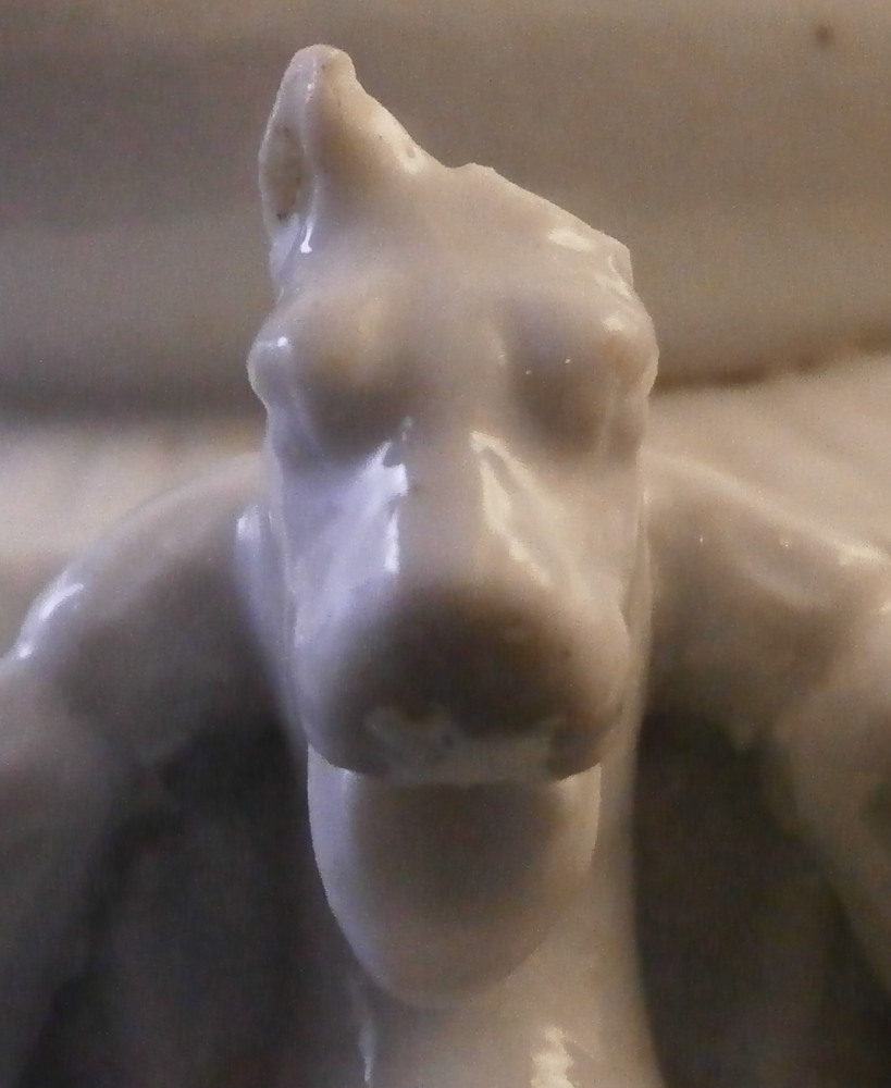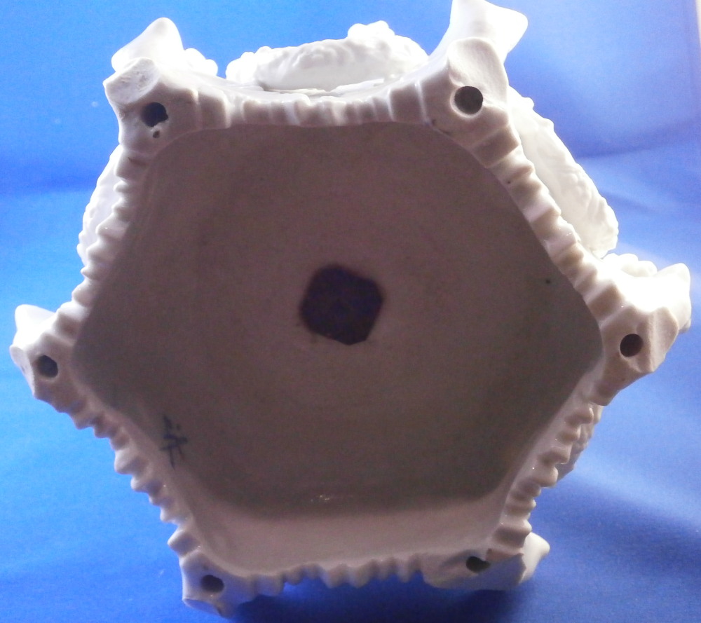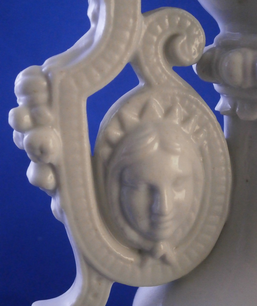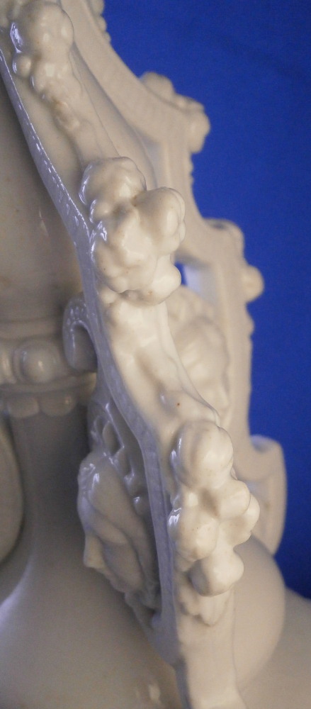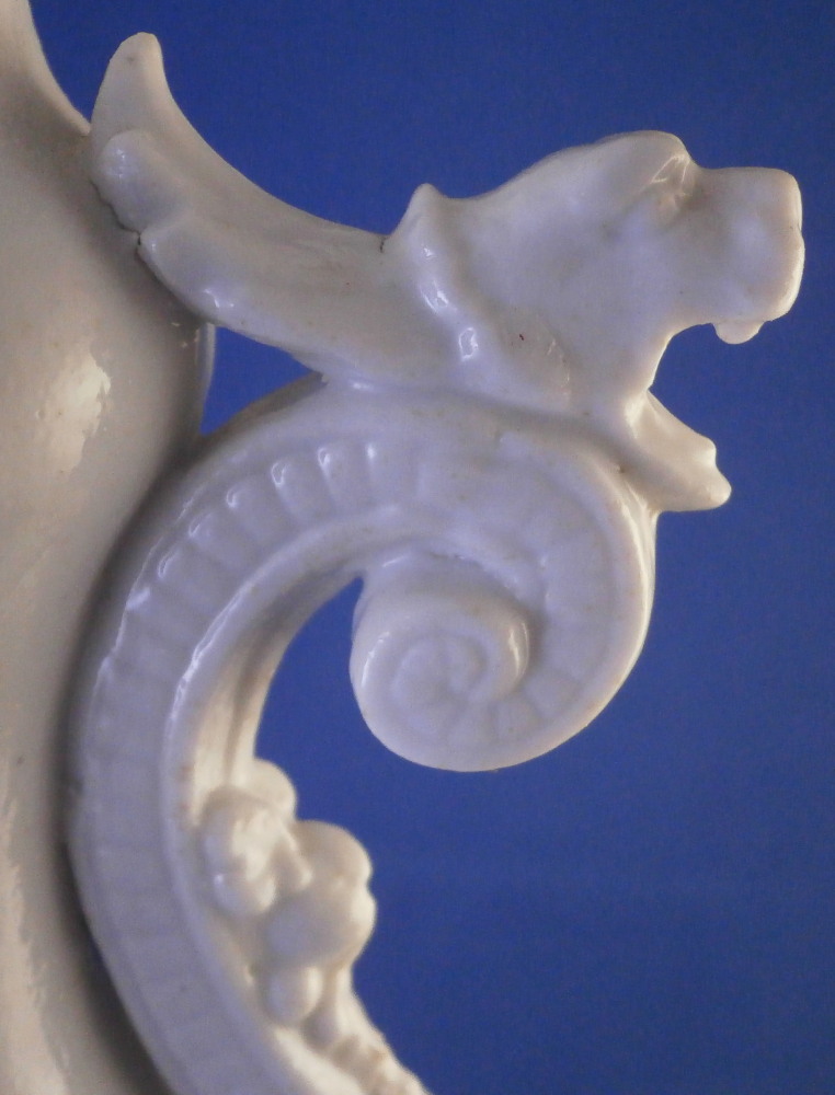 This is a really crazy candlestick I think was amde in Italy possibly Cozzi in the late 18th century. The paste is greyish and not entirely smooth so it is definitely not German or French and the Italians were the only ones crazy enough to make this Baroque inspired fun piece! The candleholder is made up of a reticulated cup to hold the candle up top, then a reticulated bobeche which I have never seen before and then the main body. They are held together with a pin and screws. The main body has wings jutting out decorated with fruit, a lady's face towards the bottom and these crazy lion ? heads on top. The base has leaf garland swags in between these busty gryphon type figures. It's hard to explain so have a look at the pictures! The piece is made of hard paste porcelain. The stick is in good condition with some issues. Surprisingly the top and the bobeche are fineas is the entire main body but the crazy gryphons type figures (they remind me of Scooby Doo) along the base have damage to them. Two have either an ear or both ears missing and all have the bttom part missing which likely had feet that the candlestick was standing on to raise it off the table. That is the only explanation I ahve for the shape and the holes on the udnerside near the damage. I assume one or two broke and then someone broke the rest to make it even. The way the breaks are and the shape of it it really is not obvious when the piece sits s superbly! It's jsut a crazy and fun piece to look at. Never seen anything The base is marked udnerneath with two crossing swords with a dot below taken from the top German maker but this was not amde by them! The entire candleholder is 13.5 inches tall with the base having a diameter of about 6.75 inches at the widest. No chance of this one tipping over! Please email me for more information or other pictures.