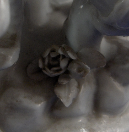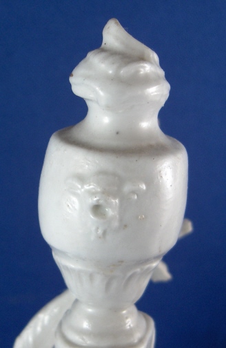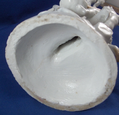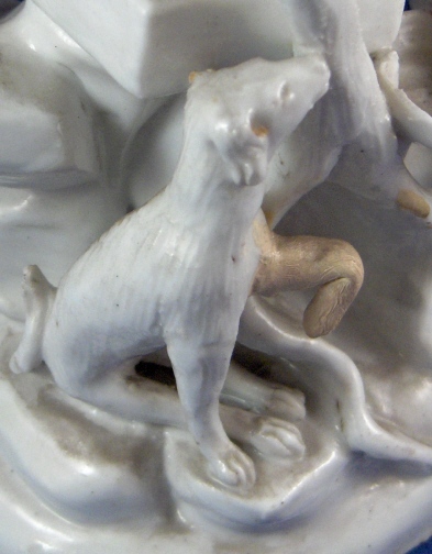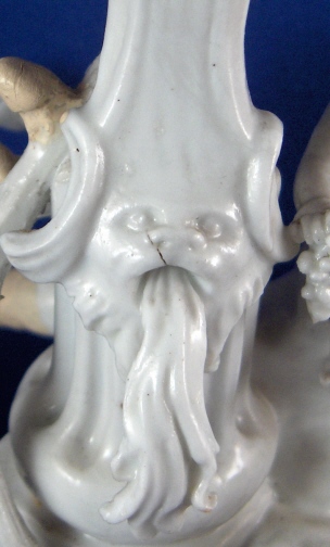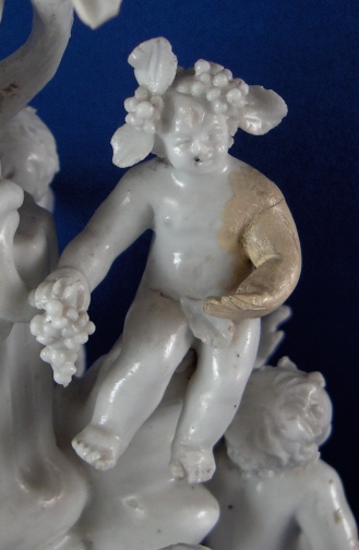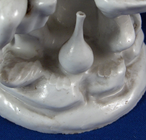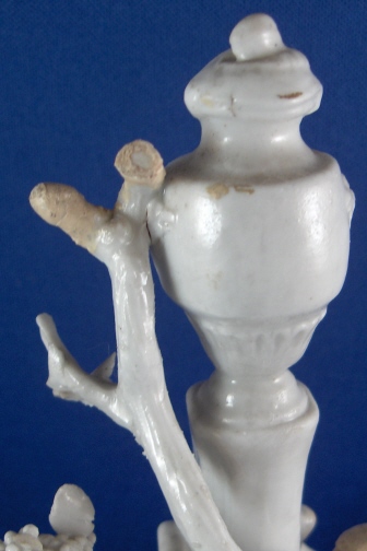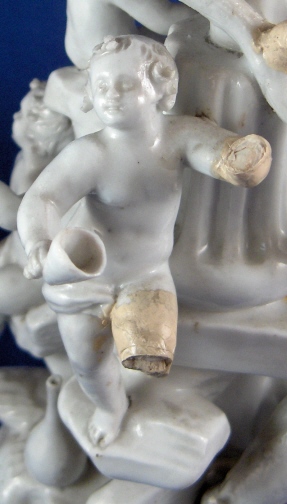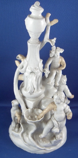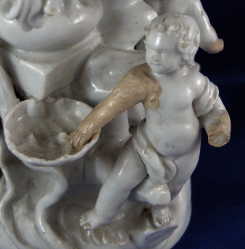 This is a figurine most likely made by Cozzi in about 1770. The greyish color of the hard paste as well as the glossy finish and it being undecorated all point to this superb maker. It is a small figurine that has lots going on. There are four figurines and one dog, a fountain and an urn at the top with a tree winding up the center. The figure is superbly modeled and will have a good spot in my collection! Sadly the piece is far from perfect but generally speaking it is amazing it is not more damaged. The basic piece is in great shape with the base and the entire center being intact. What did break were the limbs with one figurine missing the forearm and hand, another an arm with the hand, another a hand and an arm with hand, the dog a front leg, and the last figurine a piece of arm with hand and a leg. Some of this has been badly restored and some of that is missing again. The tree also has some damage but that was to be expected. But like I sad I am suprised how good a shape it is in seeing this damage. The figurine is not marked but that's normal. It is 8.5 inches tall and the base has a diameter of about 3.75 inches. Please email me for more information or other pictures.