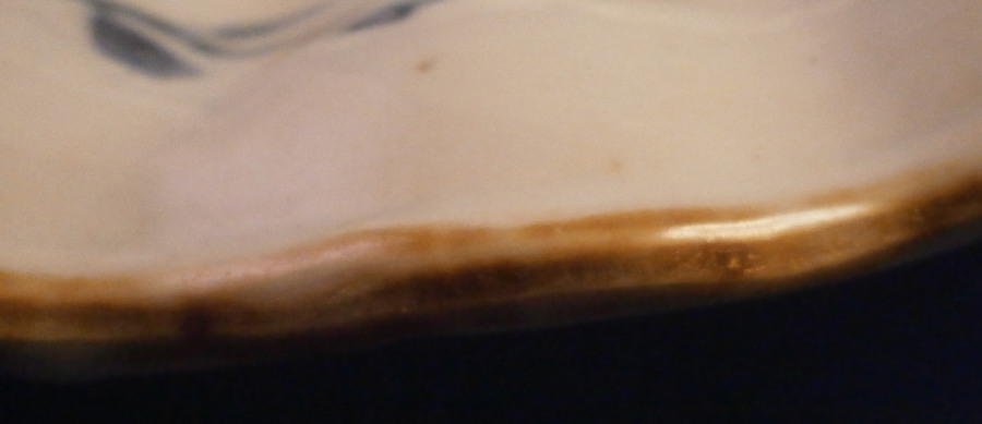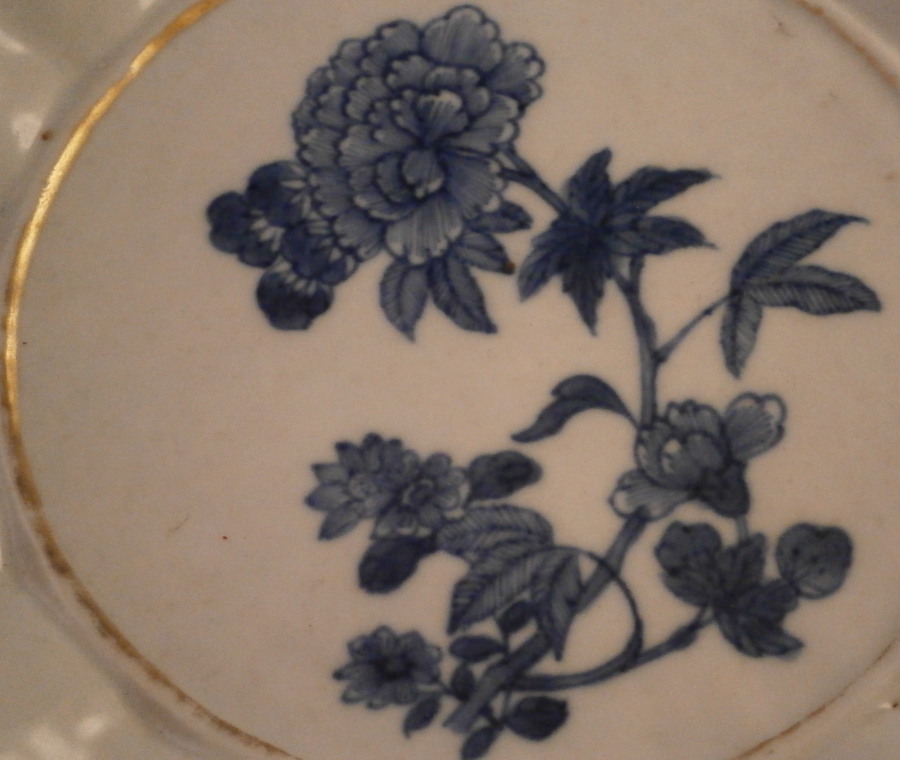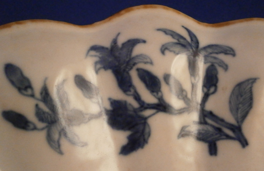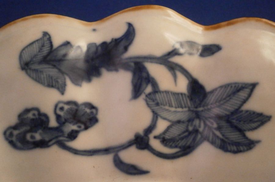This is a really nice lobed bowl dish made either in Japan during the Edo period or China during the Qianlong period. Had two experts tell me two different things so at least I am not the only one at a loss :) Either way it certainly dates from the mid 18th century due to the added gilding on it which was common practise then. I know very little about this stuff but really liked this piece! It has a great lobed shape to it and is nicely hand painted with under glaze blue flowers - a larger one in the center, four bigger ones along the rim with four smaller single flowers in between. Gold trim around the well edge and and brownish trim along the edge that also had gilding over it added but most of that has worn off again since. I think this style of decoration is known as Sometsuke in Japan not sure if it would ahve a name in China. Maybe someone out there knows more and can explain some of this stuff to me. I'd love to learn more about it. The plate is in great condition with just a small flat chip to the underside near the edge. it is round in shape and might have been a popped glaze bubble. There are numerous manufacturing flaws to the porcelain but no true damage. The dish is 1.625 inches tall and about 9.5 inches in diameter. It is unmarked which is fairly normal. Please email me for more information or other pictures.