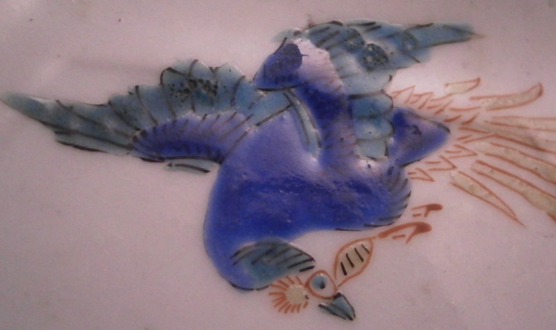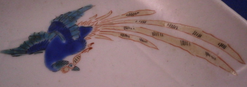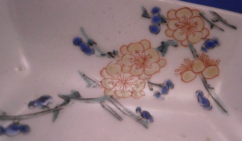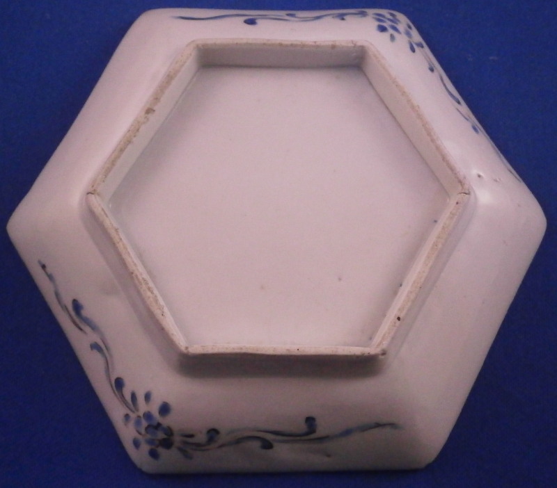 This is a a really nice hexagonal shallow bowl dish made in Japan in the 17th century. Likely from the Arita area so they are today known as Arita ware or Hizen ware though this is used more for blue and white pieces. The wares with added color are known as Imari were with Kakiemon as a sub group. Kutani wares also come from this area but are different yet again. This little dish is a really nice early piece dating around 1680 so before European porcelain was around which is what I usually collect. The piece is hand painted in the Kakiemon style with an early phoenix bird / ho-o flying above a flowering chrysanthemum branch I believe. The glaze is bluish which is typical of this period. This dish just screams quality - the porcelain is superb and the painter was so confident that he only put two small opposing decoration on it. The udnerside has two blue designs to it as shown. It is the perfect piece to show off both the quality of the porcelain and the decoration. The saucer is in perfect condition for the age. There are numerous manufacturing flaws to the porcelain but no true damage. The dish is 1 inch tall and about 5 inches at the widest point. It is unmarked which is normal. Please email me for more information or other pictures.