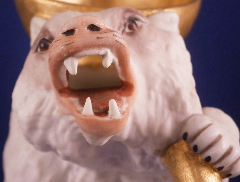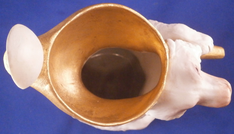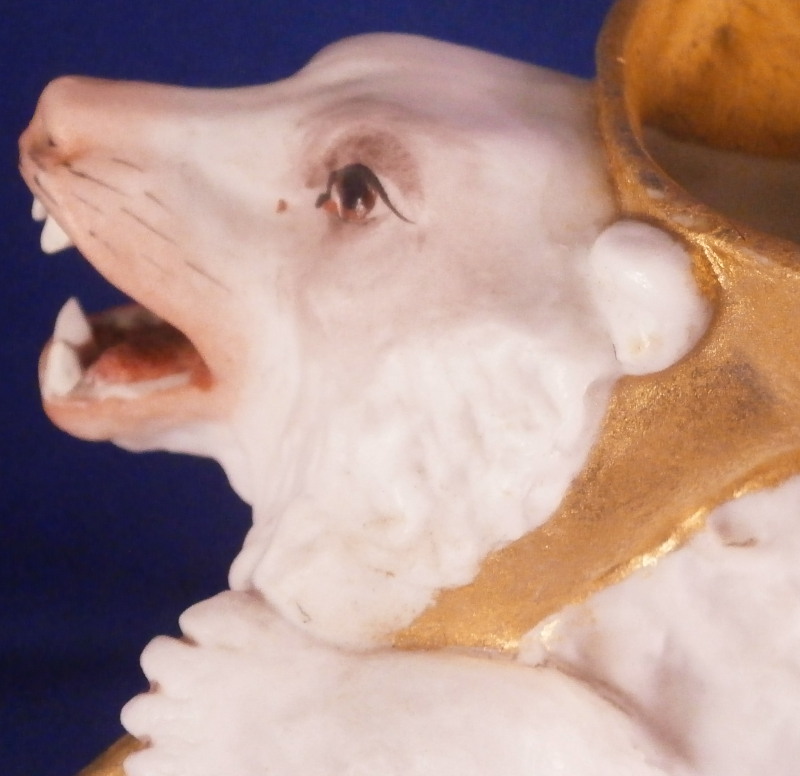 This is a a really fun figural pitcher / creamer / milk jug made by Jean Gille in the mid 19th century. Jean Gille was for me the best and one of the earliest makers of these unglazed pieces and he had a superb imagination and talent. The quality oif his wares is always top notch and this is another good example of his work. The attention to detail on this creamer is amazing - probably the most fun creamer I have seen in a long time. The piece is in the shape of a wear with his mouth open which forms the spout. The bear is holding a golden funnel of sorts which is held up with a white spoon in the back. The top opening is in the bottom of the golden colored funnel. This would actually be usable and still fairly easy to clean. The bear is mostly white except for the face and paws. The piece is about 7.75 inches tall including the white spoon, 3 inches wide and 5 inches deep. In great condition with use marks and some wear to the gilding but otherwise perfect. The piece displays very nicely. It is marked with the raised JG on an oval pad mark in blue as shown. Please email me for more information or other pictures.