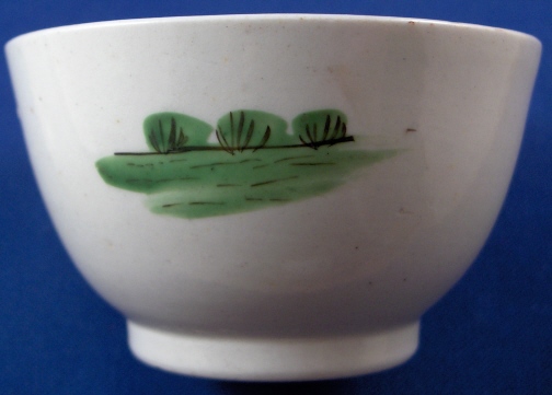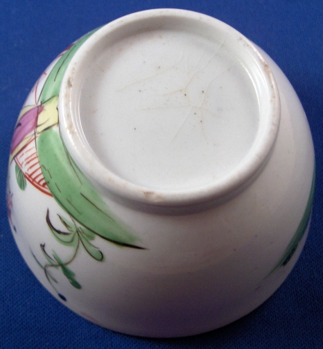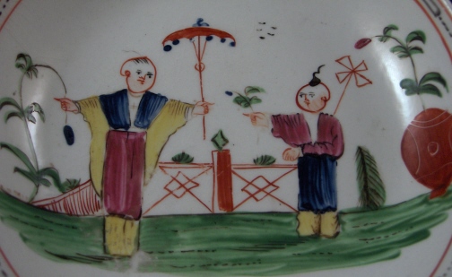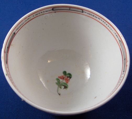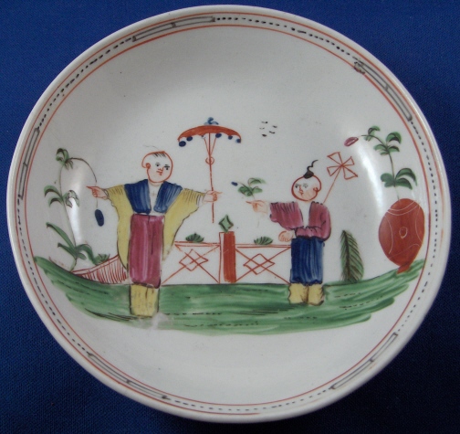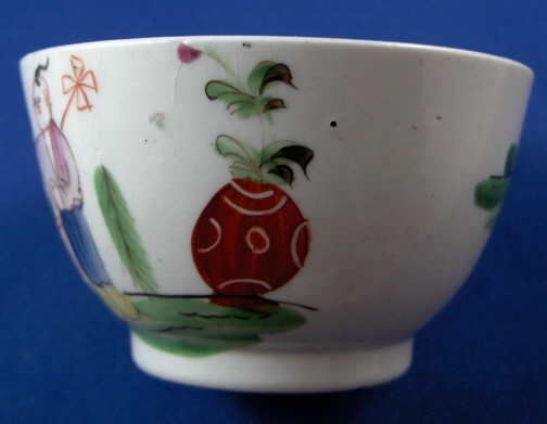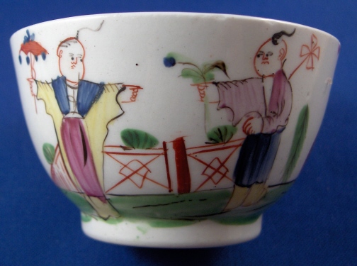 This is a nice cup and saucer made by an unknown maker in about 1780. It is handpainted with a pattern known as pattern 20 on New Hall pieces but these are not New Hall and the design is slightly different with the umbrella being in the other hand, etc. Might be made by Keeling but I am not totally sure. The cup and saucer are handpainted with a superb Chinoiserie scene of two figures with one holding an umbrella with a vase on the right side and a fence (?) in the background. The colors are strong and the detail superb which makes this one elegant English set! Both pieces are in good condition with a bit of wear on the sacuer by the left figures feet and a little bit of crazing to the underside of both pieces to the glaze. The saucer has a tight rim hairline which is hard to find! The set is unmarked which is very common on English porcelain of this period. The cup is 1.875 inches tall and 3.125 inches in diameter. The saucer is 1.25 inches tall and 4.875 inches in diameter. Please email me for more information or other pictures.