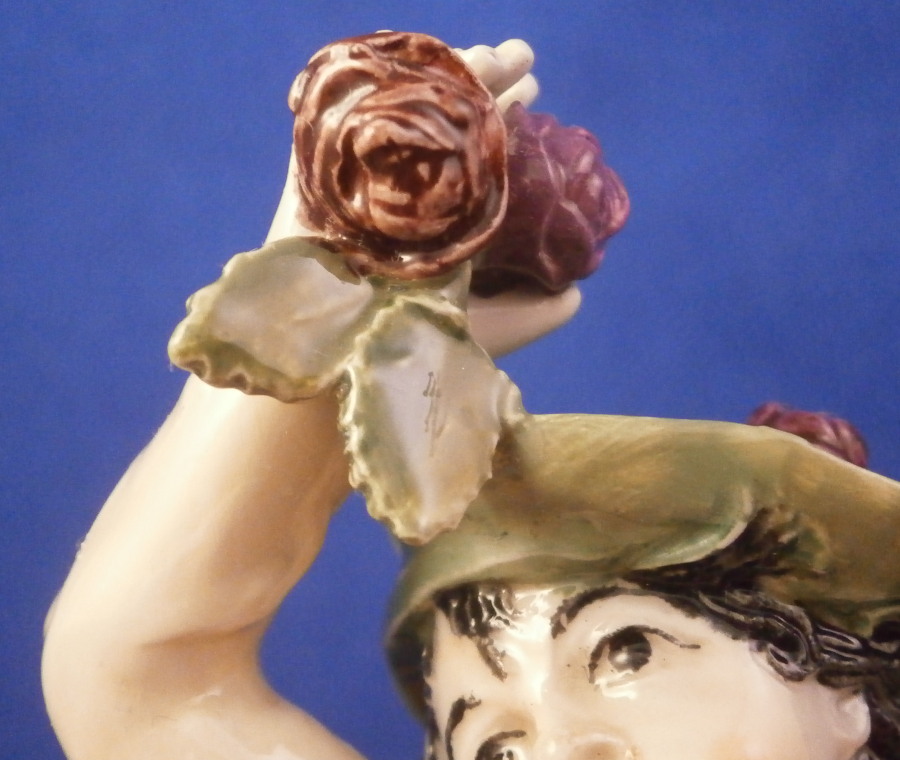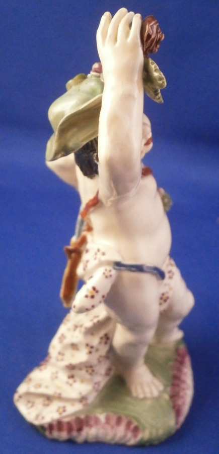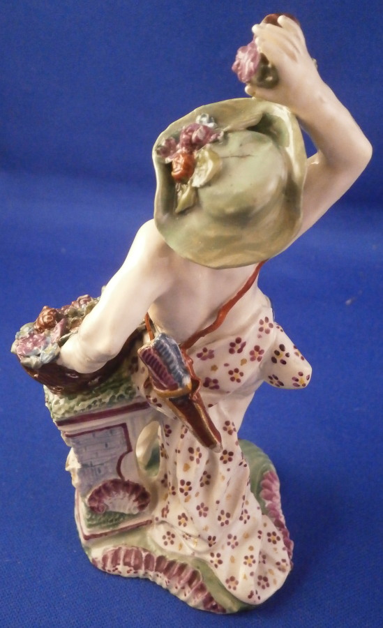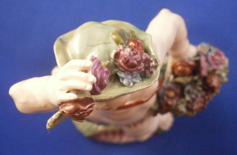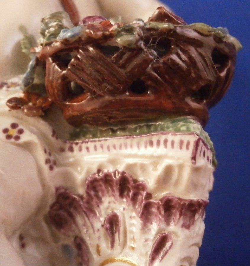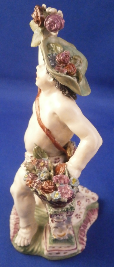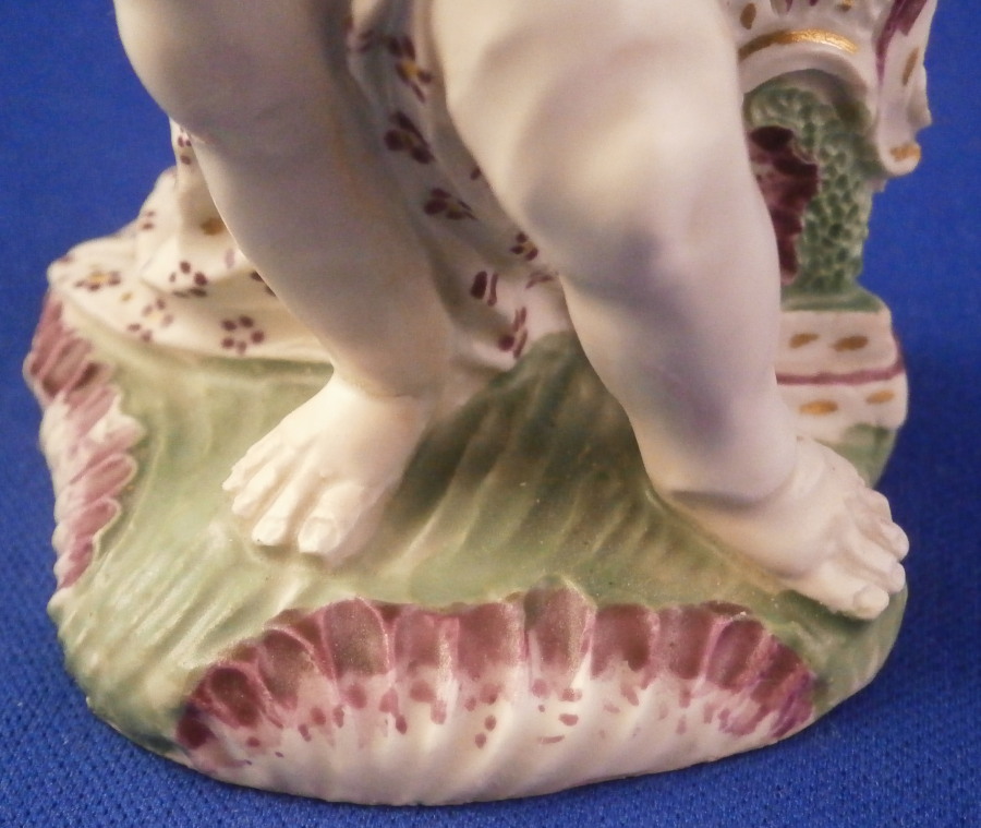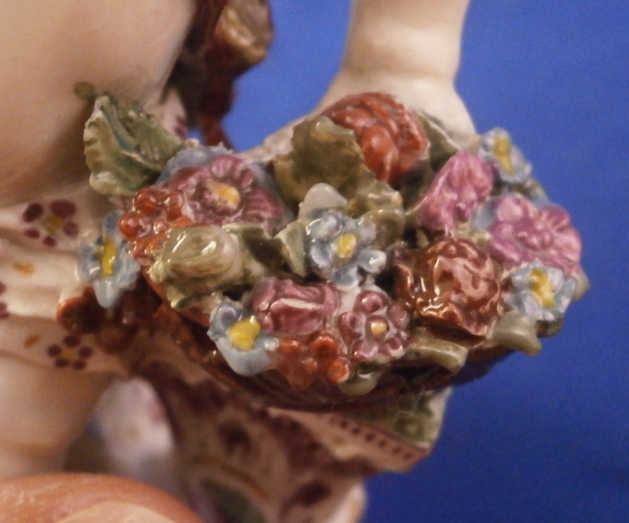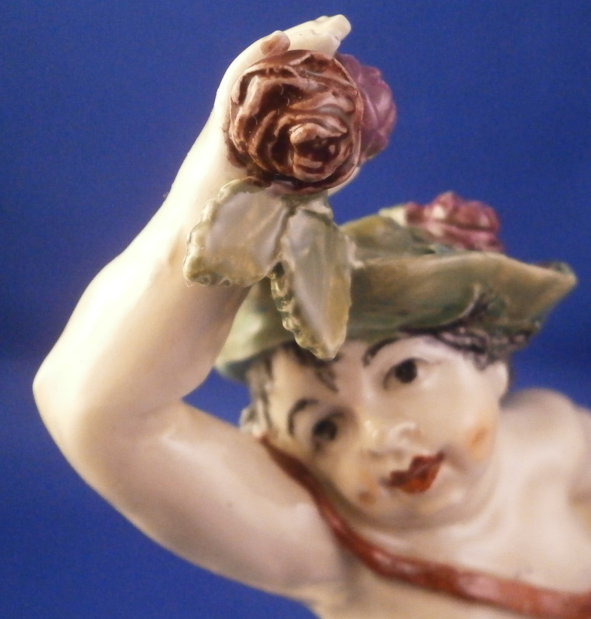 This is a very rare figurine made made by Kelsterbach in the 18th century - probably before 1765. This is a very hard to find maker - it is my first piece by them. The factory was founded as a faience factory in 1758 b Wilhelm Cron and Johann Christian Frede. It was taken over by Landgrave Ludwig VIII von Hessen Darmstadt in 1761. Porcelain was made here that same year but only until 1768. Production of porcelain was resumed in 1789 until about 1802. The figure is of a putto wearing a hat holding some flowers in the hand above his head with a basket filled with flowers on a fancy base next to him. Interesting early base with puce trim and green to the top. The figurine is not marked underneath which is typical for the early period. It is 4.875 inches tall,2.375 inches wide and 2.25 deep. The figure displays perfectly but has had work done to it. How much is impossible to tell as it was done to the highest caliber! The upper entire arm and flowers have a non porcelain feel to it created by restoration as does the other arm, part of the basket, upper body, hat and head. That does not mean it was all restored but it was covered by a coating to make it all look perfect. The rarity and the fact that it displays perfectly make up for this short coming in my book! Please email me for more information or photos.