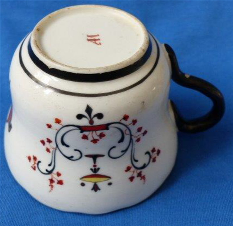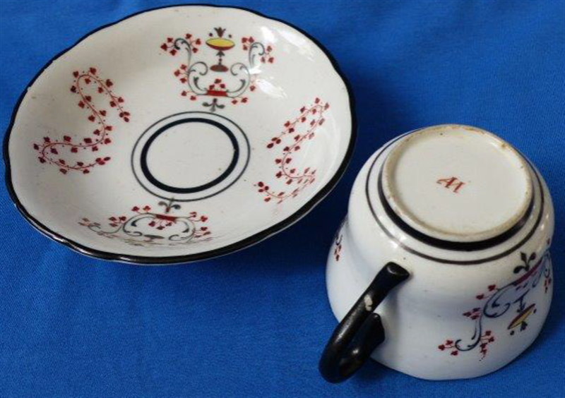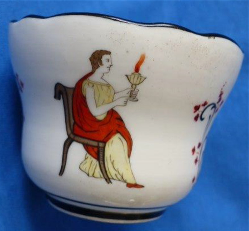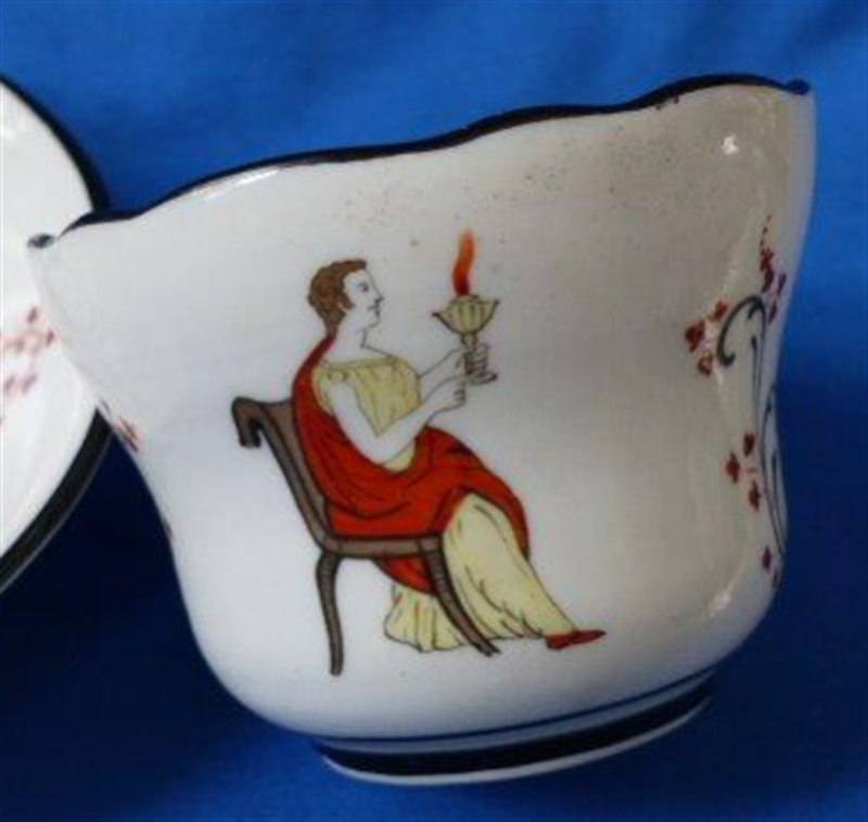 This is a rare cup and saucer made by the Miklaschevski factory in Kiev in the mid 19th century. The factory was considered the most important in Southern Russia in late 19th century but it only seemed to have operated from 1851 until 1862 so a rather short period. Nonetheless they made some very nice pieces here. The cup and saucer are hand painted with some sort of leaf garland design with urns as well as a lady sitting in a chair with a torch in her hand. Black trim to the edges. An interesting design different than any other I have come across though the quality of the painting isn't the best. Possibly a late example but I am unsure. Both pieces are in superb condition with some black firing spots. They are marked underneath with a red mark as shown. The cup is 2.375 inches tall and 3.5 inches in diameter. The saucer is 1.5 inches tall and 5.5 inches in diameter. Please email me for more information or other pictures.