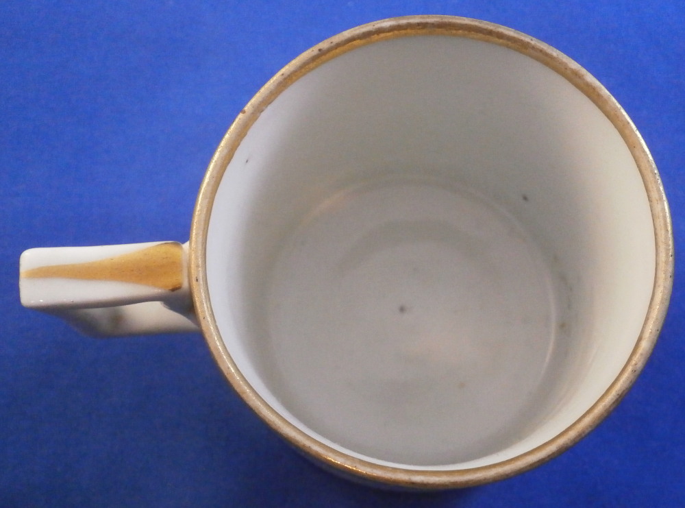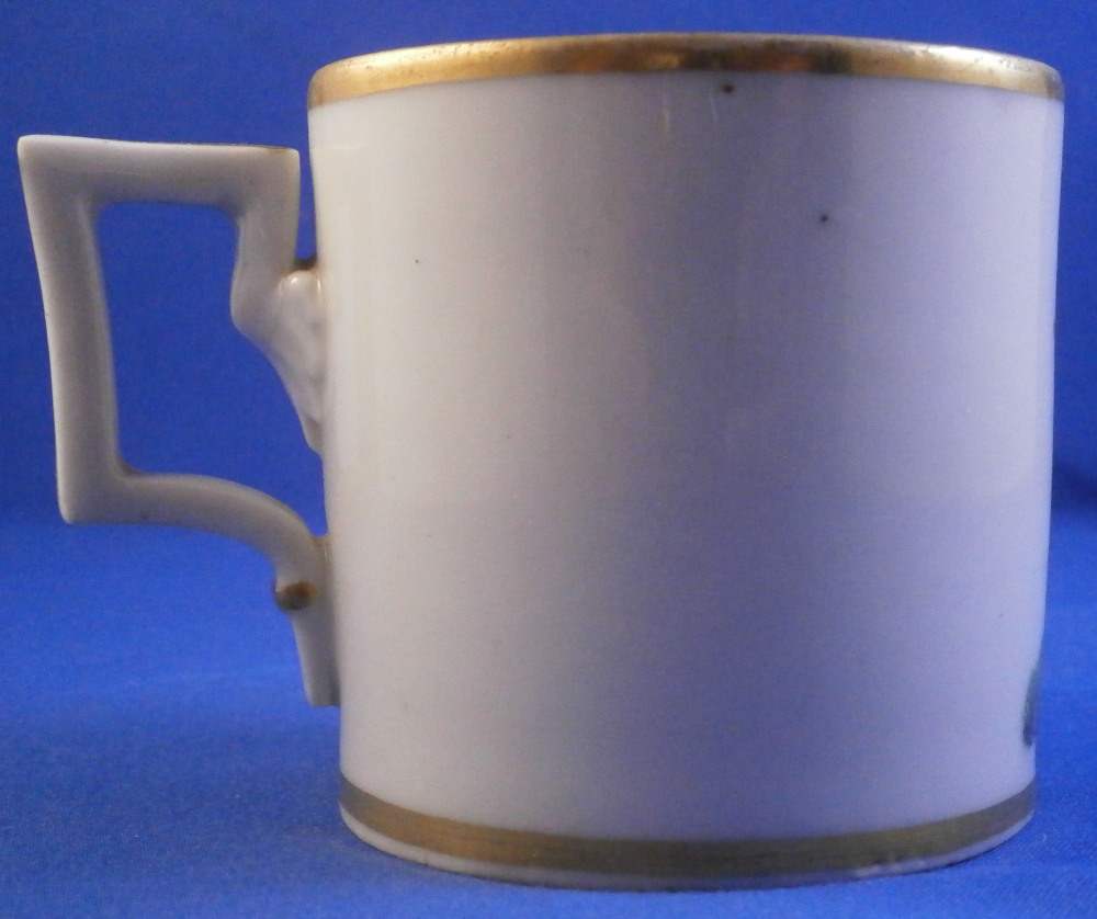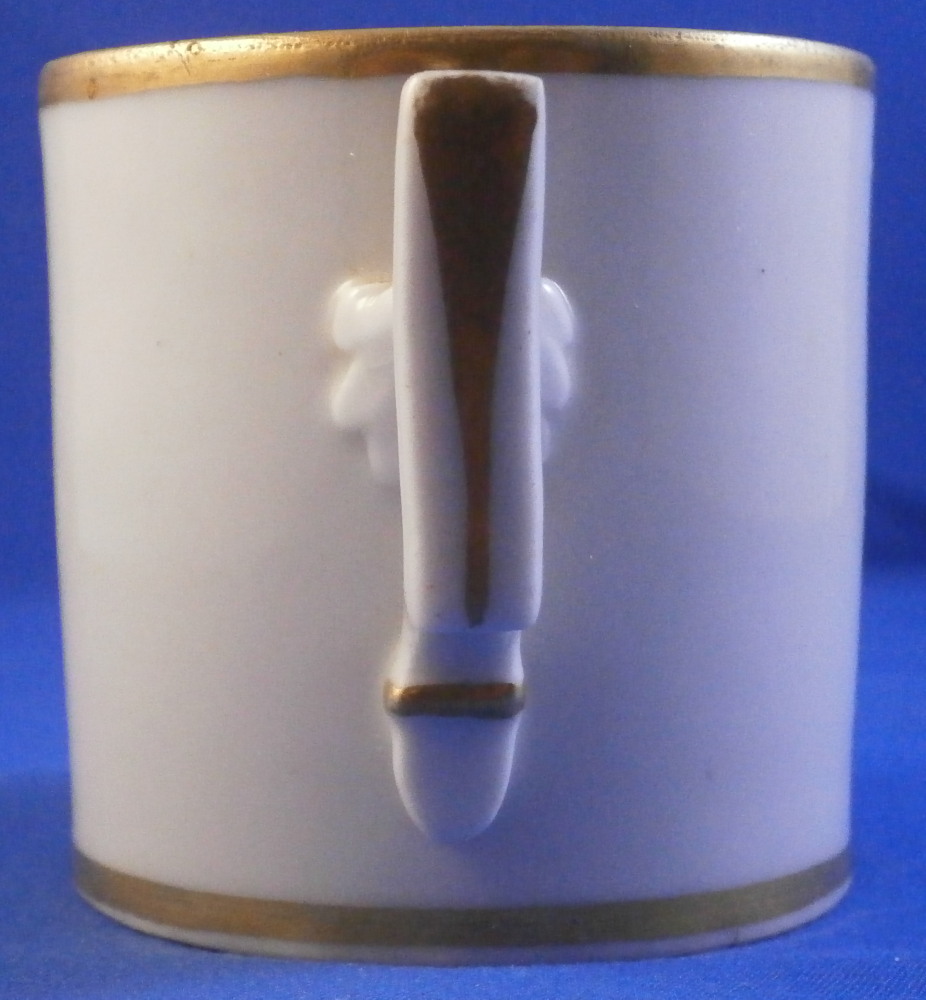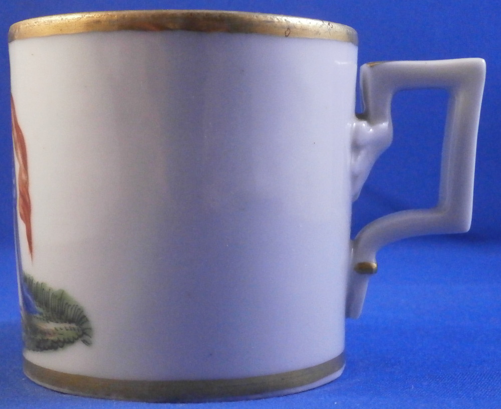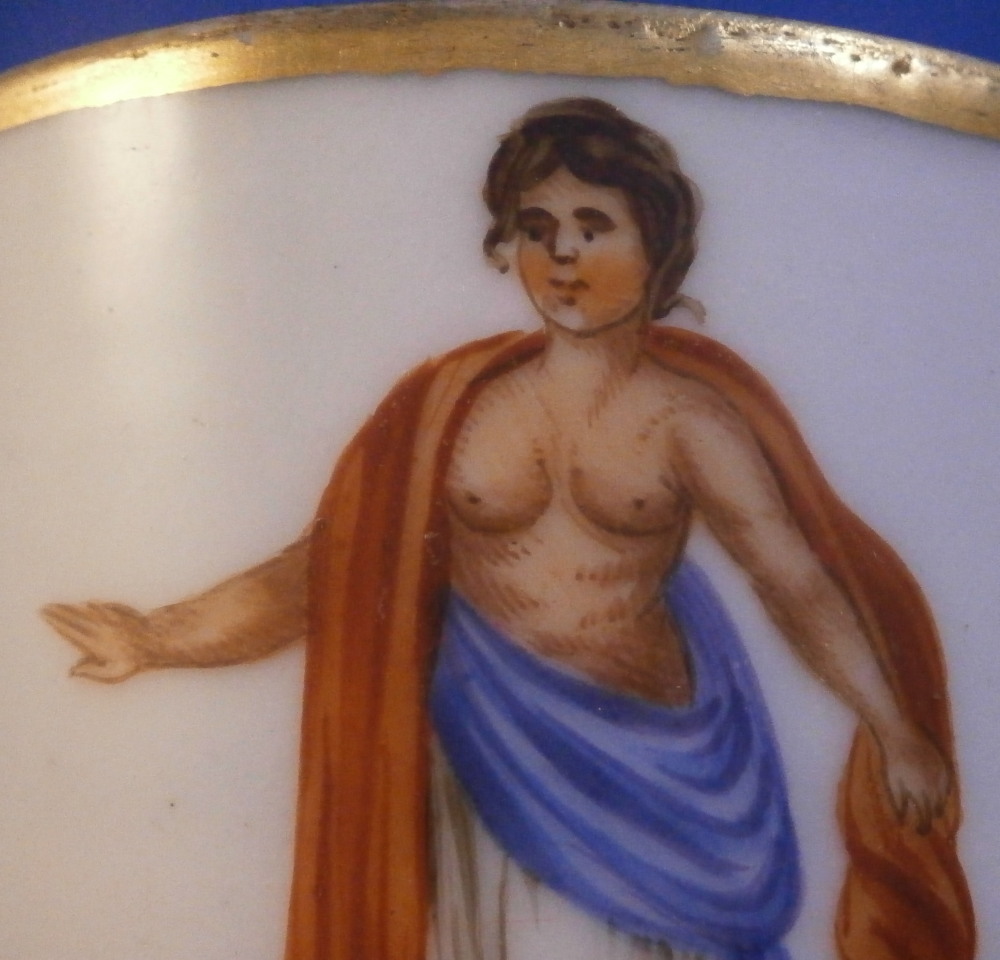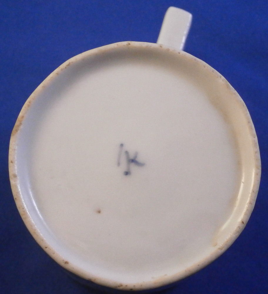 This is a cup made by Klösterle in the 18th century. I mainly bought it because it has a mark I had not seen outside of books and thought it would be a perfect example for the site but it is also a nicely done cup! Typical shape for the later 18th century with the square handle it has a hand pained scene to the front of a semi nude lady in a little landscape. She is wearing a white skirt with a blue cloth around the middle section and a red cloth hanging over her should leaving her breasts exposed. Gold trim to the bottom and top edge as well as the handle. The piece is just under 2.375 inches tall and 2.375 inches in diameter. It is marked with the under glaze blue letter K with a line next to it as shown. The cup is in great condition with a bit of wear to the gilding but it displays perfectly. Please email me for more information or photos.