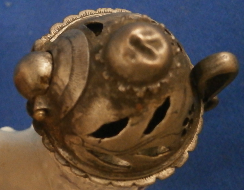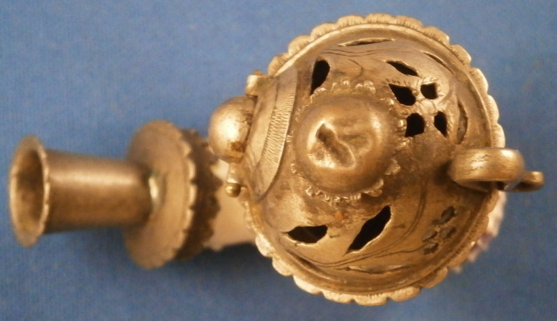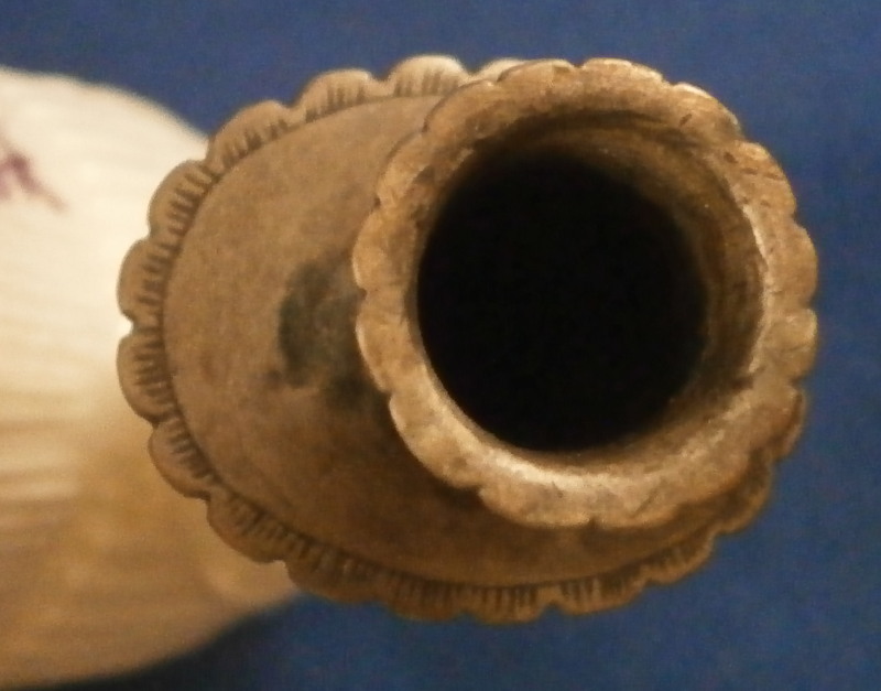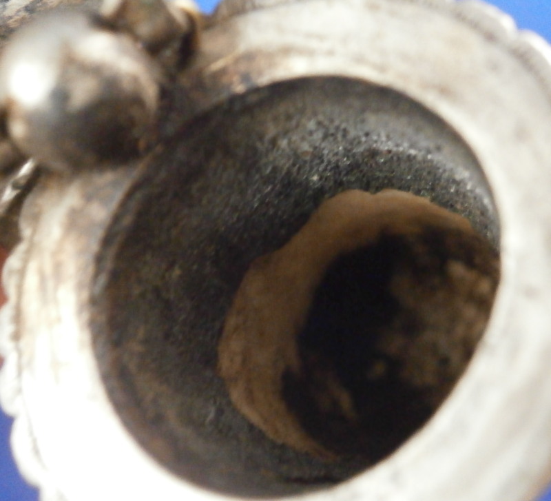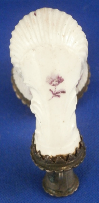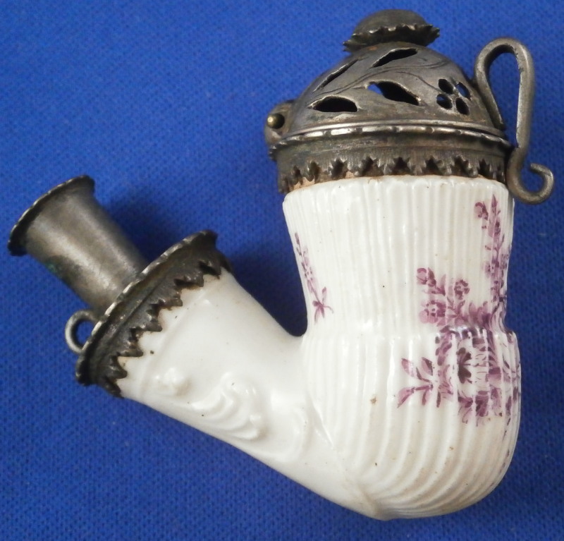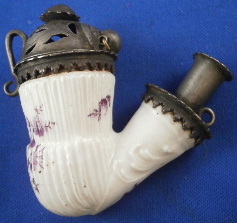 This is an early and quite nice pipe bowl made in the Thuringia region of Germany - most likely by Kloster Veilsdorf in the late 18th century but also bears resemblance to a pipe by the factory of Kassel which is even rarer. Kloster-Veilsdorf was the most important Thuringian factory of the 18th century and they made pipe bowls though I could not find this exact version anywhere. Closter Veilsdorf was founded in 1760 by Prince von Hildburghausen with the help of the arcanist Meyer. In 1795 the factory went to the Duke of Sachsen Altenburg who sold it to the Greiner family who owned most of the other makers in this region by then. The pipe has a very elegant shape to it, has the the typical ribbed design of this region and is hand painted with a nice puce floral arrangement to the front as well as three smaller flowers. The metal mounts are superb with a floral design cut into the lid - one of the nicest I have come across over the years. The piece is unmarked which is common on pipes. It is in great condition with a little wear to the flowers and the top of the lid has some small dents to it though it kind of looks like part of the design. The piece is about 2.25 inches tall, 1.125 inches in diameter and 2.375 inches deep. Please e-mail me for more information or photos.