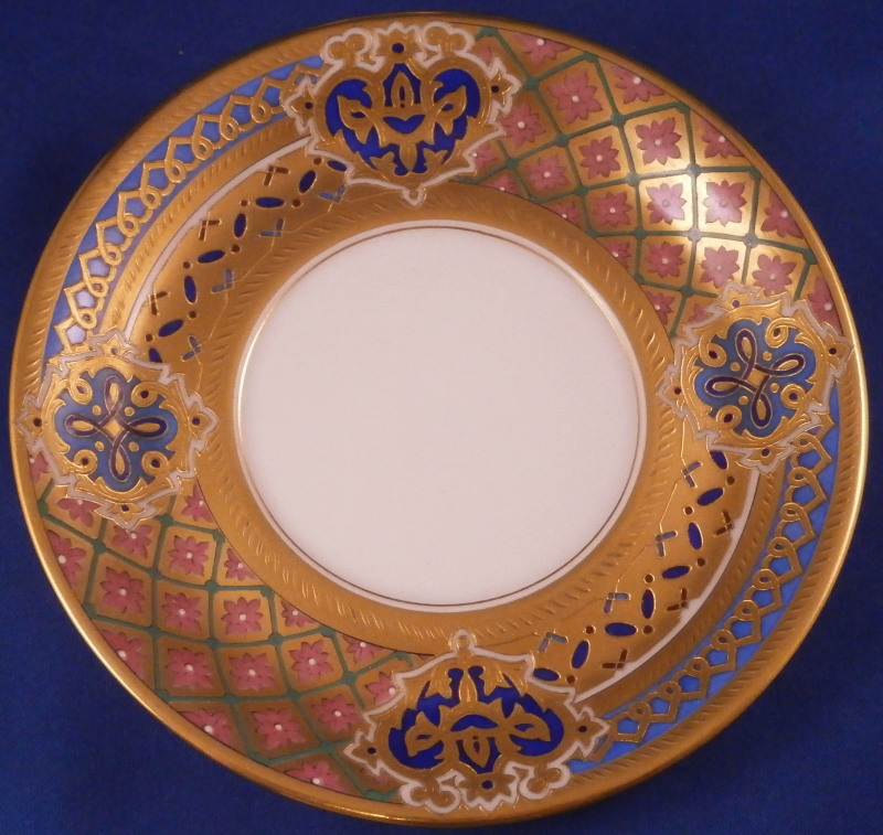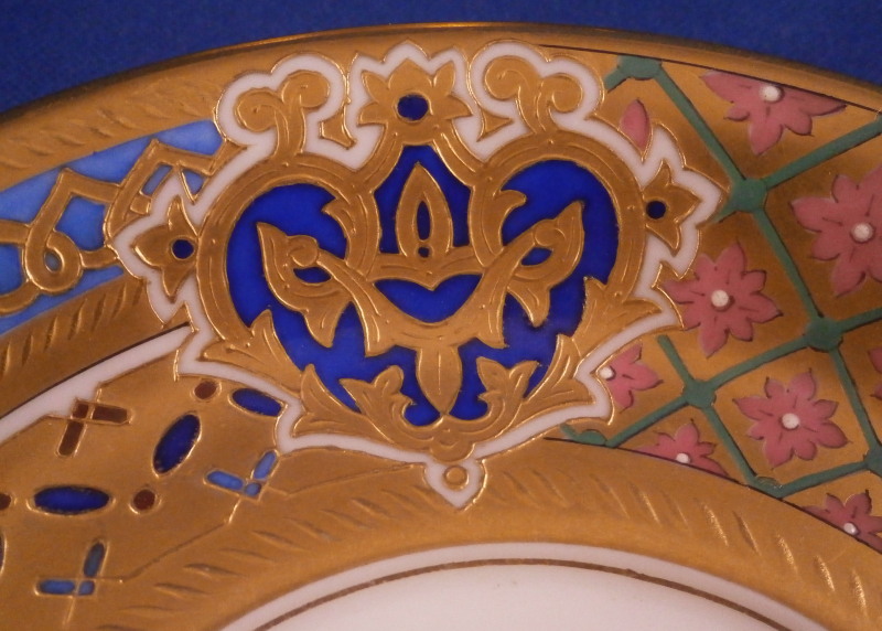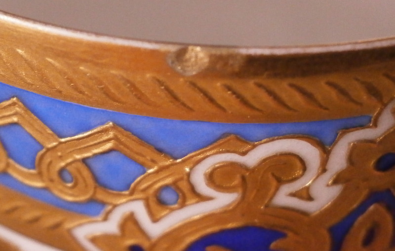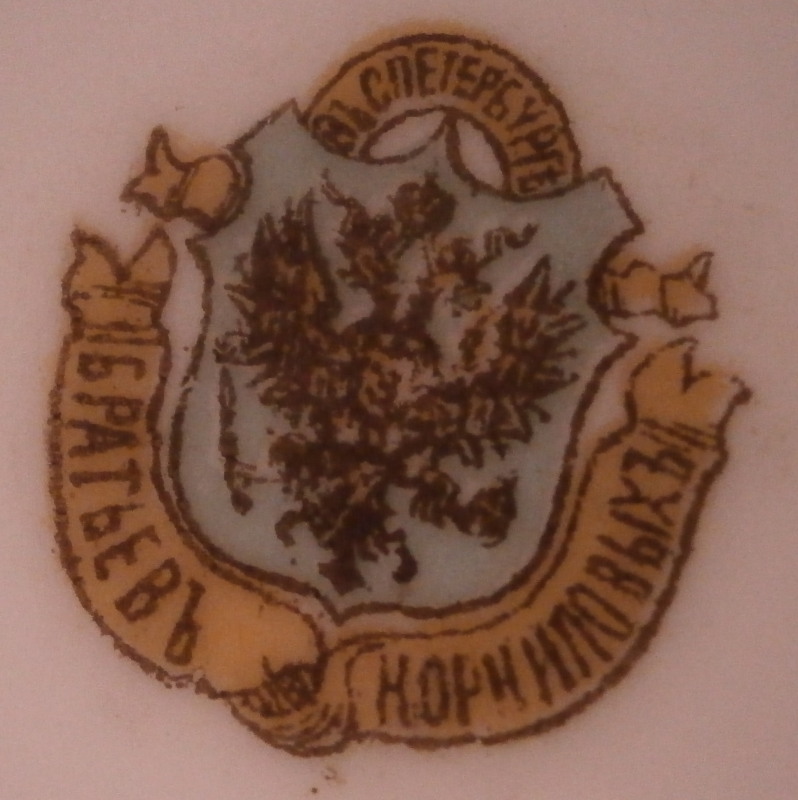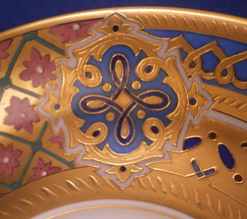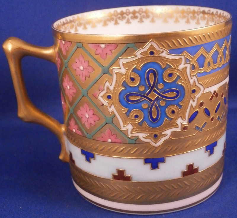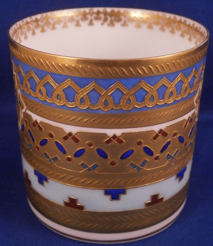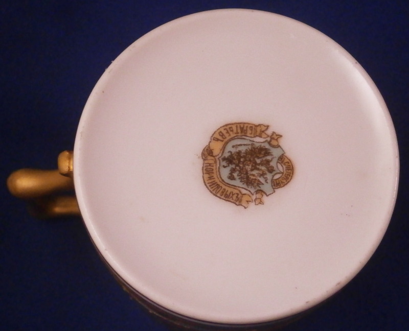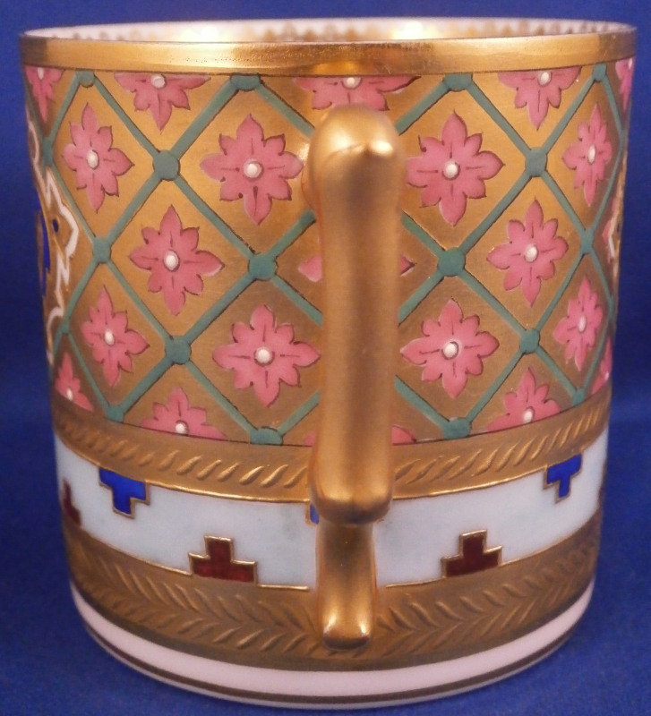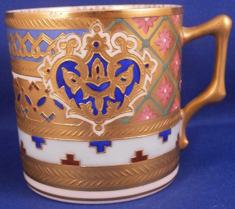 This is an amazing cup and saucer made by Korniloff in the late 19th century. Not sure if this would be referred to as Gothic influenced like the famous Gothic Service of the Imperial factory at St. Petersburg or more meant to simulate cloisonné enameling but it is definitely a traditional Russian design. Either way the set is superbly hand painted with a colorful design including some raised gilding as well as two different designs - one with pink flowers with a raised enamel dot in the center and the other a light blue ground and gold design over a colorful faux enamel design with two different scroll designs in between. Hard to describe it so have a look at the pictures to get the real idea. The cup has the same type of design with another motif on a light blue ground along the bottom. Nice fancy gold trim to the inside rim of the cup. Hard to describe these types of pieces but they are beautiful!! The nicest cup & saucer set I have seen by this maker for sure. The saucer is in perfect condition but the cup ahs a tiny flake to the top edge not visible from the inside and so thin it is barely visible from the top. It was gilded over to hide it almost perfectly but it's there. The set displays perfectly! Both are marked with their mark as shown with the one on the saucer being on the rim not the center. Not sure why they did that. The saucer is 5.5 inches in diameter and 0.75 inches tall. The cup is 2.5 inches tall and has a diameter of 2.625 inches. Please email me for more information or other pictures. kornilow kornilov