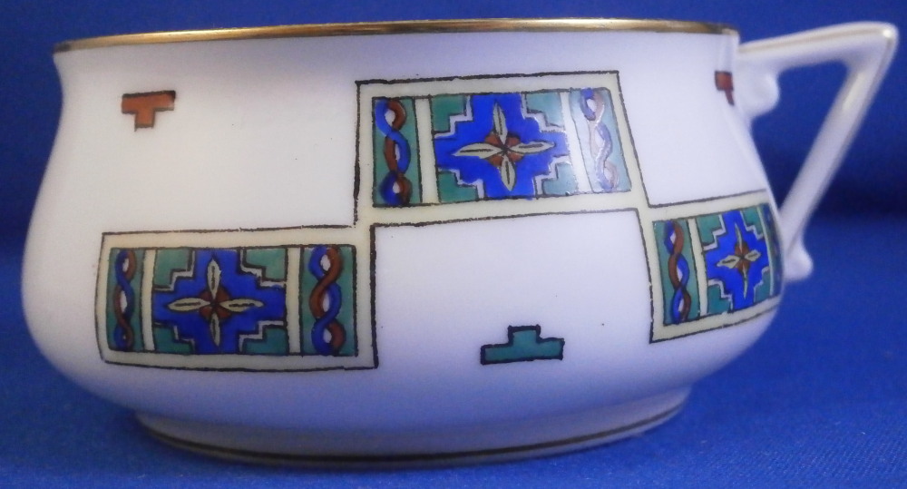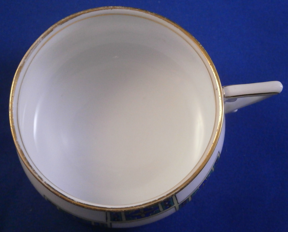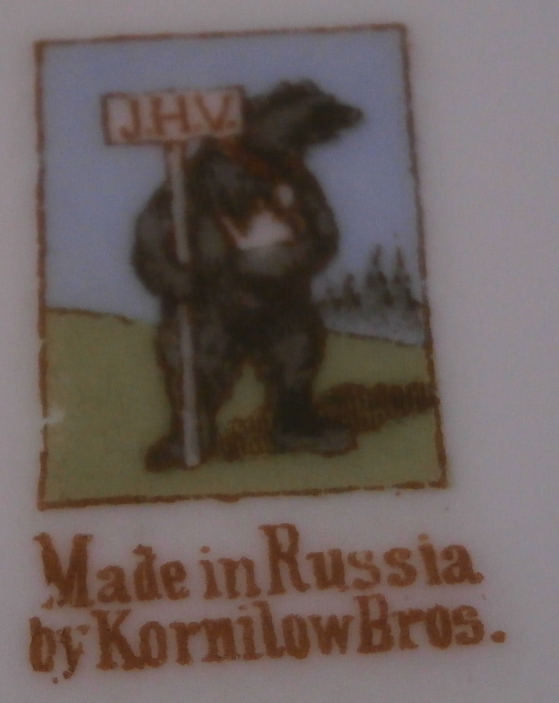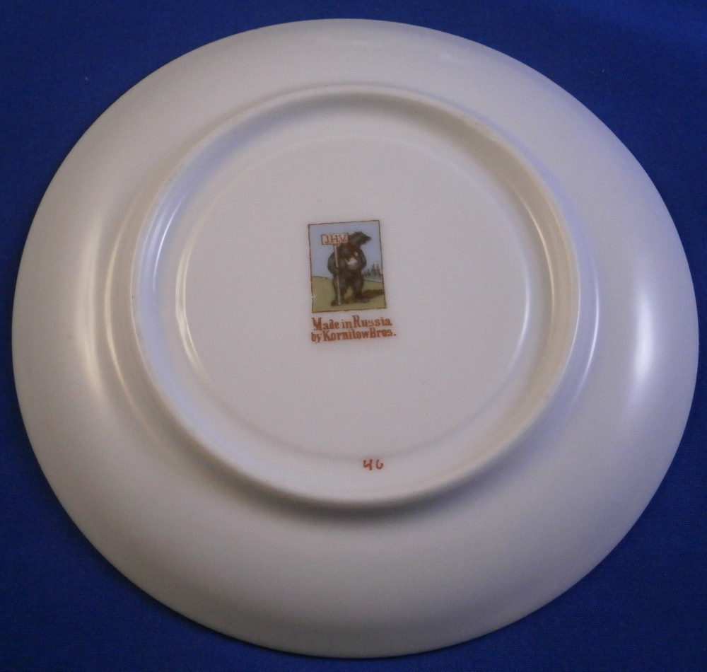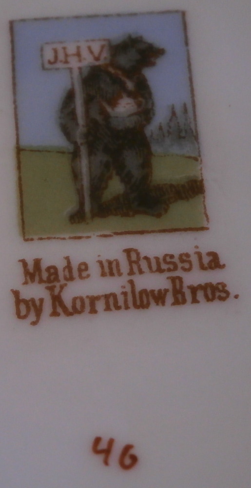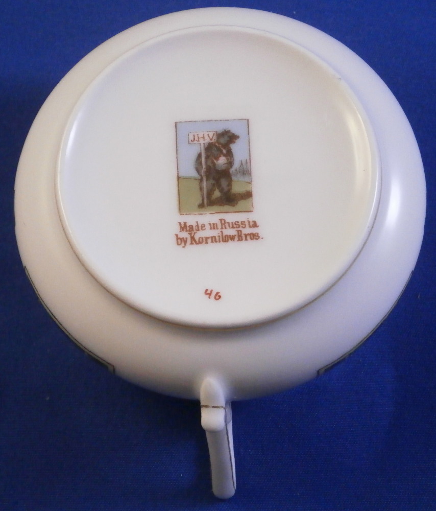 This is a superb cup and saucer made at the Kornilow factory around 1900. The rim of the suacer and outside of the cup are decorated with a nice geometric design that is quite attractive with some nicely placed thin gold trim to the edges, etc. Typical handle shape with a bit of gilding to that. A very typical design for this maker but one rarely sees cups and saucers so this is a rare chance to own one! The set is in great condition with just some wear to the gilding mainly cup top edge.Both are marked as shown in the photo with the Bear mark with Made in Russia by Kornilow Bros underneath that. Plus a red 46 on both peices. The saucer is just over 0.5 inches tall and 5 inches in diameter. The cup is just under 1.5 inches tall and 2.625 inches in diameeter at the top. It is a bit wider in the center and the handle sticks out a bit. Please email me for more information or other pictures.