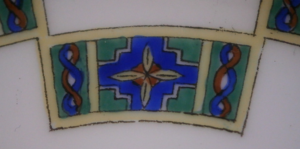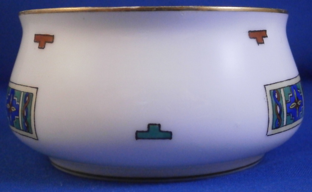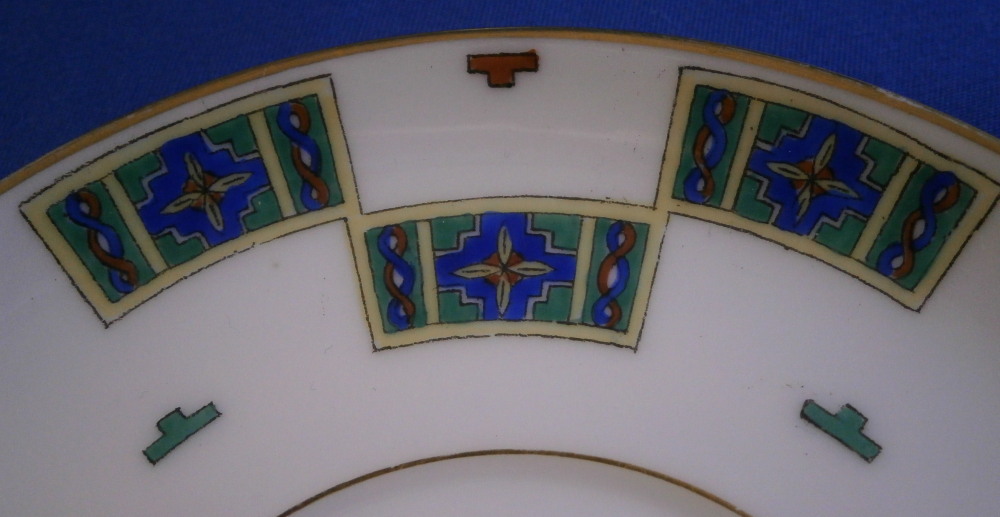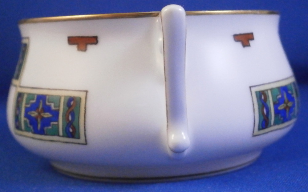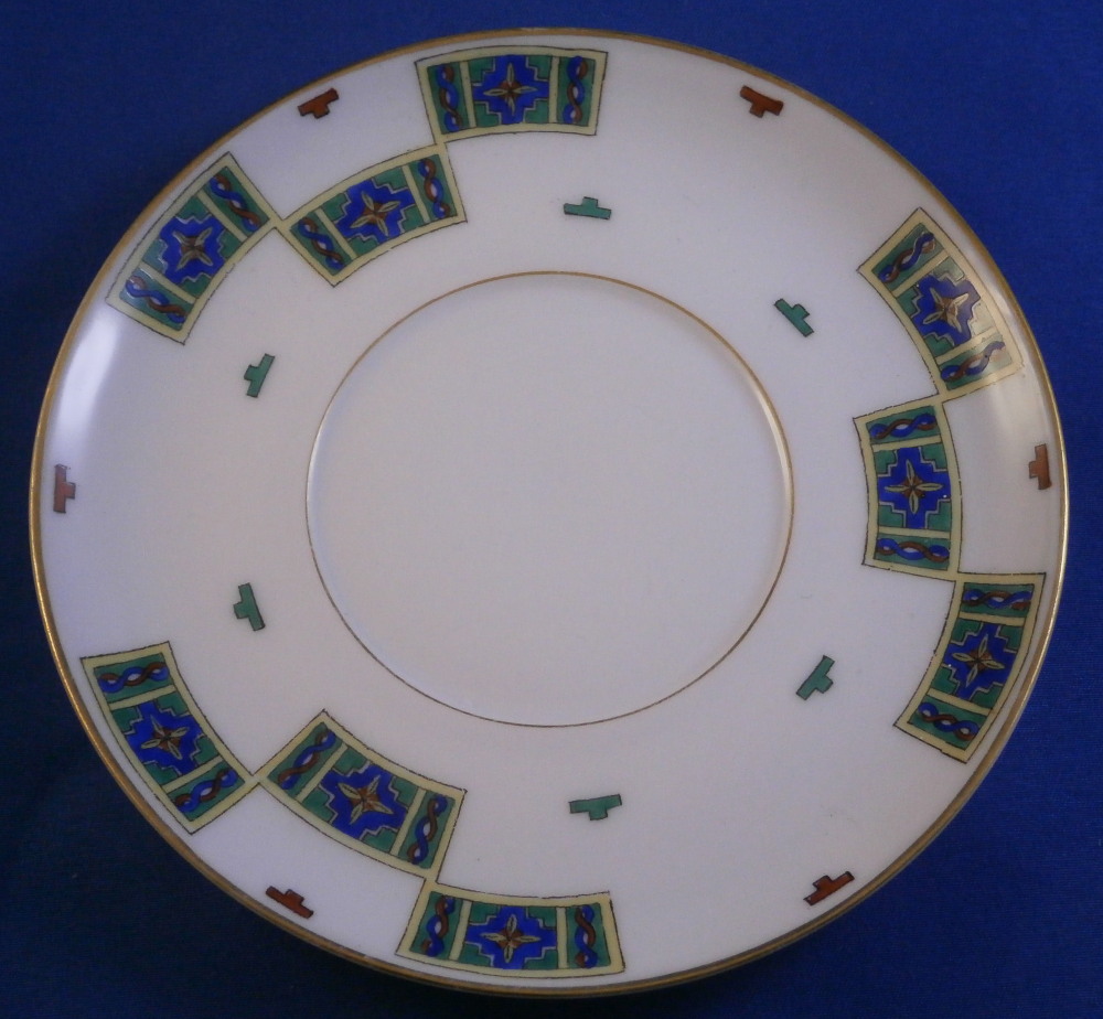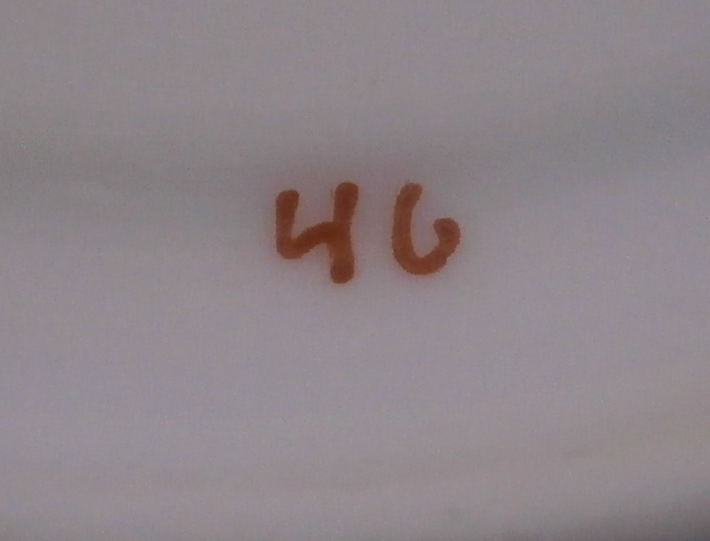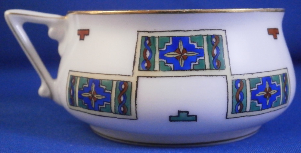 This is a superb cup and saucer made at the Kornilow factory around 1900. The rim of the suacer and outside of the cup are decorated with a nice geometric design that is quite attractive with some nicely placed thin gold trim to the edges, etc. Typical handle shape with a bit of gilding to that. A very typical design for this maker but one rarely sees cups and saucers so this is a rare chance to own one! The set is in great condition with just some wear to the gilding mainly cup top edge.Both are marked as shown in the photo with the Bear mark with Made in Russia by Kornilow Bros underneath that. Plus a red 46 on both peices. The saucer is just over 0.5 inches tall and 5 inches in diameter. The cup is just under 1.5 inches tall and 2.625 inches in diameeter at the top. It is a bit wider in the center and the handle sticks out a bit. Please email me for more information or other pictures.