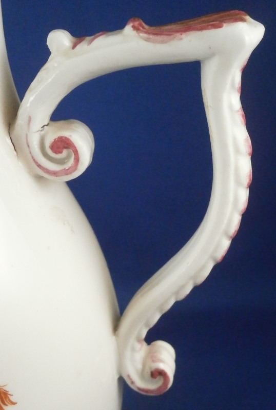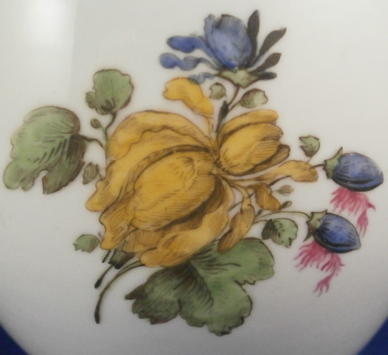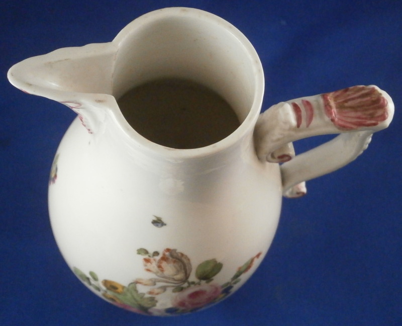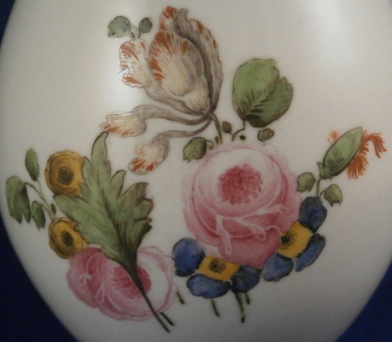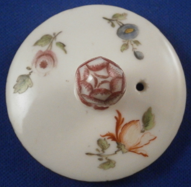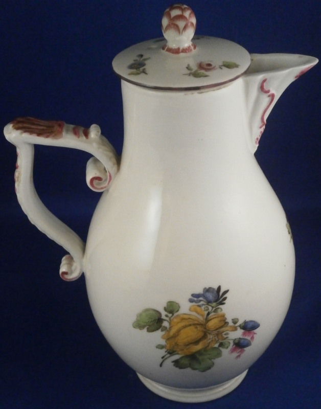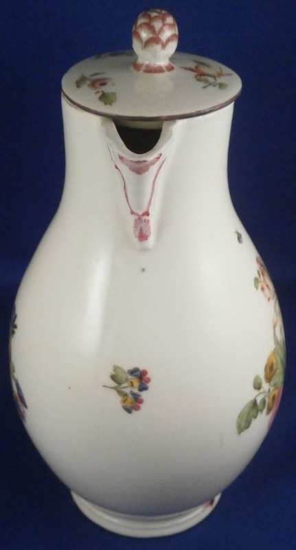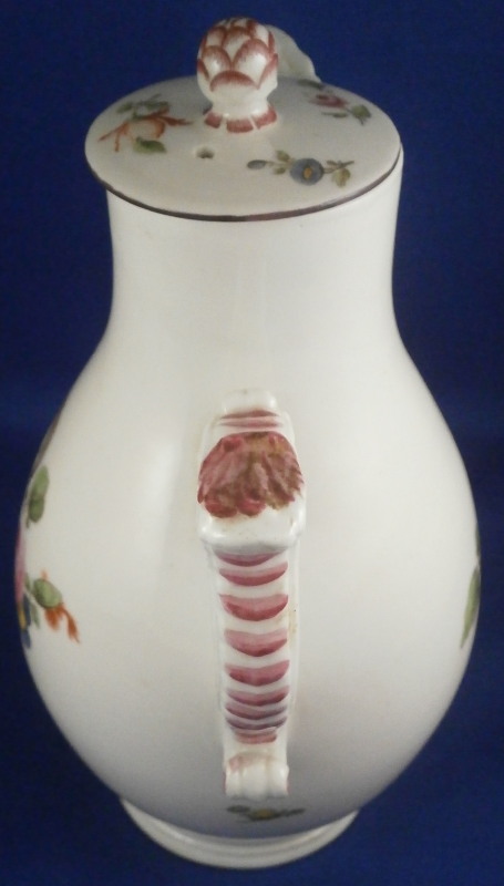 This is a rare small coffee pot with its lid made by Korzec in the late 18th century. Korzec was started by Joseph Klemens Prince Sartoryski in 1790 and made porcelain until about the mid 19th century. It is quite rare and hard to find. The pot is hand painted with a floral arrangement to the front and back as well as a couple of small flowers in between mainly to hide flaws in the porcelain paste. The nicely shaped handle and spout each have some puce trim to them. The lid has a nice pine cone finial also decorated in puce, three small flowers and a brown trim to the edge. Flat shape which is what they did unlike many other makers who used more of a dome shape for this type of pot. The pot is marked with only an impressed letter K as shown - the lid has an incised number 3. The piece is in perfect condition with the occasional firing flaw. The pot is 6.75 inches tall, 4.5 inches from handle to spout and 3.5 inches in diameter. Please email me for more information or other pictures.