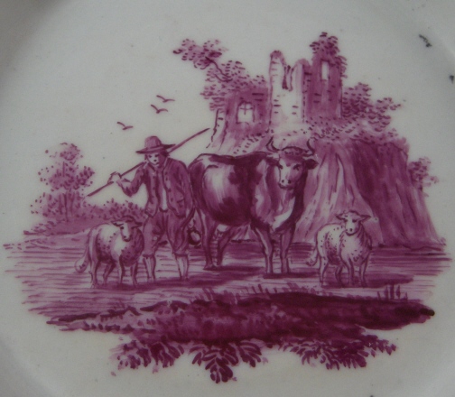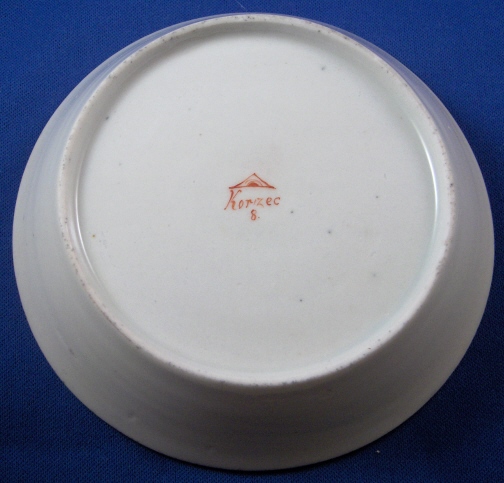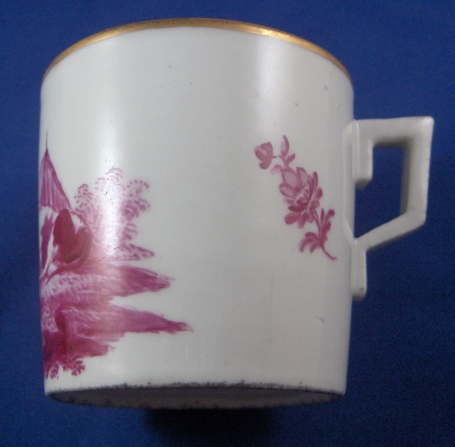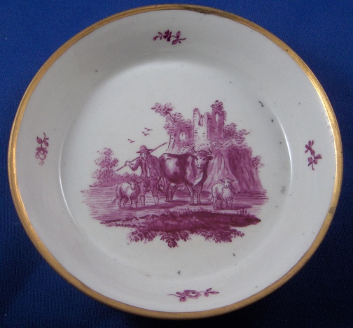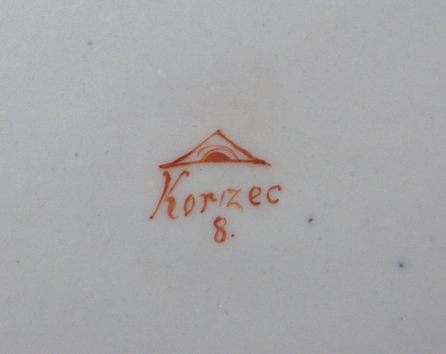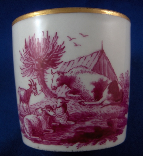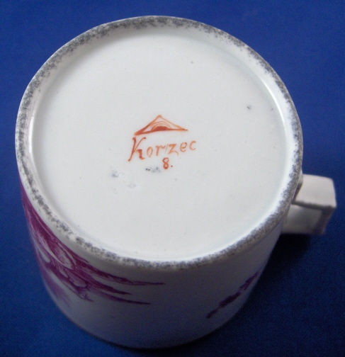 This is a cup and saucer made by Korzec in the very beginning of the 19th century. Korzec was started by Joseph Klemens Prince Sartoryski in 1790 and made porcelain until about the mid 19th century. The set is handpainted with a large puce scene in the front of the cup and saucer center. The puce color is just a bit different on the two pieces but puce was the hardest color to fire since the shade would differ with just the smallest amount of temperature differences. The scene on the cup has a cow, two sheep and a goat in it and the scene on the saucer has a a cow, two sheep and a farmer in it. Some small puce flowers as well on both as well as a nice gold trim. Both are marked with a triangle with an eye in it in red underneath with the name Korzec underneath that and the number 8. I guess the mark stems from the all seeing eye in Egyptian culture!? Both pieces are in great condition with a teeny chip to the saucer rim that is gilded over and a small restored inside rim chip on the saucer where the gilding is just a touch different than the rest but it's very hard to spot and very small again. There is a bit of dark spotting mostly on the footring of the cup. The cup is 2.5 inches tall and 2.5 inches in diameter. The saucer is 1 inch tall and 4.875 inches in diameter. Please email me for more information or other pictures.