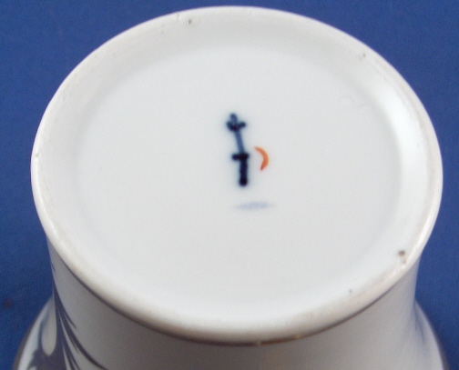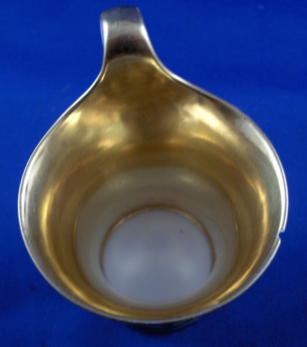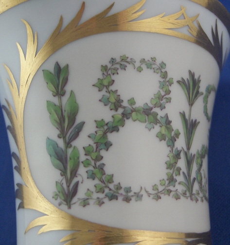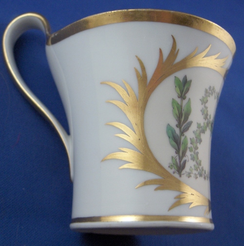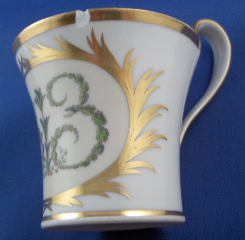 This is a great cup made by KPM in the early 19th century. It is handpainted with the year 1813 in a floral design on a light peach ground surrounded by some nice gilding. The cup has a gold ring to the top and bottom and is completely gilded on the inside as well as on the outside of the handle. This is the cup for the saucer I ahve andthey amtch well but did not come together. 1813 is the year of the battle of Leipzig which was the biggest battle before WWI. It was fought on 16–19 October 1813 by the coalition armies of Russia, Prussia, Austria and Sweden against the French army of Napoleon Bonaparte. Napoleon lost and it was bascially the end of him. The cup is in good condition with a shallow chip to the right side but no hairline or anything else so it would be an easy fix for a good restorer. It is marked underneath with the underglaze blue scepter mark as well as a painters mark and the usual impressed number one finds on KPM of this period. The cup is 3.5 inches tall and 3 inches in diameter. Please email me for more information or other pictures.