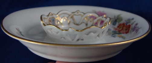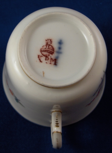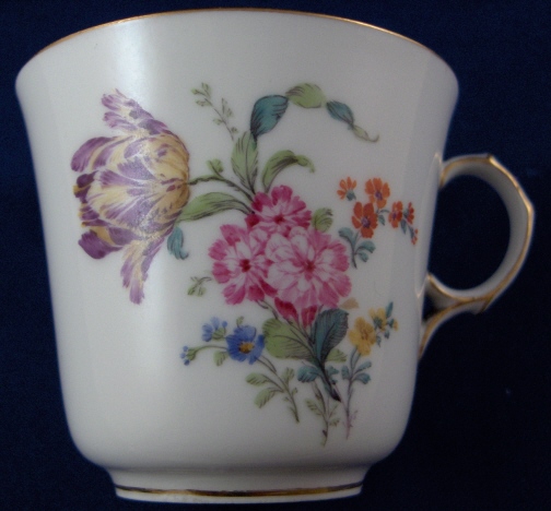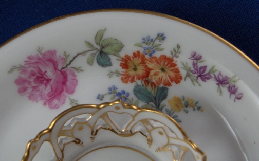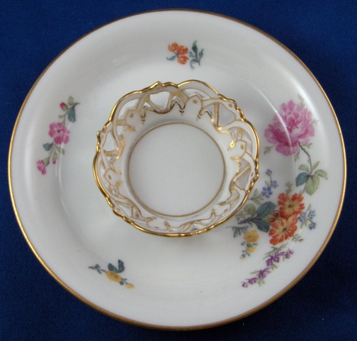This is a cup and saucer made by KPM around 1832 just when they began to use the red orb mark. This style of cup is not one you see often by KPM with the saucer being the trembleuse kind with the with the inside well having a raised rim that is reticulated and highlighted with gilding. Both pieces are handpainted with some of the best flowers they ever painted an some nice gold trim especially on the inside of the cup. The set is in perfect condition. The cup is 2.375 inches tall and 2.625 inches in diameter. The saucer is 0.75 inches tall and 4.875 inches in diameter. Both pieces are marked underneath with the underglaze blue scepter mark of the early 19th century as well as the red orb mark. Please email me for more information or other pictures.