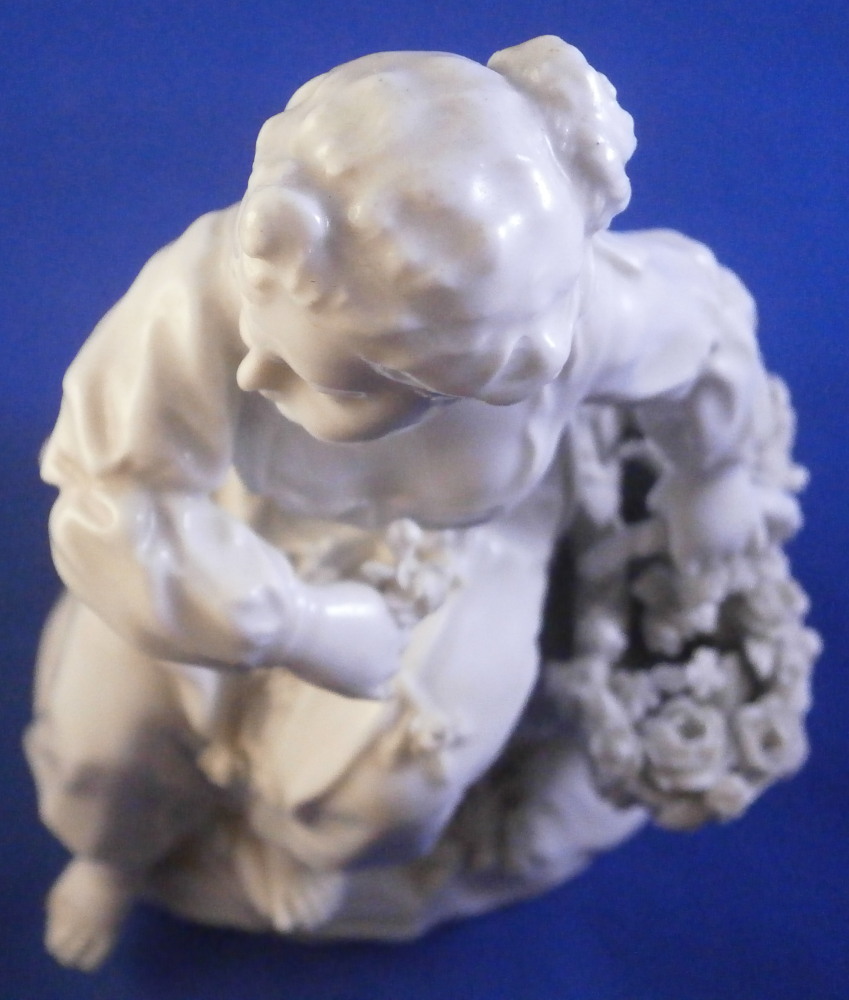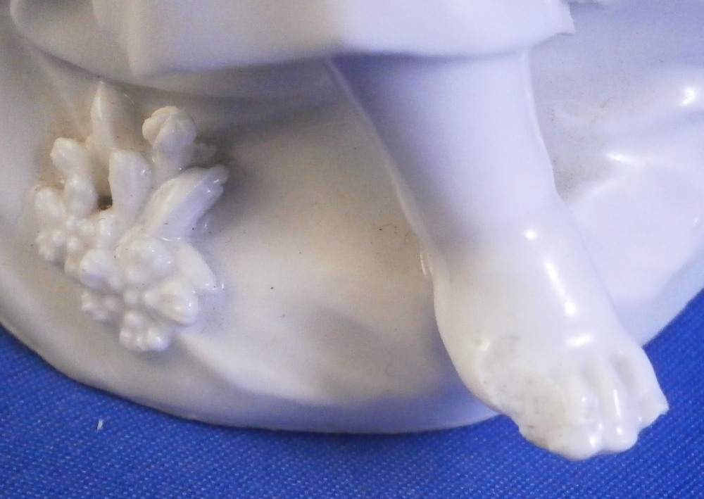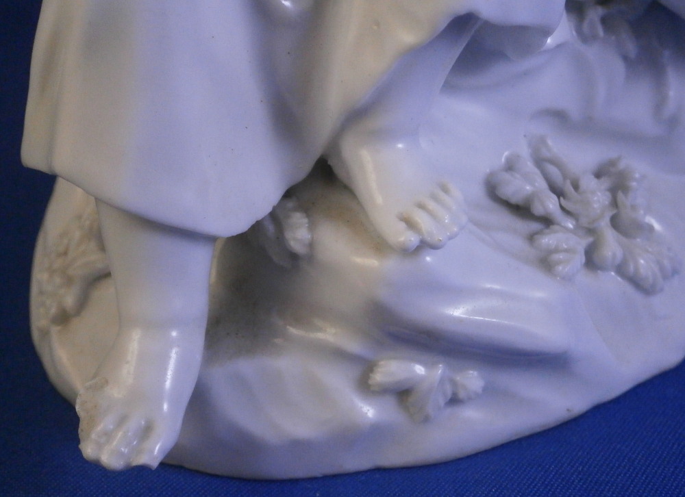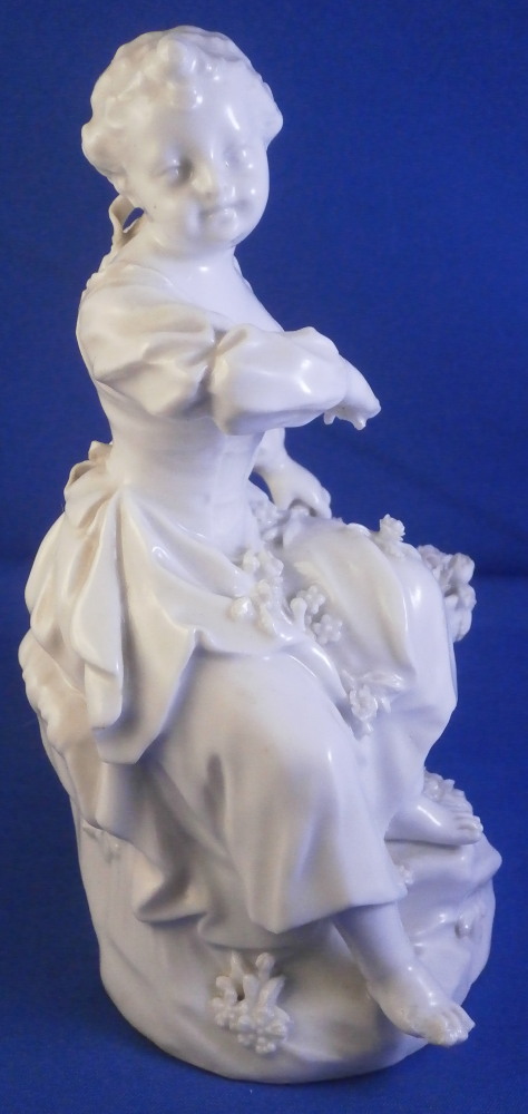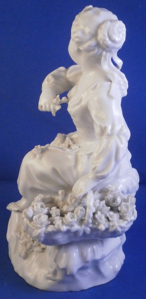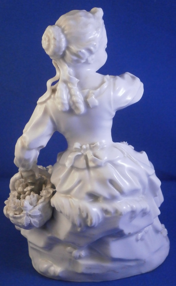 This is a figurine of a young lady sitting on some rocks made by KPM in the later 18th century around 1780. The figure is superbly modeled and left in the white to show off all that detail! She is wearing a fancy dress with flowers strewn cross the front, holding a flower in her right hand, her hair is nicely done with a bow in the back, a large basket filled with flowers in her left hand and some more flowers on the base. The figurine is in superb condition with some minor damage to the flower in her hand, a piece of the string of the bow in the back of her head is missing and some minor damage to the smaller toes on her left foot as shown. All in all in amazing condition given the details and age fo this example! She displays perfectly! The piece is 5.5 inches tall, 3.625 inches wide and 2.75 inches deep. The figurine is marked underneath with the under glaze blue scepter mark as shown. Please email me for more information or other pictures.