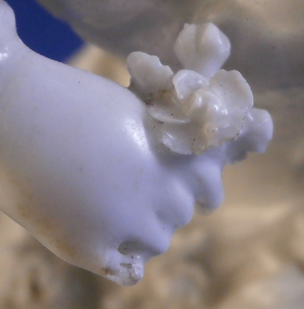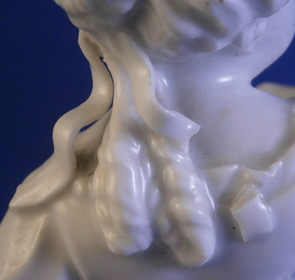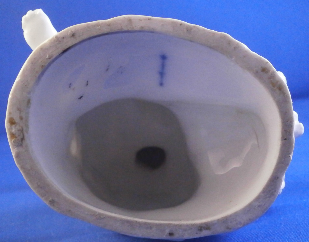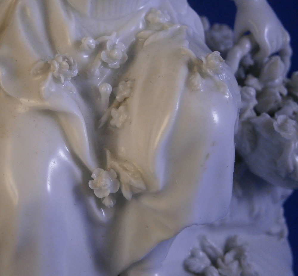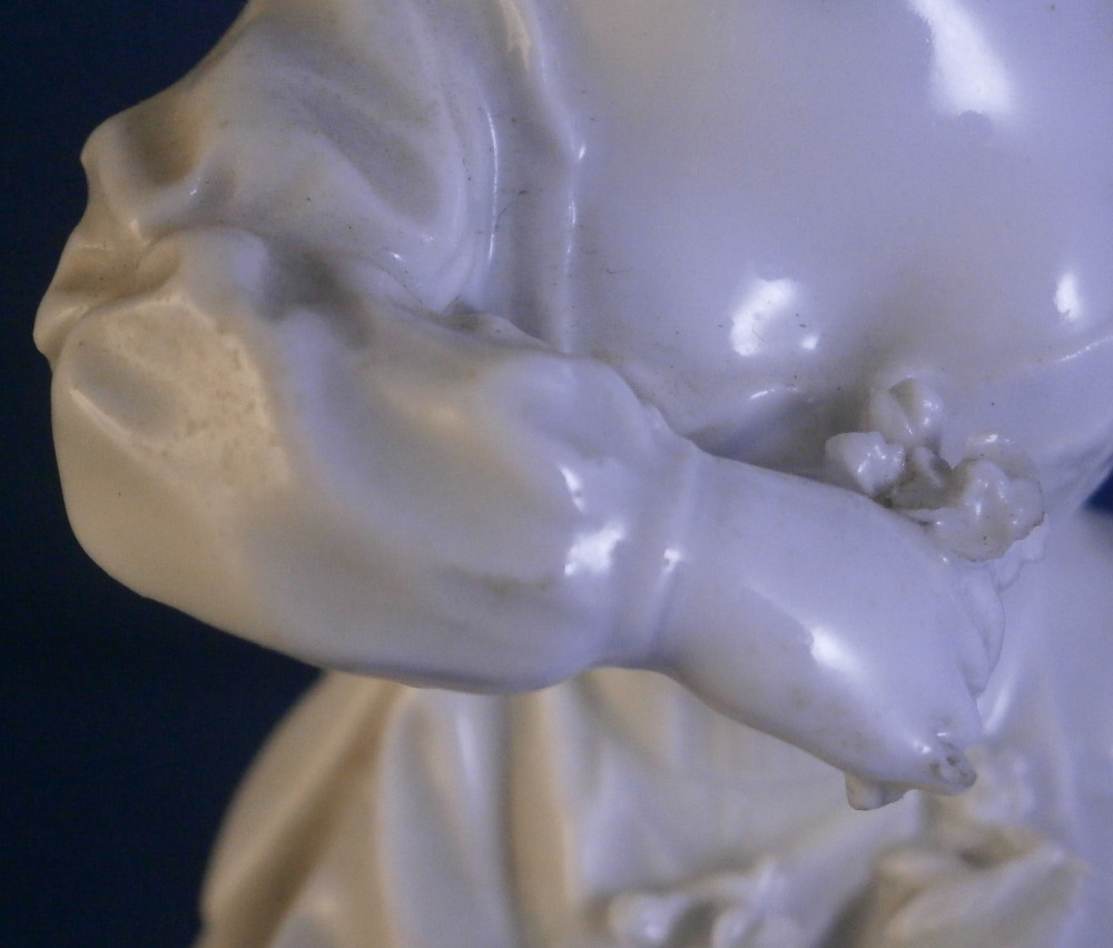 This is a figurine of a young lady sitting on some rocks made by KPM in the later 18th century around 1780. The figure is superbly modeled and left in the white to show off all that detail! She is wearing a fancy dress with flowers strewn cross the front, holding a flower in her right hand, her hair is nicely done with a bow in the back, a large basket filled with flowers in her left hand and some more flowers on the base. The figurine is in superb condition with some minor damage to the flower in her hand, a piece of the string of the bow in the back of her head is missing and some minor damage to the smaller toes on her left foot as shown. All in all in amazing condition given the details and age fo this example! She displays perfectly! The piece is 5.5 inches tall, 3.625 inches wide and 2.75 inches deep. The figurine is marked underneath with the under glaze blue scepter mark as shown. Please email me for more information or other pictures.