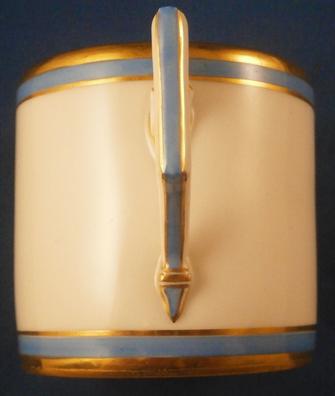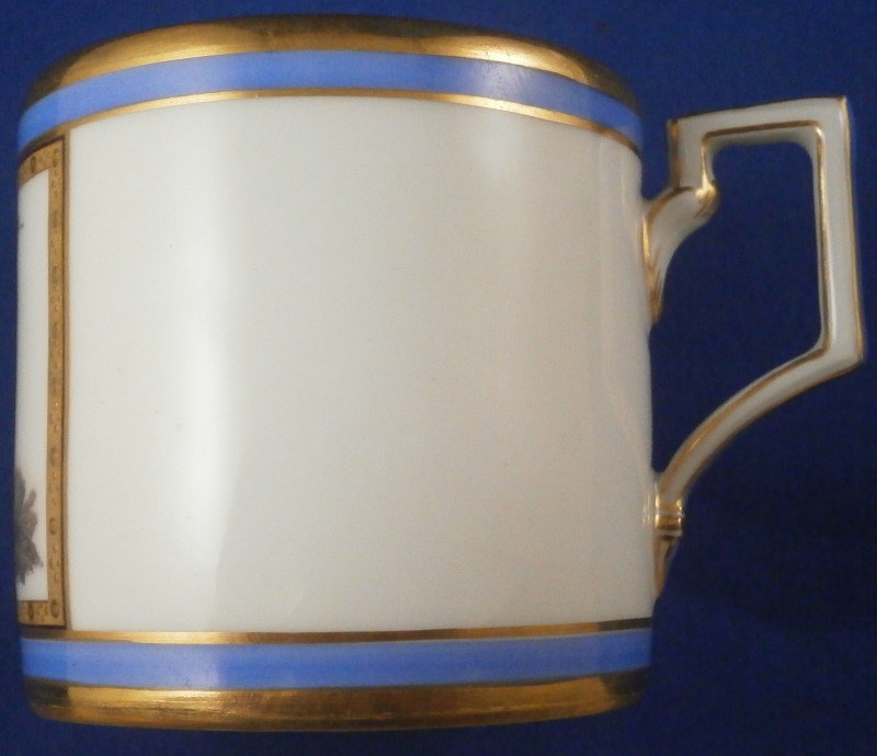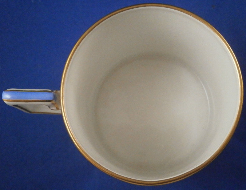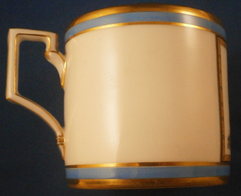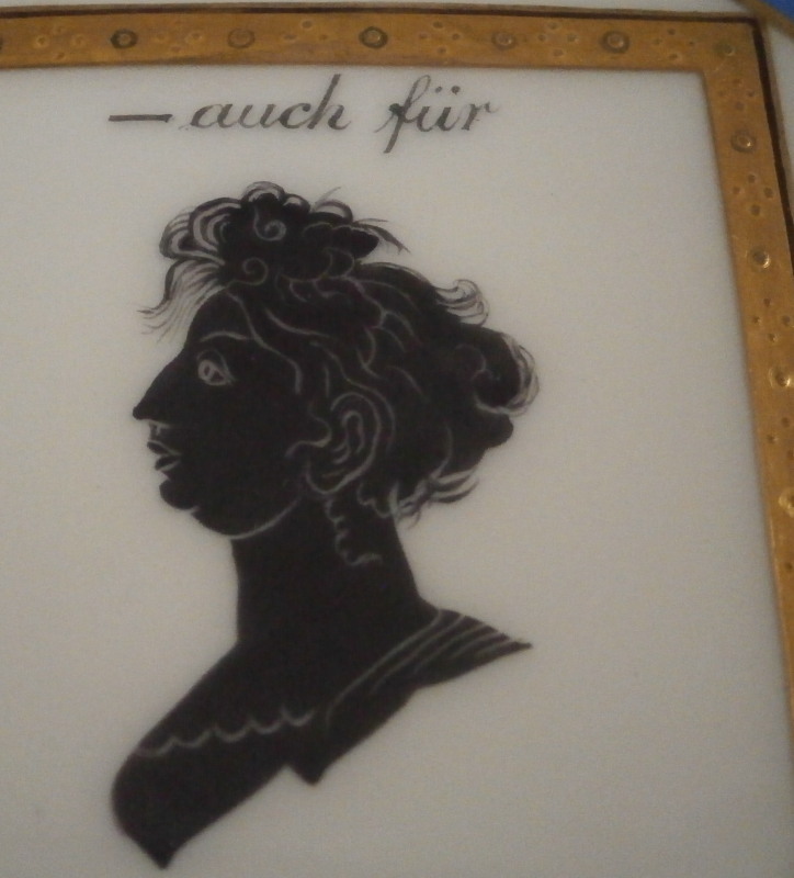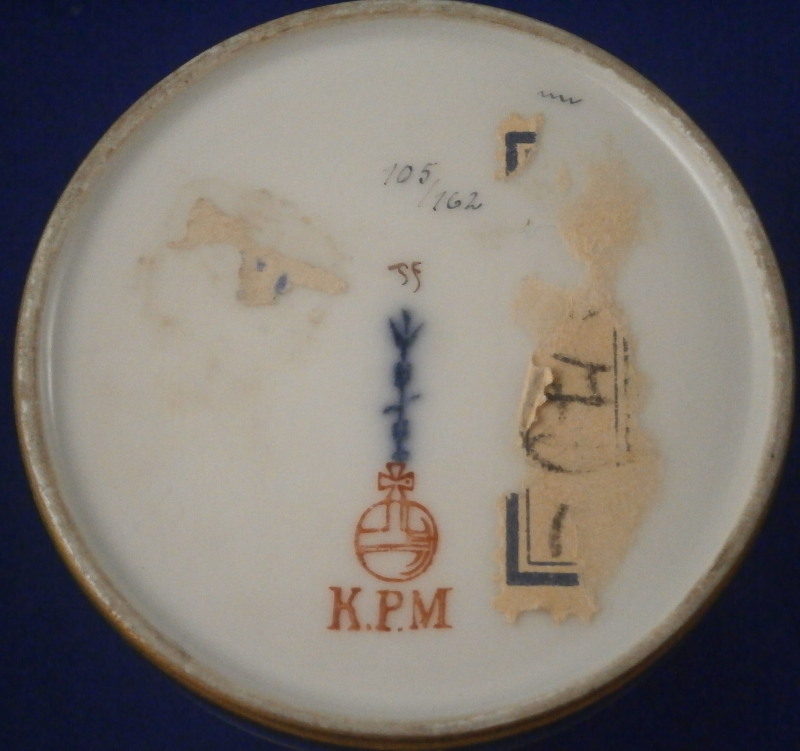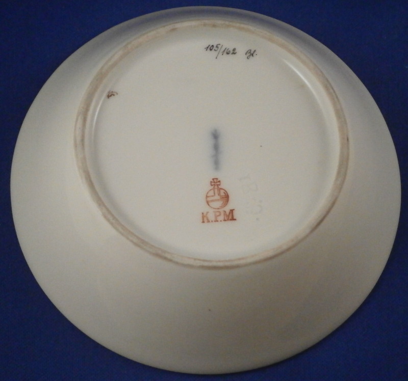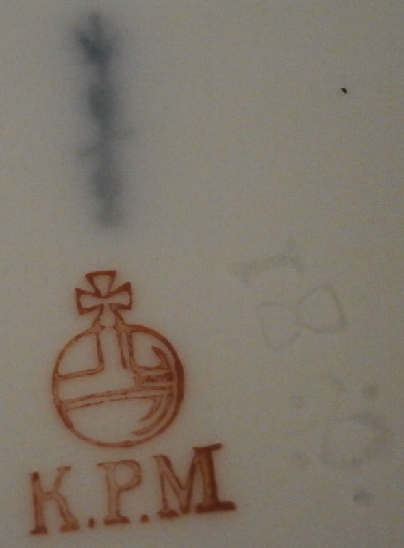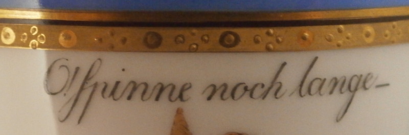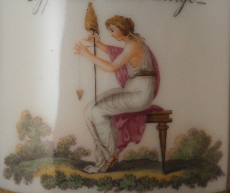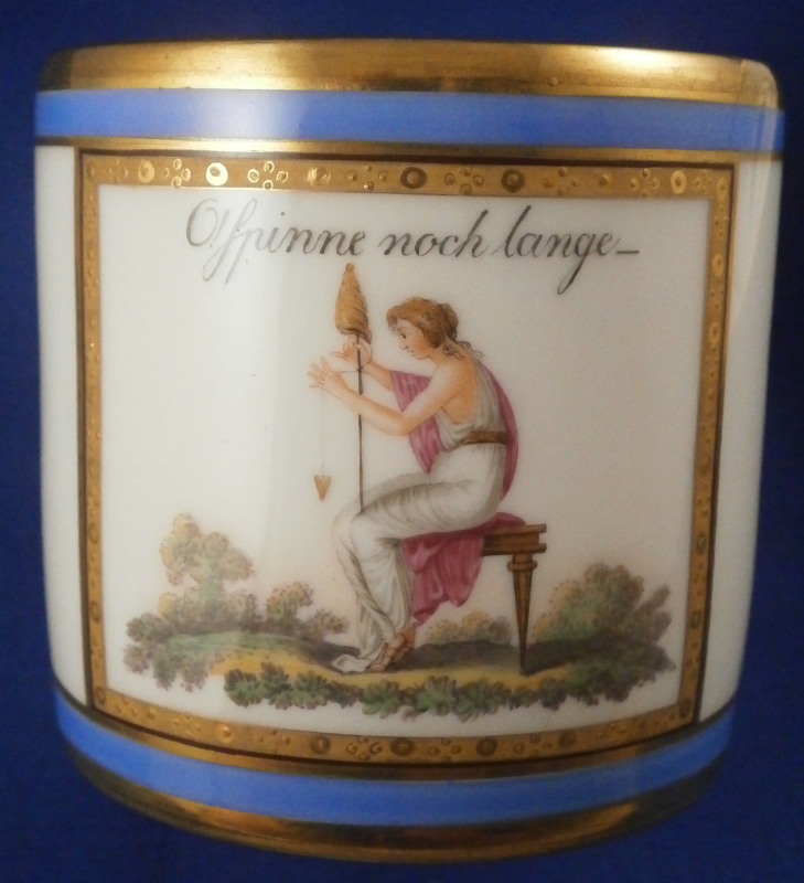 This is a really nice cup and saucer made by KPM in the 20th century in a style fitting much better into the 18th century. The cup is hand painted with a superb scene of a lady spinning some woold while sitting on a chair in a landscape surrounding. Nice black and gold trim around the scene and light blue and gold trim around the edges and the handle. The scene has Spinne noch lange (keep spinning for a long time) written in black above the scene of the cup and .... auch fuer (also for) on the saucer with a black silhouette of a lady painted in the center of the saucer which I assume is of the lady that gave the cup to her special someone. Great handle shape to the cup (my favorite!) which is from the classisim period of the late 18th century. The set is in perfect condition. The cup is 2.375 inches tall and 2.5 inches in diameter. The saucer is 1.125 inches tall and 5 inches in diameter. Both are marked underneath with the underglaze blue scepter as well as the red orb and various other marks as shown. Please email me for more information or other pictures.