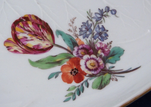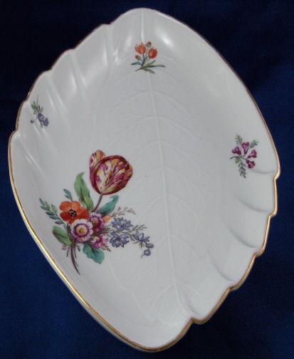 This is a fun leaf shaped dish made by KPM in the 18th century. KPM used no painters mark like the red orb yet during this period thus you only have the blue scepter and impressed marks most of the time. It is handpainted with a nice large floral arrangement on one side as well as three smaller ones and a gold trim to the edge. Nice raised veins in the paste to make it look more like a leaf. The dish is in super condition with a bit of gold wear and a spot of wear to the tulip. There is an almost chip to the footring but it never came off and is just visible on one side (see pictures). The piece is 1.5 inches tall, 10.375 inches wide and 7 inches deep. It is marked underneath with the underglaze blue scepter with a blue line underneath as well as some impressed marks as shown. Please email me for more information or other pictures.