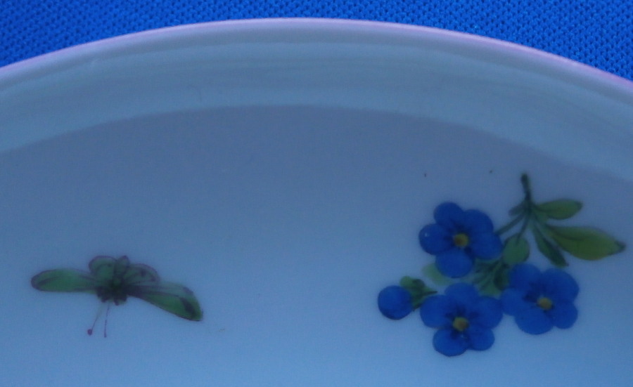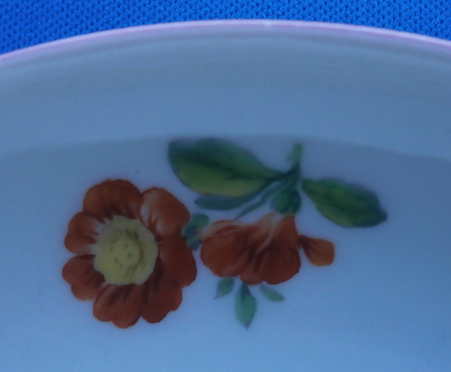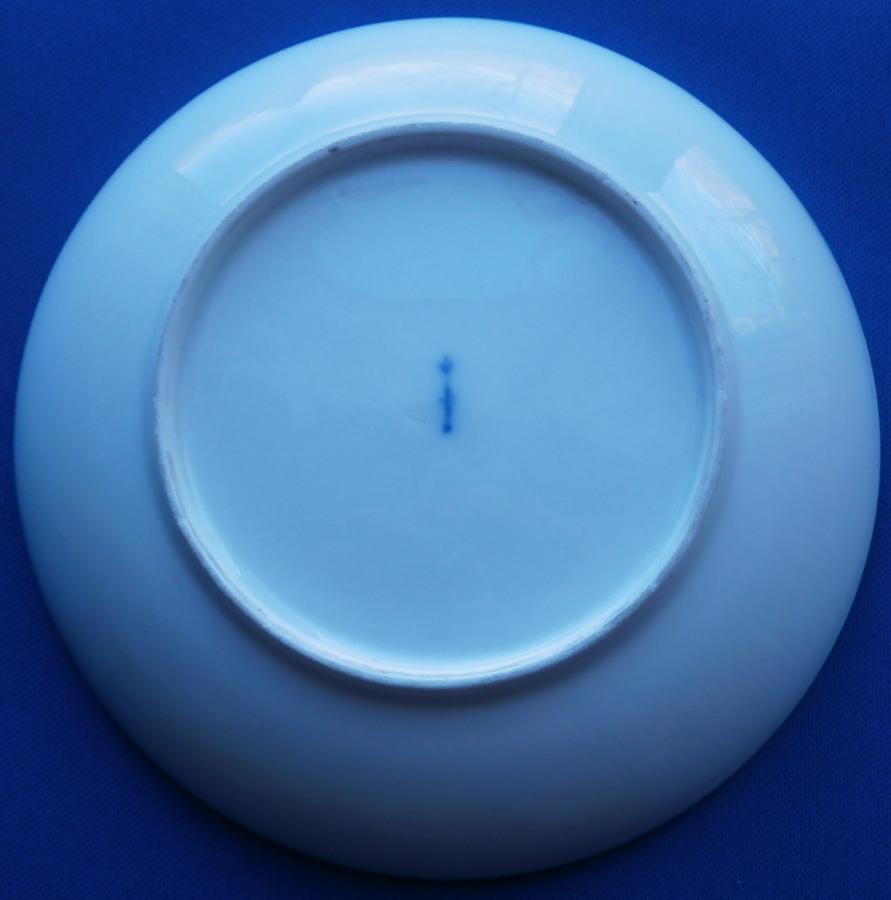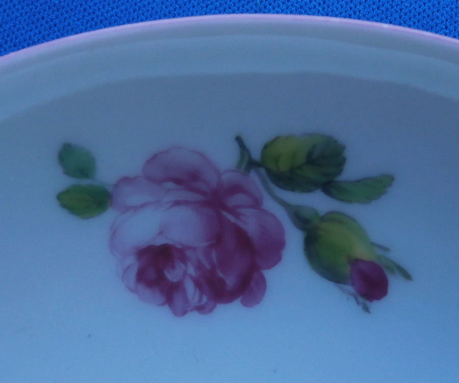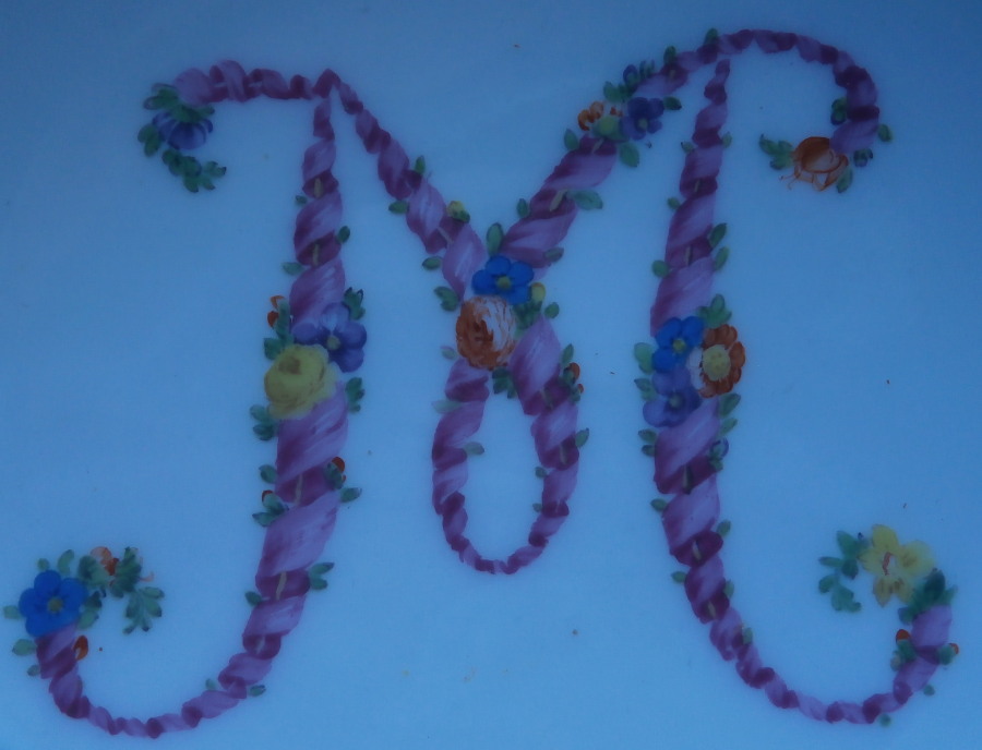 This is a nice saucer made by KPM in the late 18th century. KPM used no painters mark like the red orb yet during this period thus you only have the blue scepter and impressed marks most of the time. It is hand painted with the letter M (so it was a must have for me plus I alaready had the one with a B on it) in a puce & pink ribbon intertwined with tiny flowers and leaves, has a little butterfly below and three single flowers along the rim with a pink trim to the edge. The colors are much brighter and the porcelain whiter than the pics show. The piece is in perfect condition. It is 1.25 inches tall and 5.125 inches in diameter and marked underneath with the under glaze blue scepter mark as well as some impressed marks as shown. Please email me for more information or other pictures.