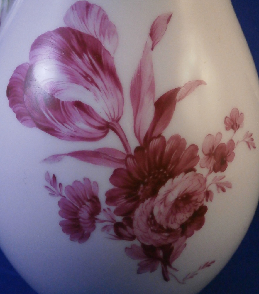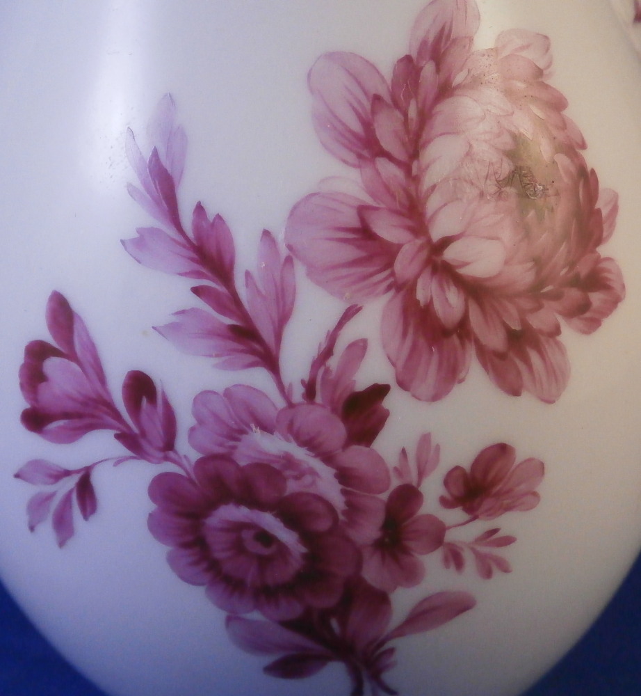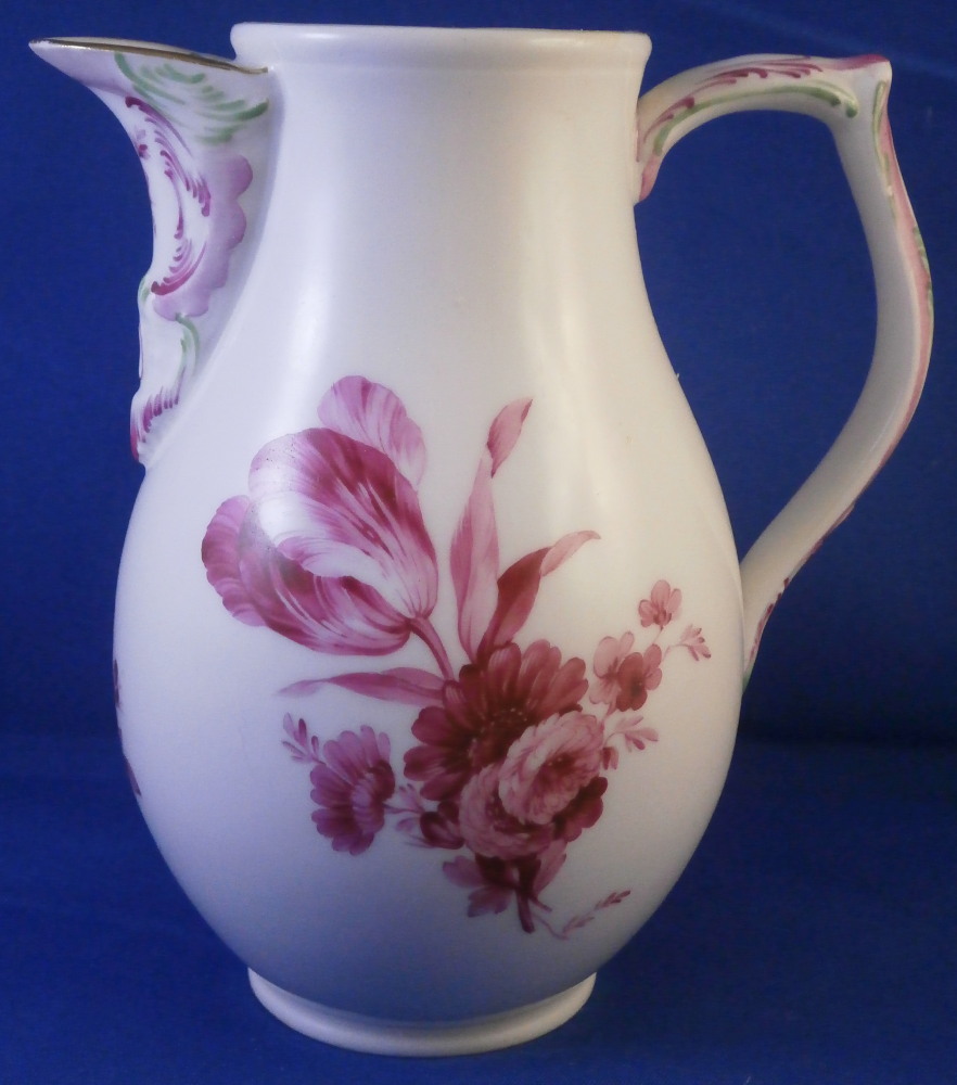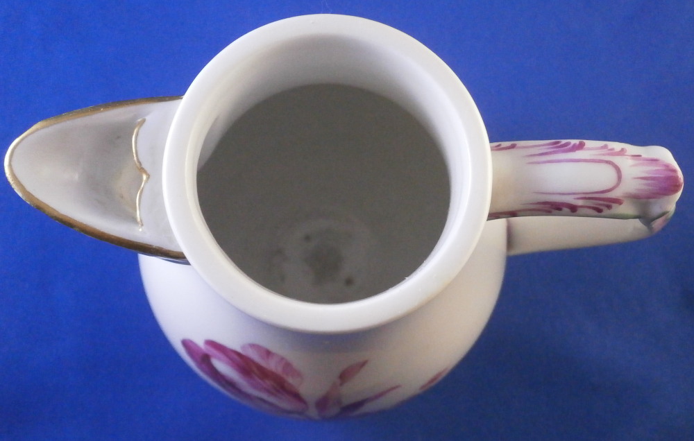 This is a small hot water or coffee pot made by KPM in the 18th century. KPM used no painters mark like the red orb yet during this period thus you only have the blue scepter and impressed marks most of the time. The piece is hand painted with a nice puce floral arrangement to either side as well as a smaller flower in the front, on the spout and under the handle. The handle and spount have a nice green and puce trim to a relief design. Gilding to the spout edge. The pot is in superb condition with a tiny green paint flake spot on the handle as shown. Likely had a lid which I do not have. The piece is 5.25 inches tall, 5.75 from handle to spout tip and 3.375 inches in diameter. It is marked underneath with the under glaze blue scepter mark as well as a single line along the foot ring as shown. A very nice piece! Please email me for more information or other pictures.