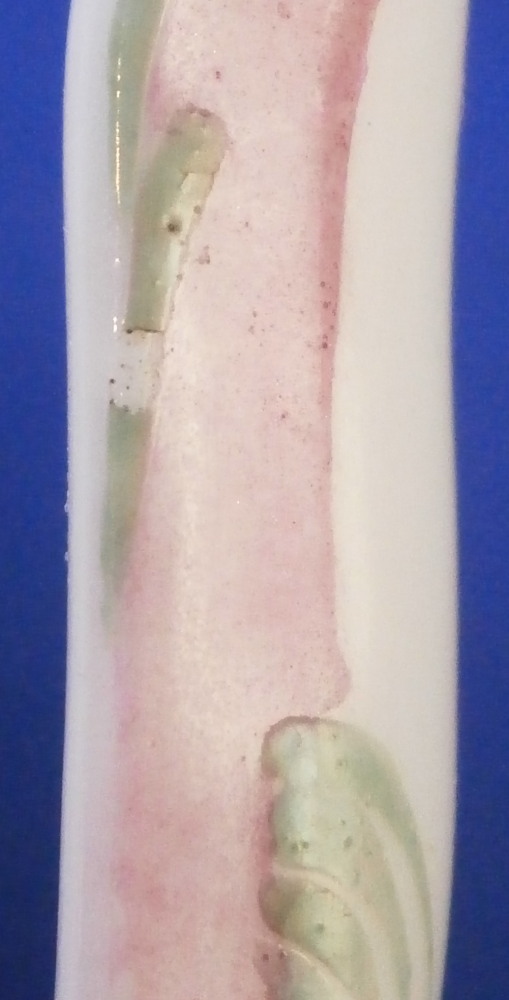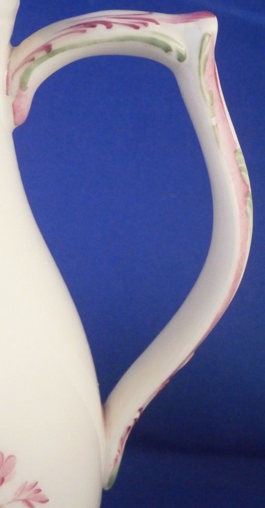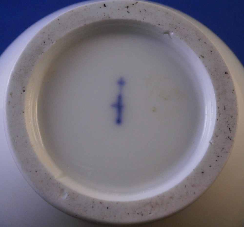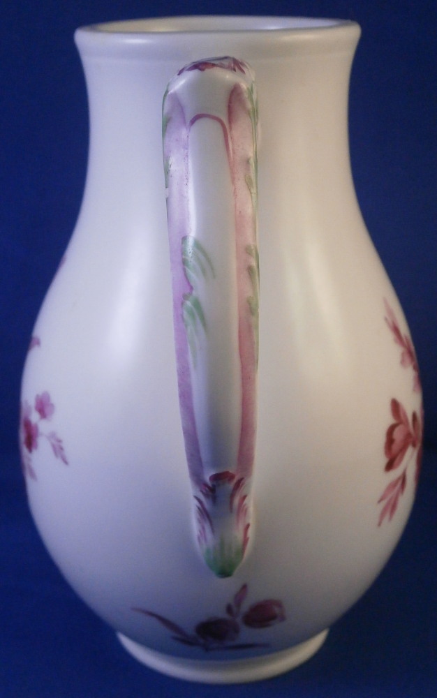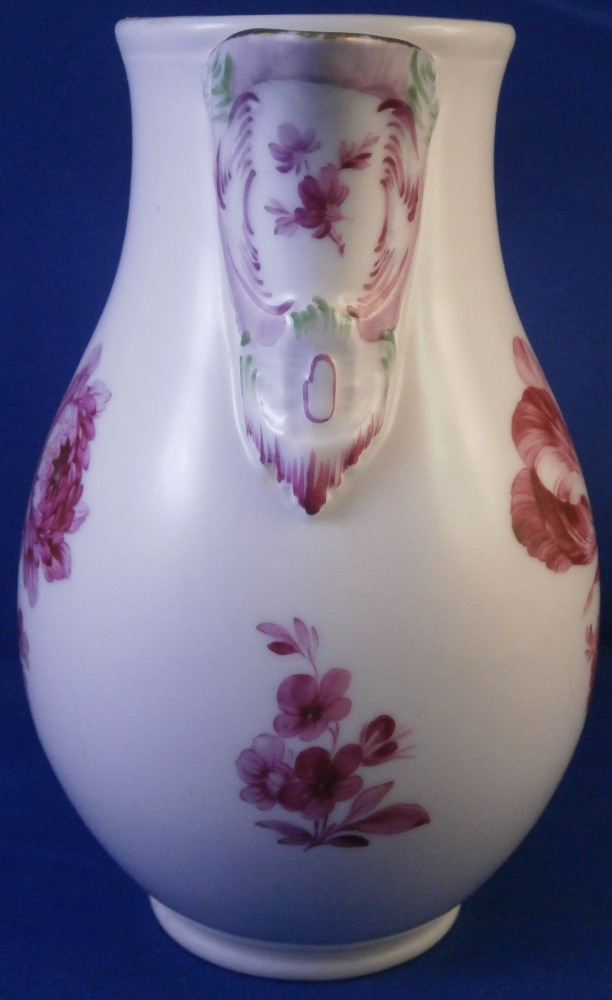 This is a small hot water or coffee pot made by KPM in the 18th century. KPM used no painters mark like the red orb yet during this period thus you only have the blue scepter and impressed marks most of the time. The piece is hand painted with a nice puce floral arrangement to either side as well as a smaller flower in the front, on the spout and under the handle. The handle and spount have a nice green and puce trim to a relief design. Gilding to the spout edge. The pot is in superb condition with a tiny green paint flake spot on the handle as shown. Likely had a lid which I do not have. The piece is 5.25 inches tall, 5.75 from handle to spout tip and 3.375 inches in diameter. It is marked underneath with the under glaze blue scepter mark as well as a single line along the foot ring as shown. A very nice piece! Please email me for more information or other pictures.