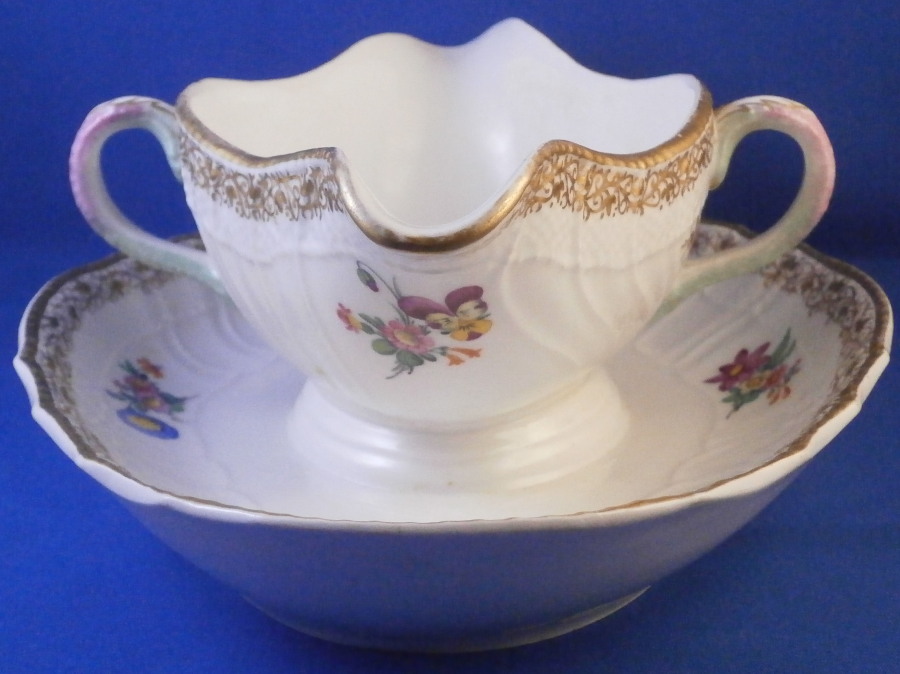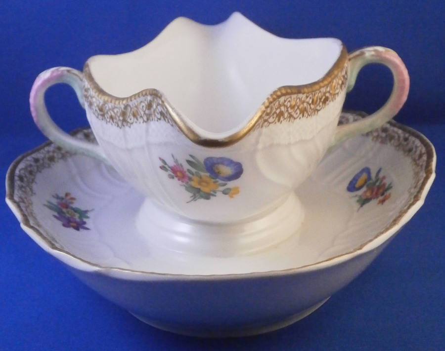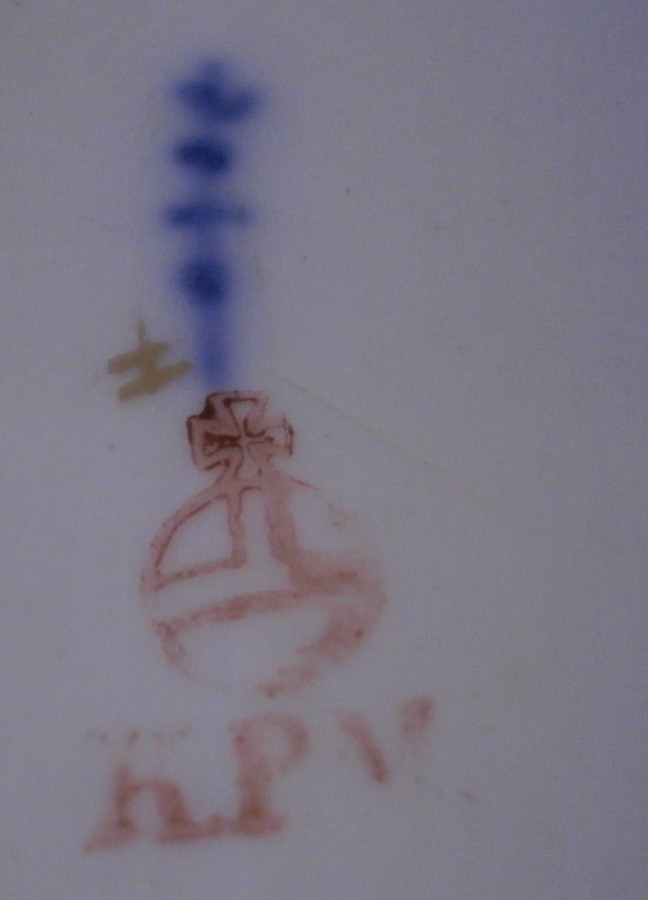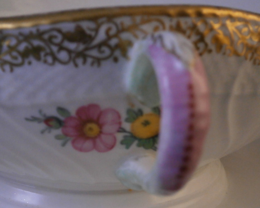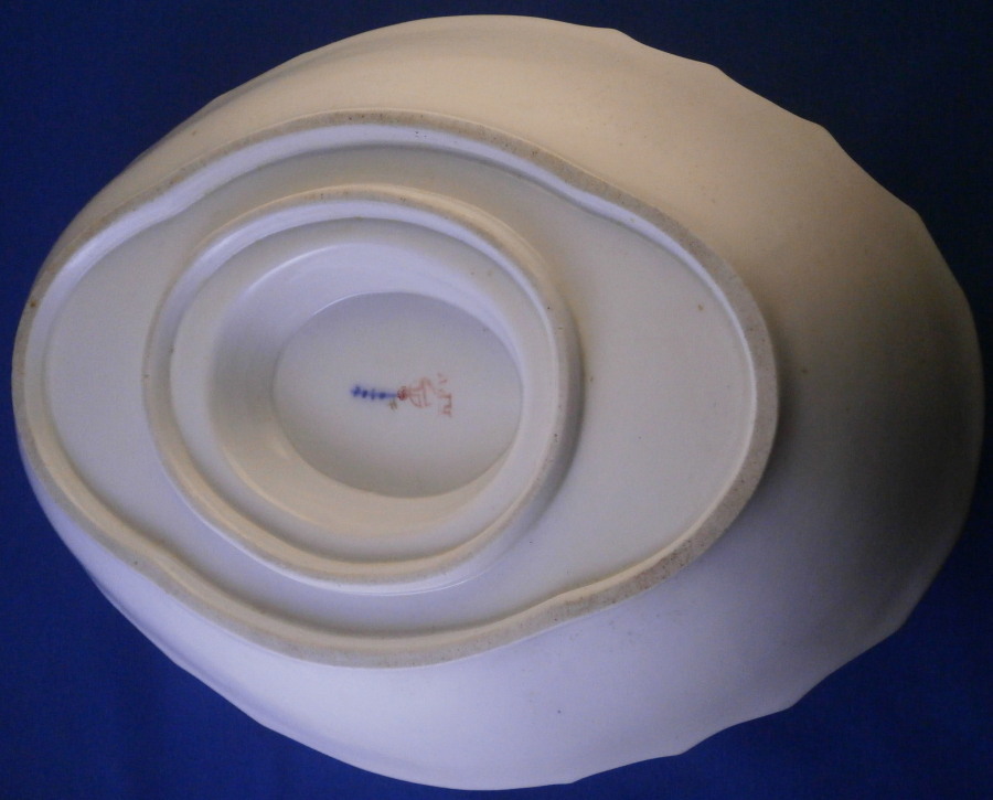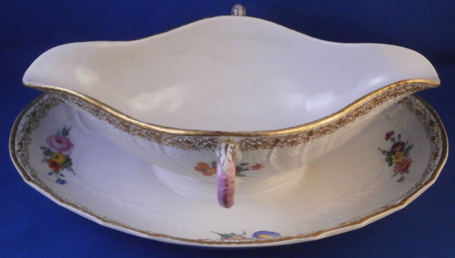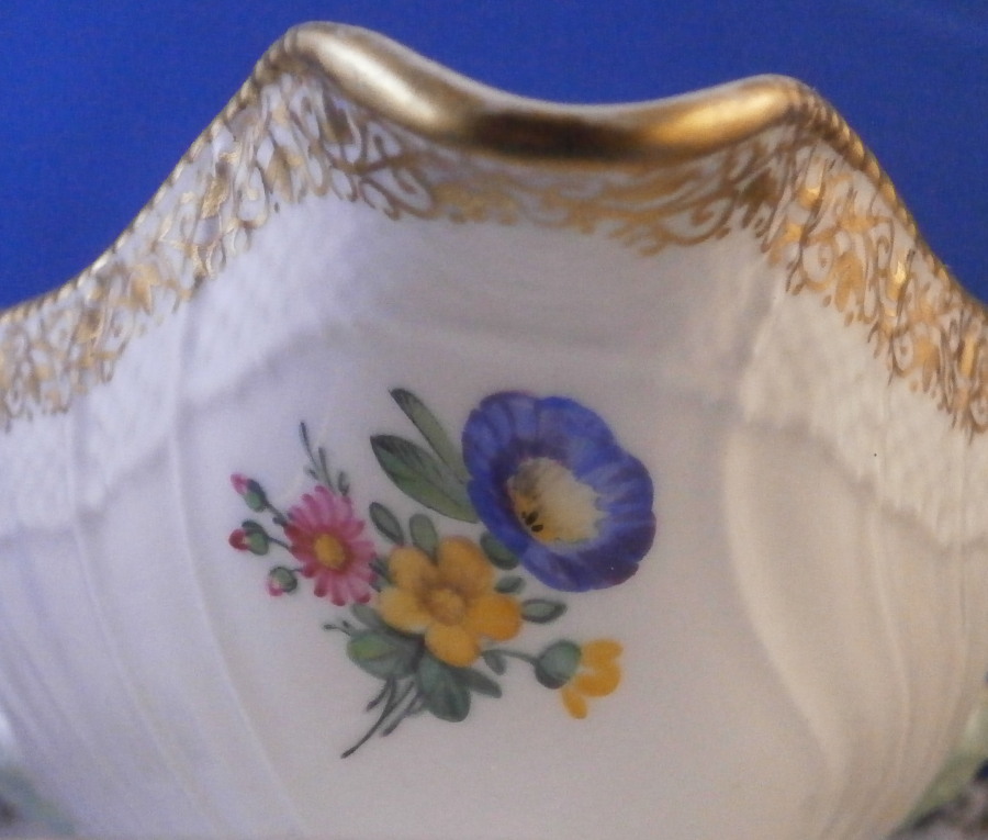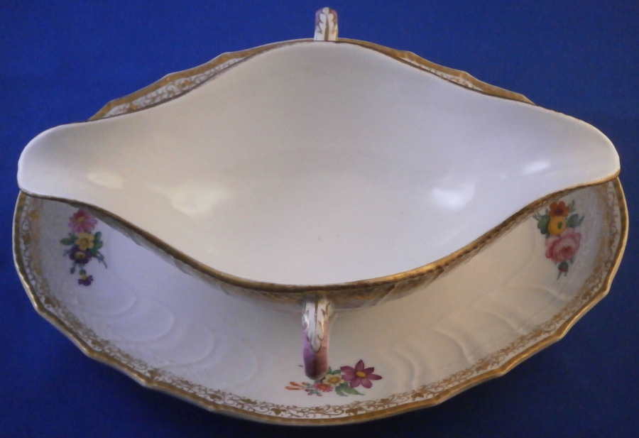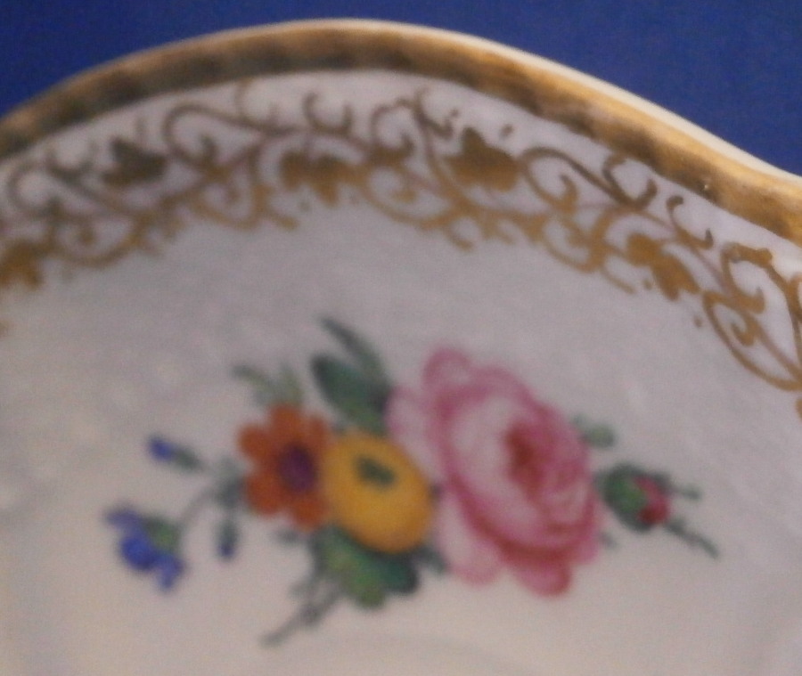 This is a nice early version of the Neuosier style gravy boat / sauce dish made by KPM around 1832. It has the sauce dish attached to the underplate and both have the characterisitc basket weave design to the rim, a gold trim to the edge and a couple of small floral arrangements around the dish and undertray. All hand painted off course. A handle to either side of the main part. One does not see these early version often at all anymore. The dish is 3.25 inches tall, 9.75 inches wide and 6.75 inches deep. It is in perfect condition with virtually no wear at all and just a glaze line to the underside by the mark which is amazing given it's almost 200 years old now. The piece is marked underneath with the under glaze blue scepter as well as the red orb mark and a gilder's mark as shown. Please email me for more information or other pictures.