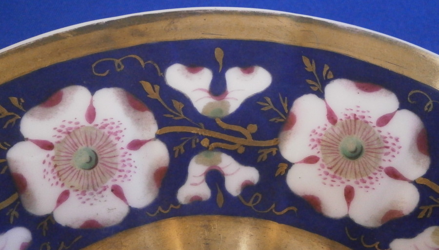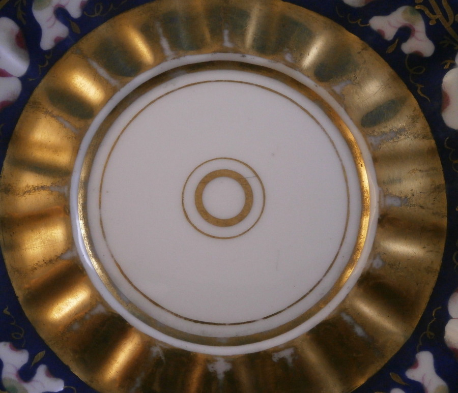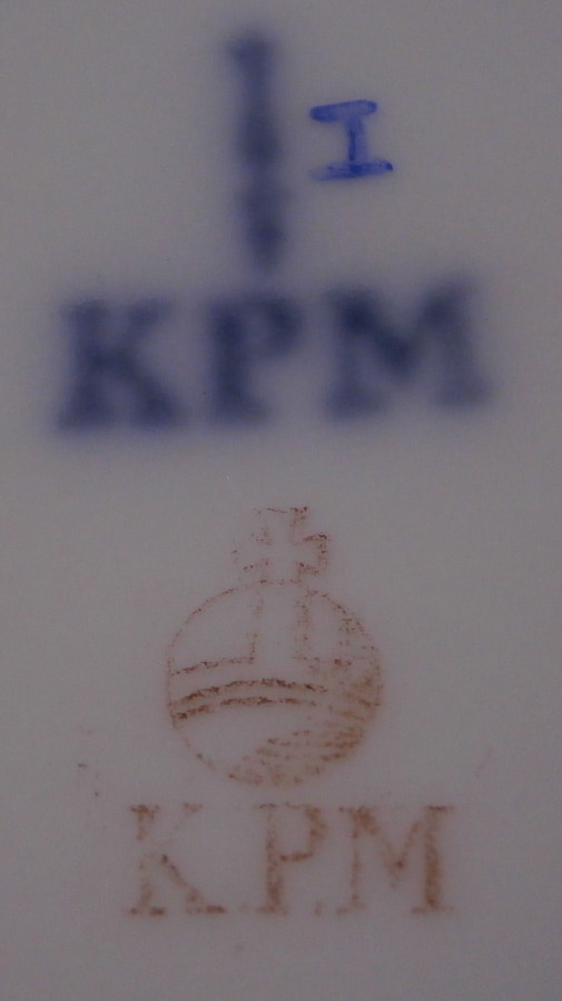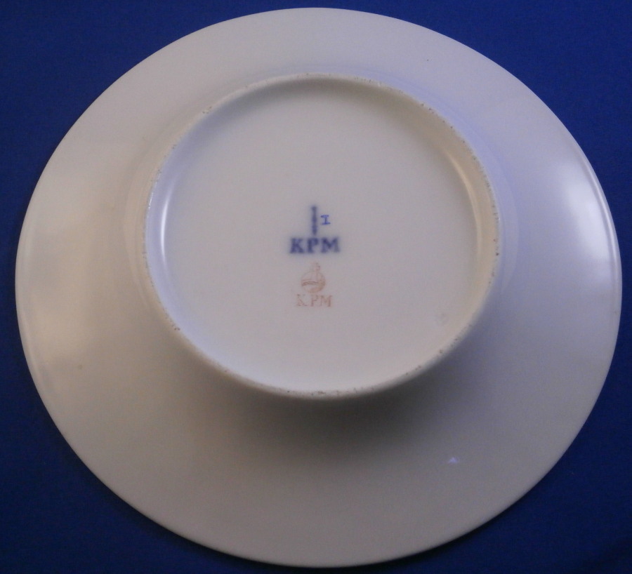 This is a nice saucer made by KPM around the 1840. It is hand painted with a ring of really nice looking red and white flower blossoms with some sort of toher design in between in the same colors which are all connected by gold stems and some leaves. The space in between was done with my favorite of all colors - the matte blue ground color. Thick gold trim to the rim and around the well of the dish with a little more gilding in the center. It's a stunning looking decoration but I cannot figure out what flower this might be. Normally I am pretty good at these. The saucer is marked underneath with the under glaze blue scepter over the letters KPM as well as the red orb mark, a painter's mark and an impressed number as shown. The piece is just under 1 inch tall and 6.5 inches in diameter. It is in great condition with a little wear to the gilding mainly along the high points of the area along the edge of the well. Please email me for more information or other pictures.