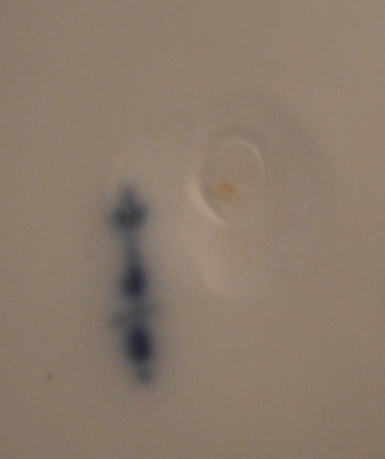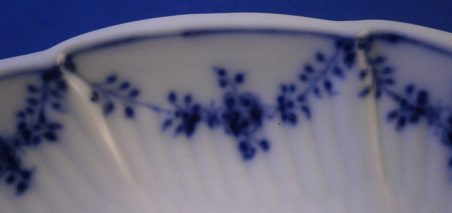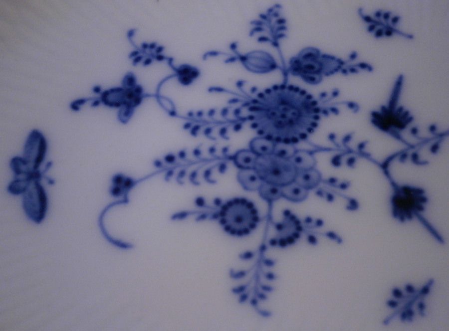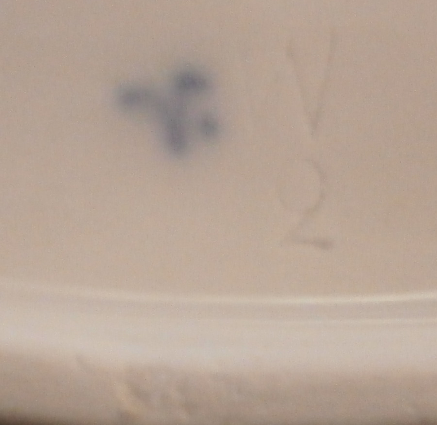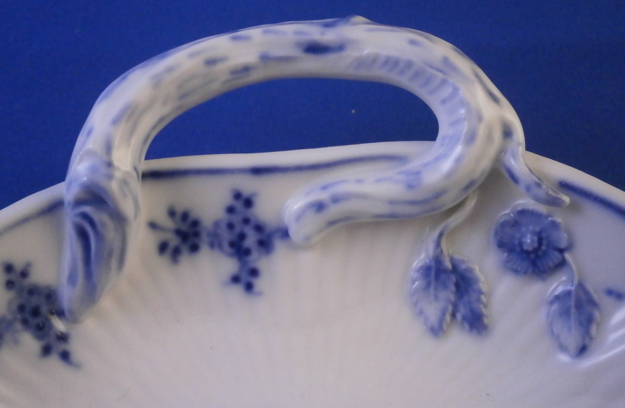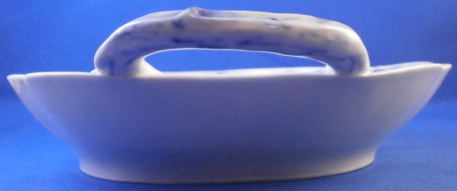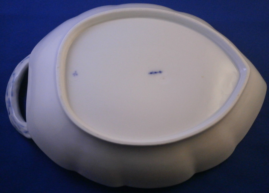 This is a nice leaf dish made by KPM in the 19th century. Having a tough time actually pinpointing a more exact date. On blue wares they did not use the orb mark till much later. I would date them to the 1830s. Eeither way it is nicely hand painted with their strawflower pattern in under glaze blue with the main floral arrangement in the center, a butterfly above that and a floral garland around the edge over a ribbed design to the paste. Nice branch shaped handle with blue highlightes and applied leaves and a flower to the terminal. The butterfly and the handle are my favorite part of the design! The dish is in perfect condition. It is 1.5 inches tall without the handle and 2.125 inches with the handle, 7 inches wide and 9.25 inches long including the handle. The piece is marked underneath with the under glaze blue scepter mark as shown, a blue letter v. as the blue painter's mark and an impressed letter V over 2. A spot near the mark is ground down which was either a flaw to the paste or a firing support. Hard to tell. Please email me for more information or other pictures.