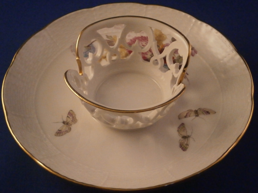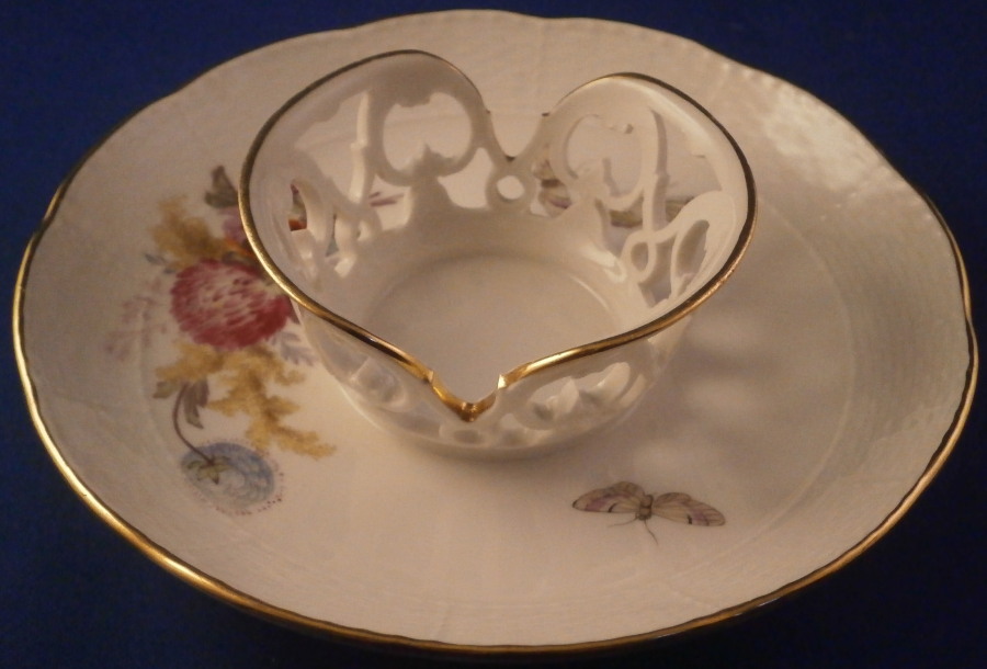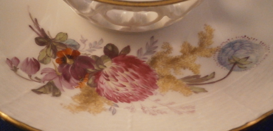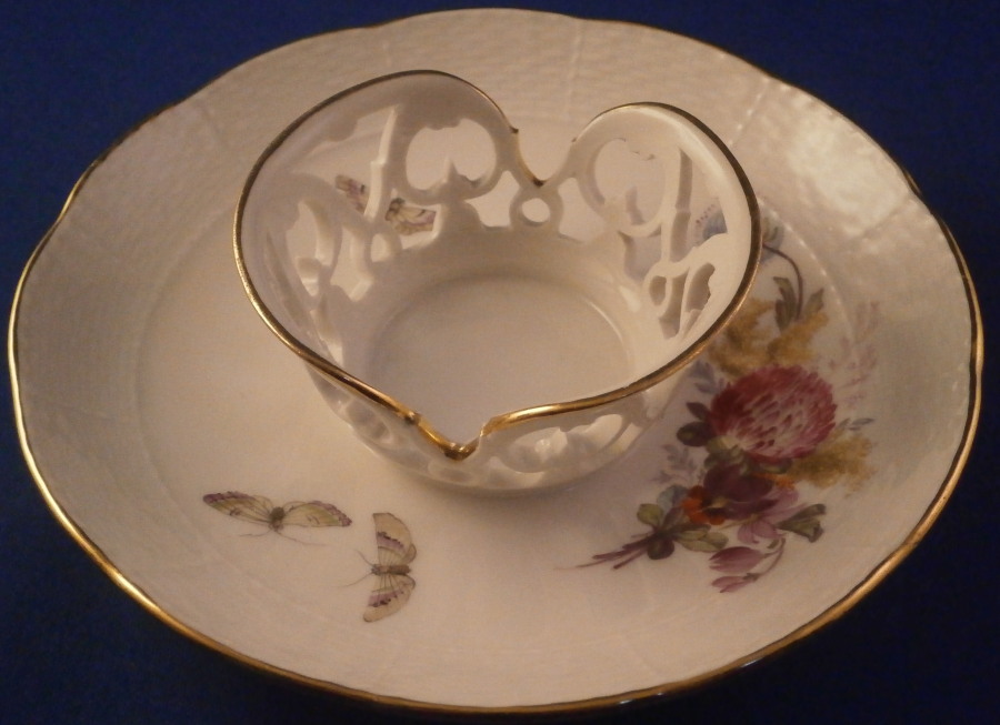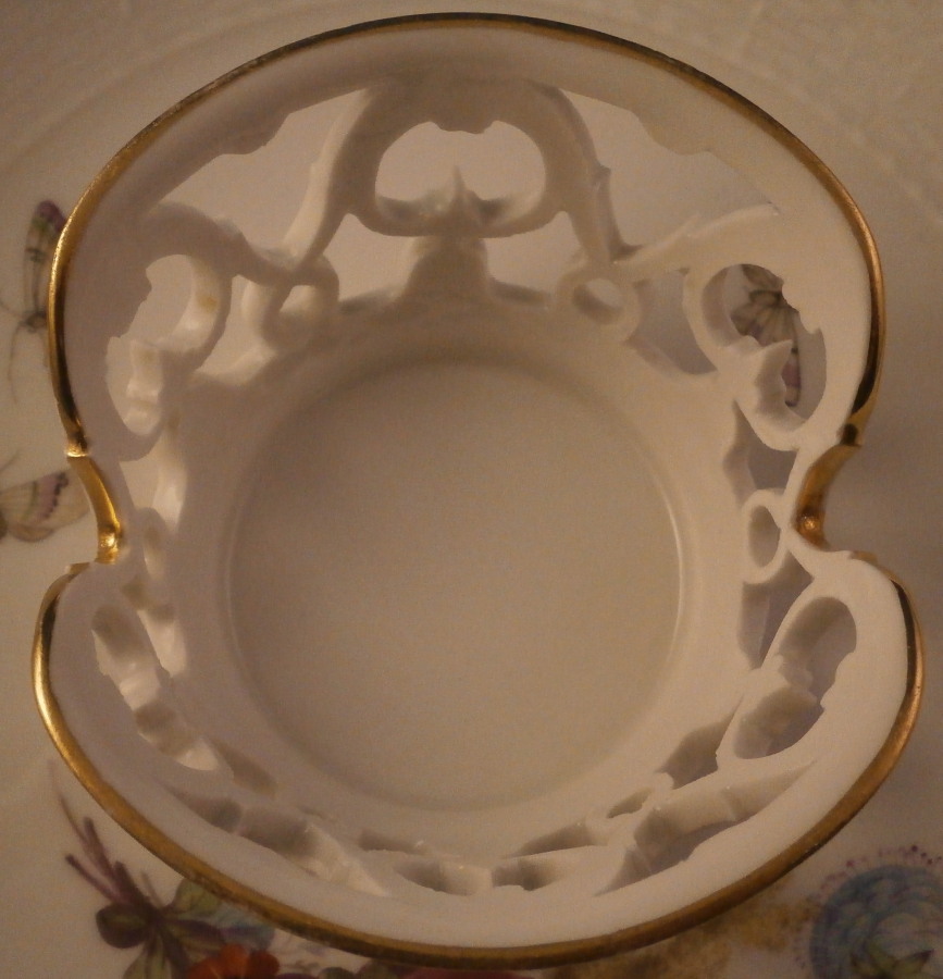 This is a really nice trembleuse style saucer made by KPM in the early 20th century - 1913 to be exact. This would ahve held a double handled beaker style cup possibly with a lid. These are hard to find but nothing is impossible :) The saucer's well has a raised rim that is reticulated and highlighted with gilding to hold the cup in place. It is hand painted with a nice floral arrangement to one side as well as three bugs, the rim has a basket weave design to the paste and gold trim to the edge. The piece is in perfect condition. It is 1 inch tall along the edge with the center sticking up another half inch or so and is 5.5 inches in diameter. The saucer is marked underneath with the under glaze blue scepter mark as well as the red orb mark, their anniversary mark of 1913 and the usual impressed and painted marks as shown. Please email me for more information or other pictures.