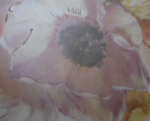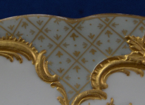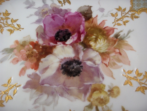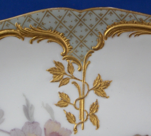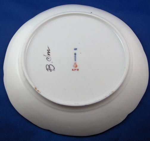 This is a superb plate made by KPM in 1913. It is handpainted with a really nice floral arrangement in the center in the Weichmalerei style with a great raised gold trim to the rim with leaves going into the plate and a green and gold design trim to the spaces between the edge and the raised gilding. I have never seen a trim this elaborate on this style of plate. Quite nice and definitely stunning to look at. The plate is in perfect condition with very minor wear. It is 0.875 inches tall and 8.625 inches in diameter. The piece is marked underneath with the underglaze blue scepter, a blue letter B or maybe D, the red orb mark, an artist mark of two arrows pointing in opposite direction, the impressed letter M and some kind of mark that looks like a sun impressed as well. The black writing was added by a previous owner and could be taken off if one wished to do so. Please email me for more information or other pictures.