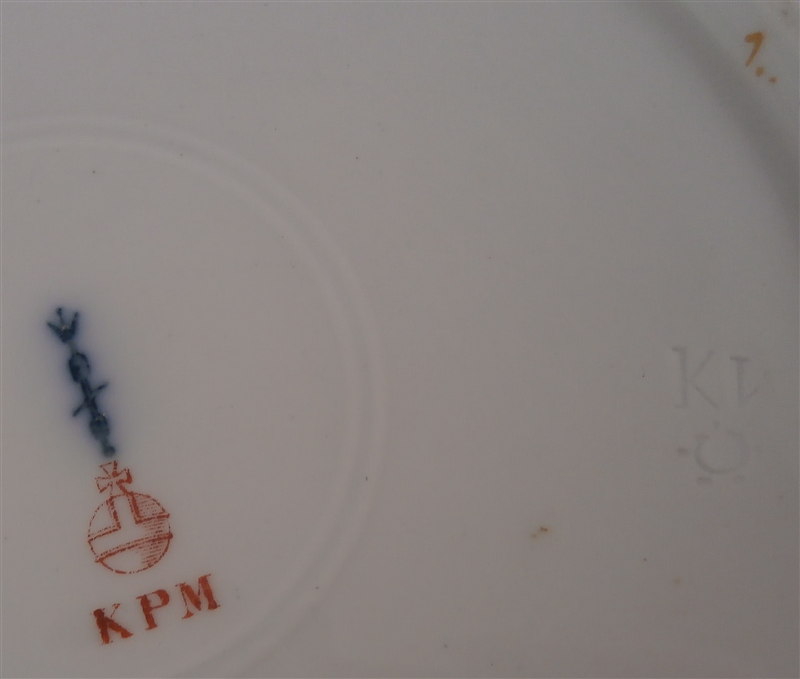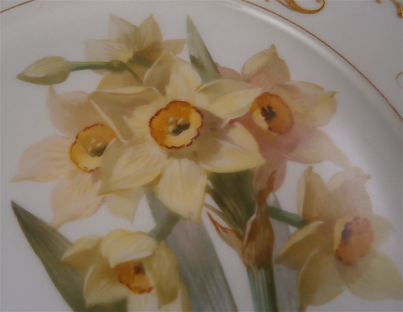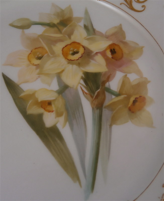 This is an amazing plate made by KPM in the early 20th century. One of the best if not the best I have come across in all these years with an unusual flowers painting as well as a nice gold trim. The plate is handpainted with a couple of daffodil flowers in the center of such a high quality it looks real. The rim is decorated in the Art Nouveau / Jugendstil style with raised gold scrolls and a slightly greenish ground color between the scrolls as well as a raised gold flower and leaf design. All in all an amazing plate and it is in excellent condition with some very minor wear to the gilding on the rim. The plate is 1 inch tall and 8.375 inches in diameter. It is marked underneath with the underglaze blue scepter as well as the red orb mark and the usual impressed and painter's marks. Please email me for more information or other pictures.