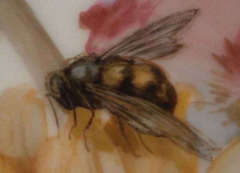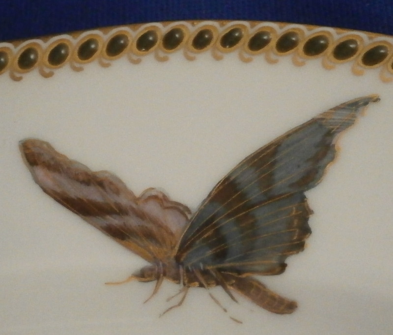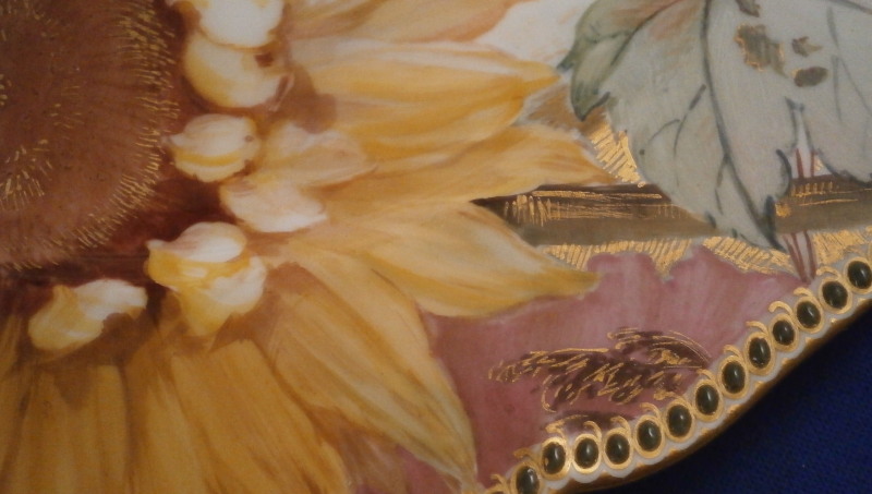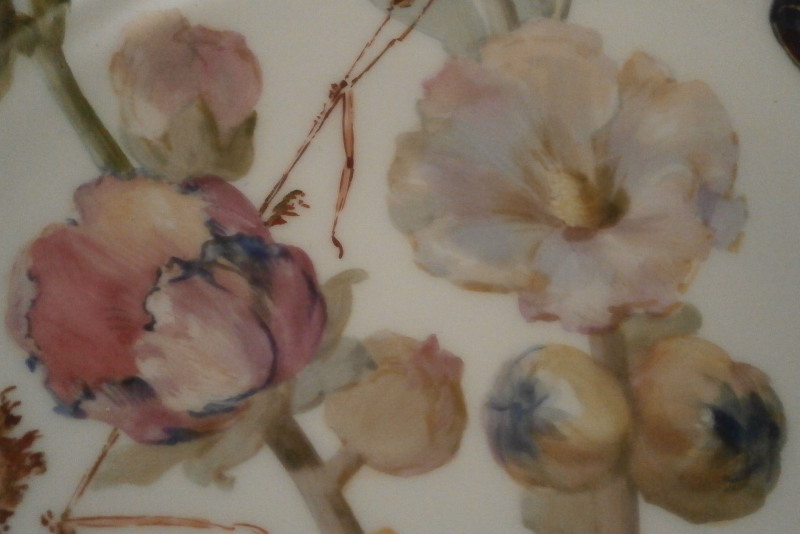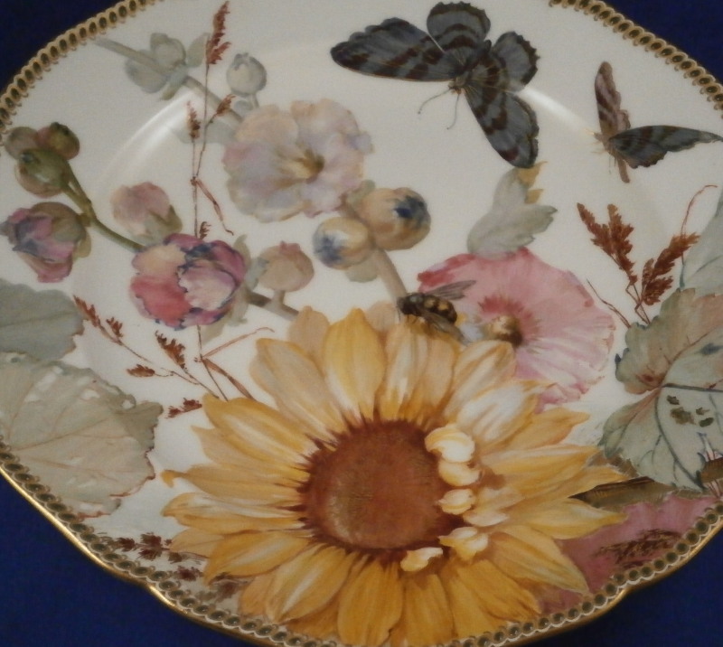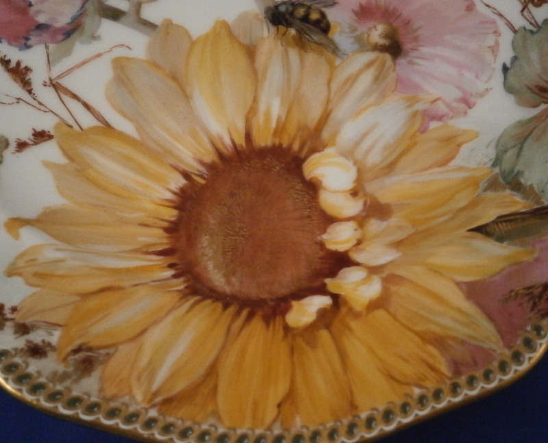 This is something special. I have owned some amazing plates by KPM over the years but this one along with the other five on the site have to be the most amazing plates I have ever seen from this period in the Weichmalerei style or any other style or maker! The plate was made in the late 19th century during the Art Nouveau period plate by KPM Berlin. The entire surface of the plate is hand painted with a top notch flower design including a sunflower (which makes this one my wife's favorite plate!) as well as lots of other flowers and leaves. A bee is sitting on top of the fun flower with two butterflies fluttering above the flowers. The flowers of these plates are stunning - among the best and most life like to have ever been painted except for maybe those by Eduard Braunsdorf . There are also some grasses and leaves as well as some nice gold highlight here and there. I cannot tell you how amazing this plate looks so have a look at the picture to get an idea - though it looks much better in real life. To top it off the nicely shaped rim has raised Seger enamel "jewels" in green with some gold trim. I have not seen anything like it nor can I find any others. A truly superb plate and it is in perfect condition. The piece is 1.25 inches tall and 9.75 inches in diameter. It is marked underneath with the underglaze blue scepter, the red orb mark as well as a gilder's mark and the usual impressed marks of the period. Quite possibly painted by the famous painter Paul Miethe or Ernst Heinecke though this plate here is not signed nor does it have a painter's mark just that for the gilder. Please email me for more information or other pictures.