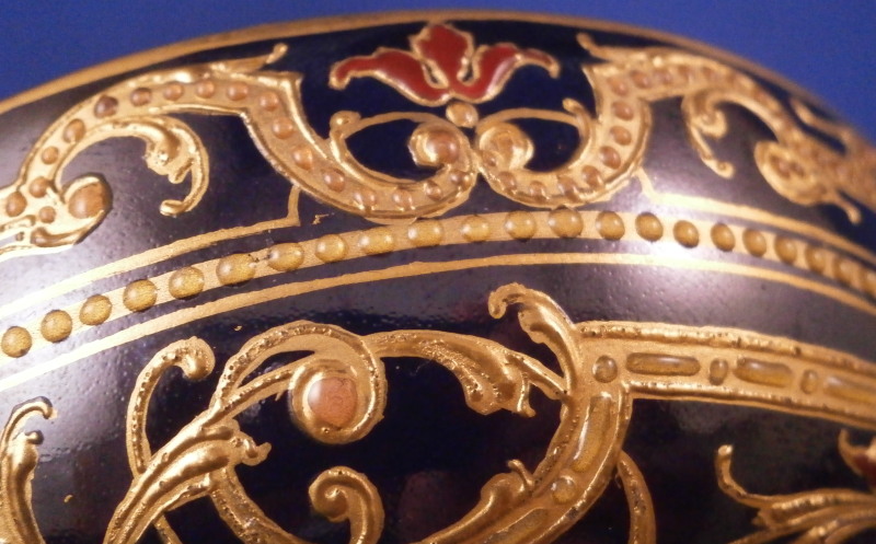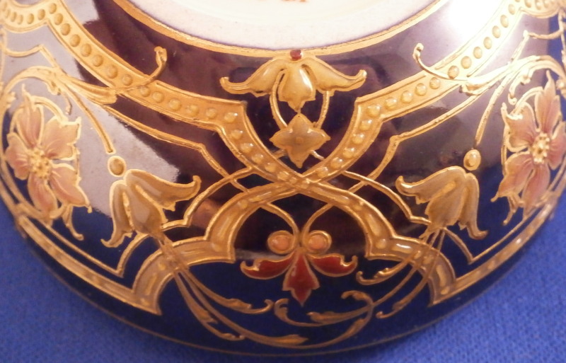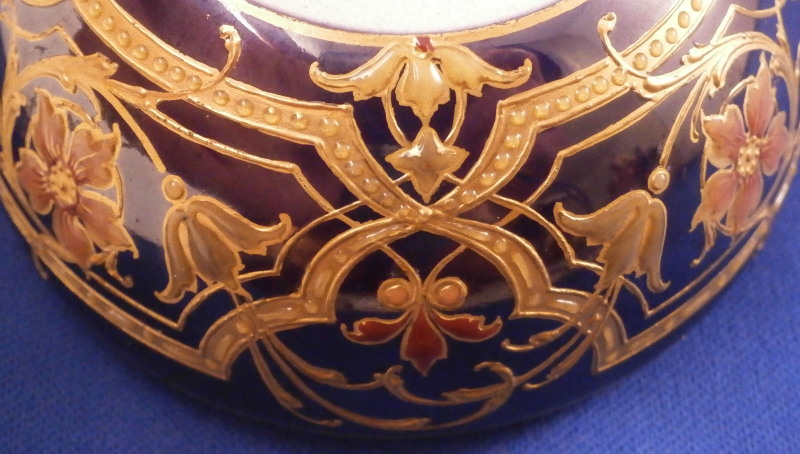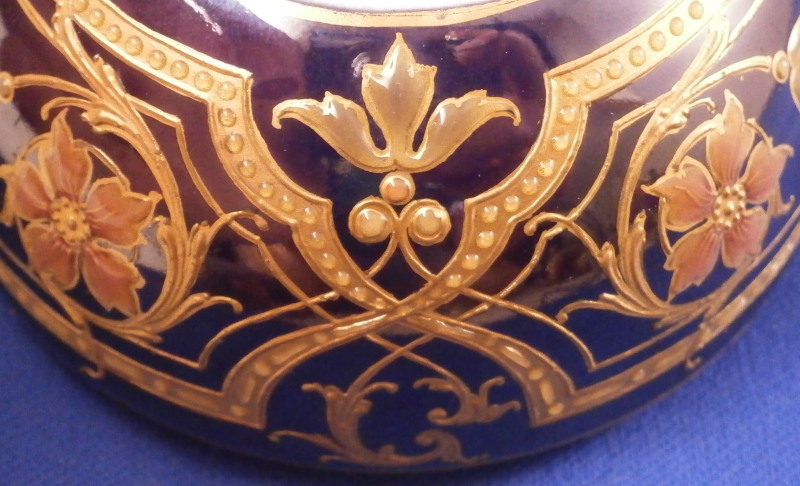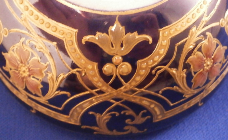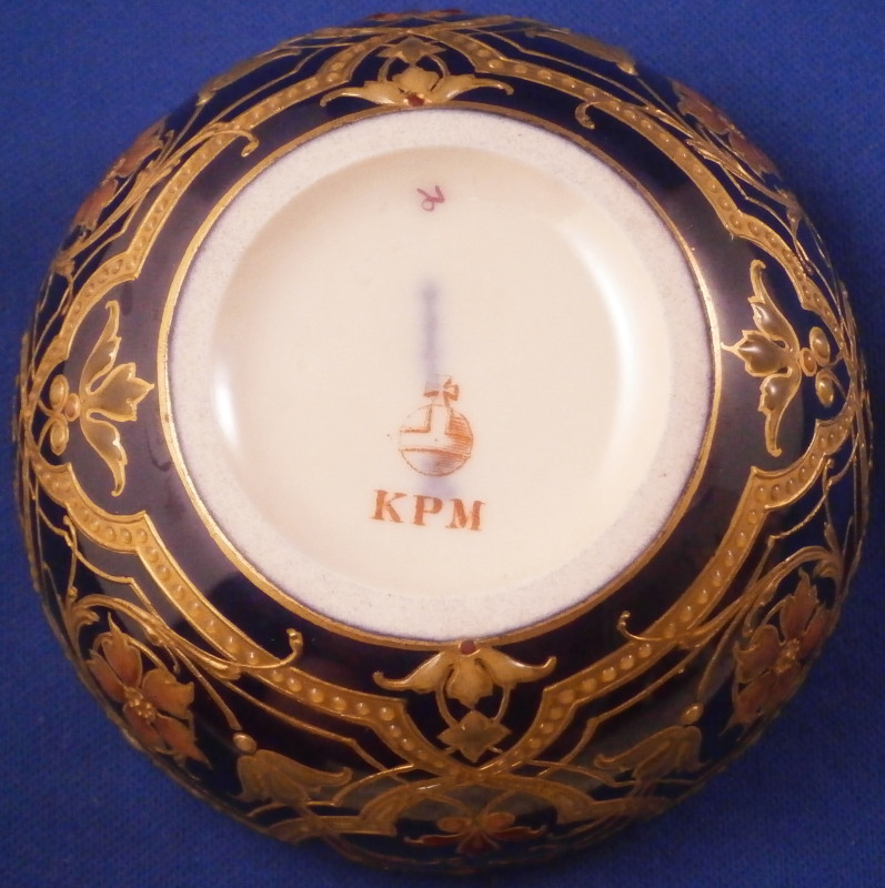 This is a really amazing Art Nouveau / Jugendstil lidded box made by KPM in the late 19th / early 20th century. Probably the nicest piece in this style I have seen. The bottom part and lid have a blue ground color to it that has an iridescent sheen to it over which a design in gilding was applied much of it raised an which there are lots of applied enamel raised " jewels " as well as enamel flowers that are simply stunning. The center piece is a vase filled with flowers all done in these Seger raised translucent enamels that are the best there is in the procelain world. I don't want to know how many times this piece had to be fired to complete it but it is a masterpiece! The inside is an ivory color one often sees done on this type of ware. The design is intricate and stunning and it being done on that awesome blue ground - it really does not get better than this! And on top of it all the piece is in perfect condition. The box is 2.5 inches tall and 3.25 inches in diameter. The piece is marked underneath with the under glaze blue scepter, the red orb mark, as well as an artist mark as shown plus the usual impressed marks of the period. Please email me for more information or other pictures.