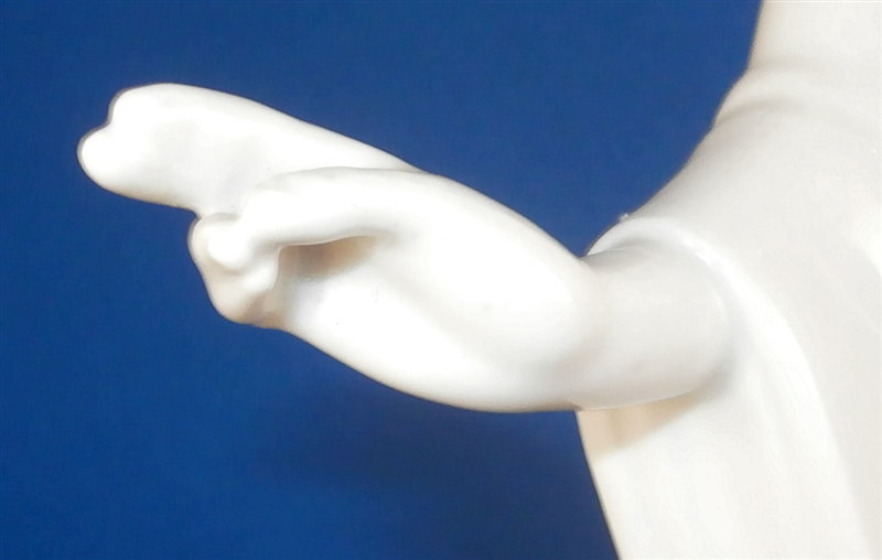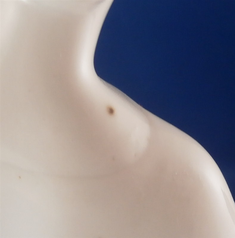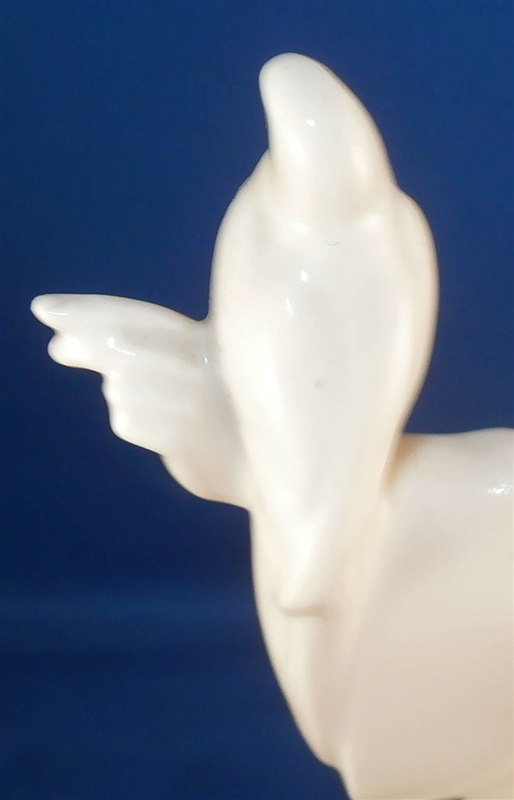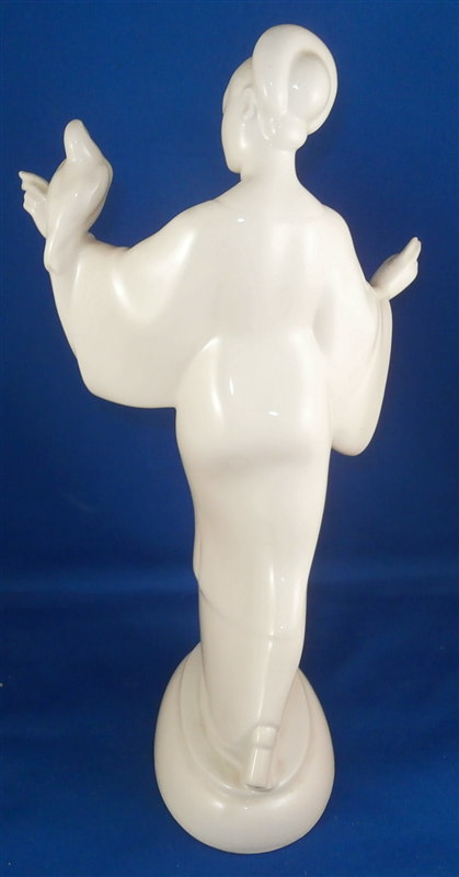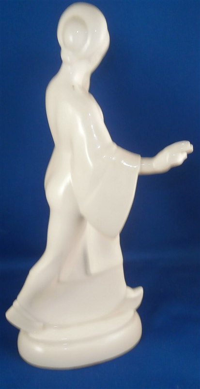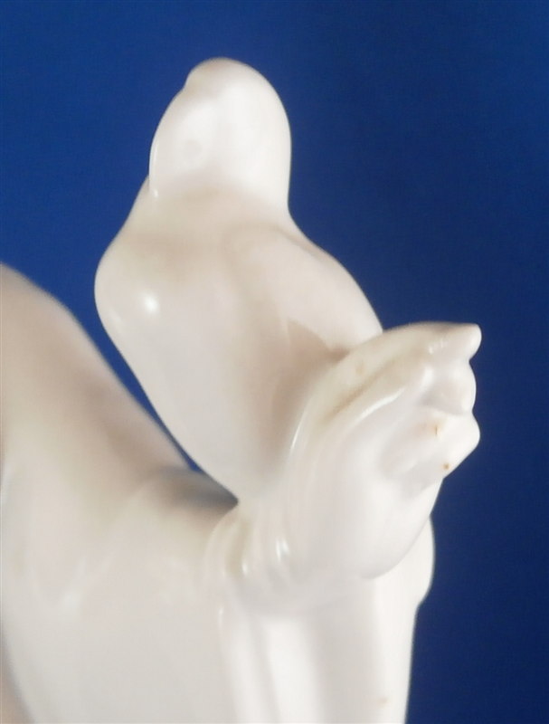 This is a very nice figurine made by KPM in the early 20th century during the original period. Almost impossible to find in white from this period and in perfect condition on top of that! It is an Asian lady (I think Chinese) wearing a flowing robe with a parrot on her left hand. She is standing on a simple yet elegant base. This figurine was part of the crown prince's wedding procession designed by Adolf Amberg and extremely popular among collectors even today though most one sees are newer models! One can see why - a well modeled figurine that is super elegant and left in the white brings this out even more I think! The figurine is in perfect condition with a brown firing spot on the back of her right shoulder neck itnerface. She displays perfectly and is 10.25 inches tall, 5.625 inches wide and 4.5 inches deep. The figure is marked underneath with the older udnerglaze blue scepter mark as well as the usual impressed marks one finds on older KPM pieces though I cannot make out this year mark. Could be 1927 or 1931. The scepter has a scratch mark in the glaze denoting a second choice due to the brown spot on her shoulder. Please email me for more information or other pictures.