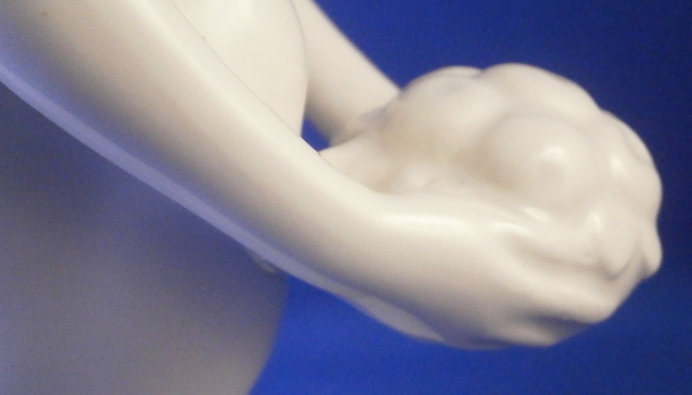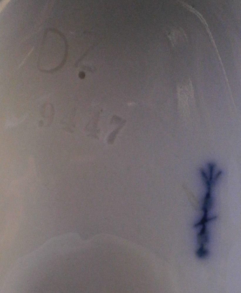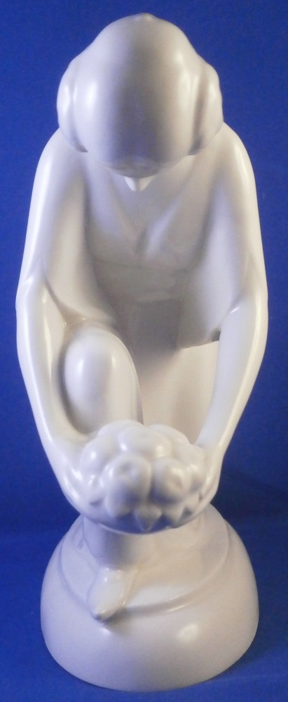 This is a very nice figurine made by KPM in the early 20th century during the original period. One of the rarer models and quite difficult to find in white from this period and in perfect condition on top of that! It is a Turkish lady that is kneeling and presenting a bowl of fruit. She is wearing a flowing robe and has a simple yet elegant base. This figurine was part of the crown prince's wedding procession designed by Adolf Amberg and extremely popular among collectors even today though most one sees are newer models! One can see why - a well modeled figurine that is super elegant and left in the white brings this out even more I think! The figurine is in perfect condition with a few tiny brown firing spots as shown. She displays perfectly and is 6.875 inches tall, 2.75 inches wide and 6.5 inches deep. The figure is marked underneath with the older under glaze blue scepter mark as well as the usual impressed marks one finds on older KPM pieces as shown. Z is the year mark for 1925. The scepter has a scratch mark in the glaze denoting a second choice due to the brown firing spots. Please email me for more information or other pictures.