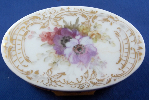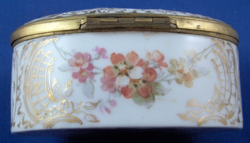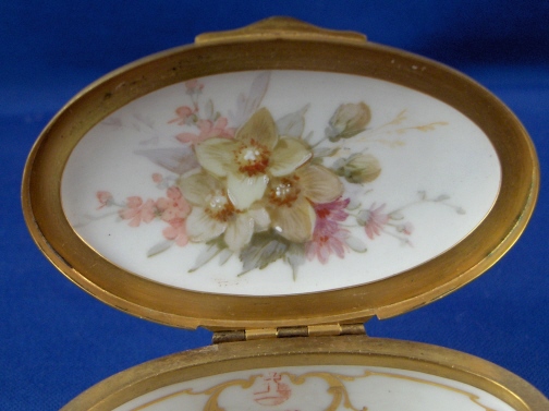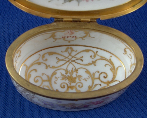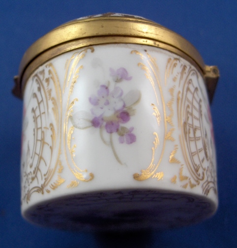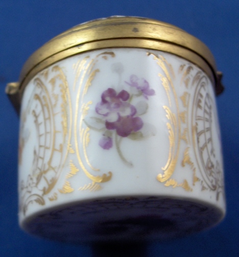This is a rare porcelain patch / snuff / pill or tabacco box made in the Art Nouveau period by KPM around 1900. The top of the lid has a handpainted scene of two putti wearing yellow cloth sitting in a cloud with a butterfly by them on it that is surrounded with some nice gold trim. The bottom as well as the front, back, both sides and inside lid of the box have some superb flowers in the Weichmalerei style using softer colors handpainted on them as well as some more superb gold trim. The inside bottom of the box also has a some nice fancy gilding on it. The box is marked on the inside back with the red orb mark as well as on the side with the underglaze blue scepter (which is very faint but one can see the slightly blue line there. The metal mounts are probably bronze. The box is in perfect condition with the teeniest of wear to the bottom. It is just under 3 inches wide, 1.5 inches tall and 1.875 inches deep. Please email me for more information or other pictures.