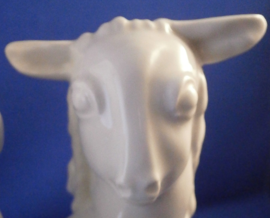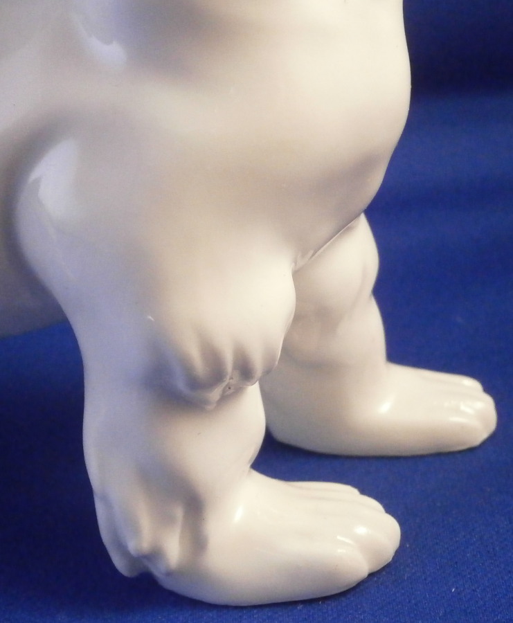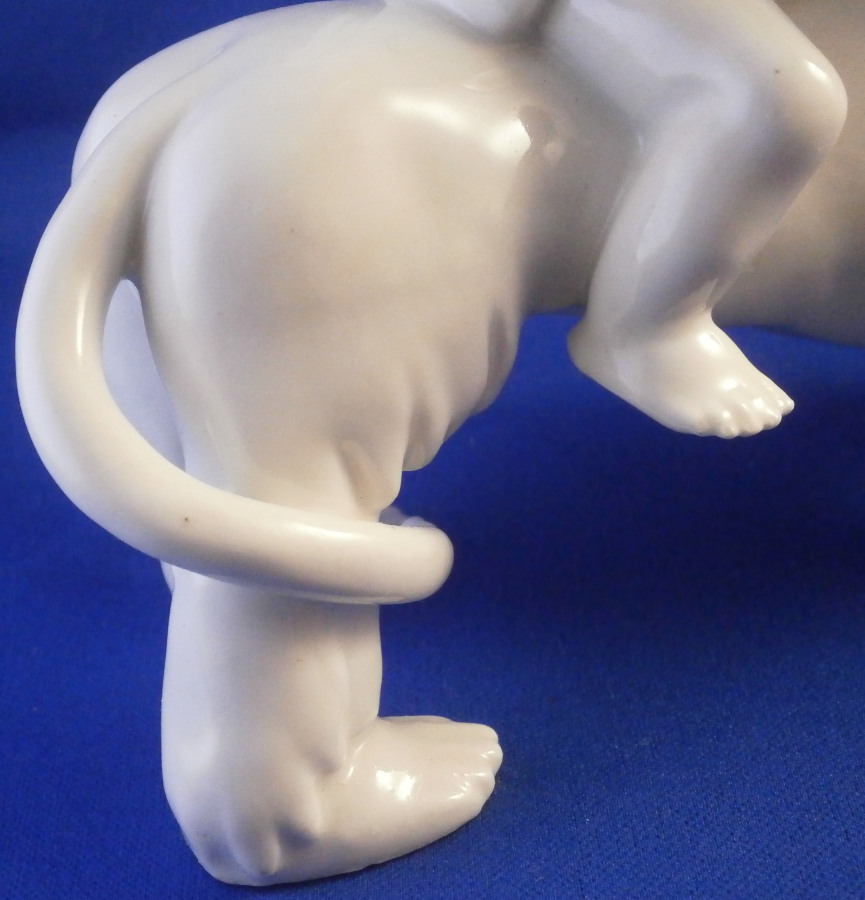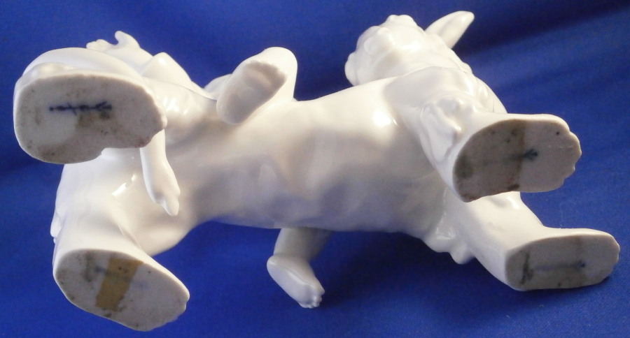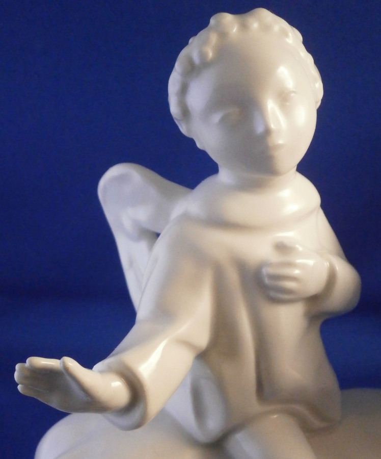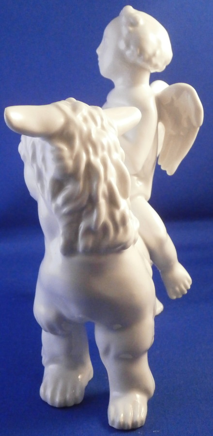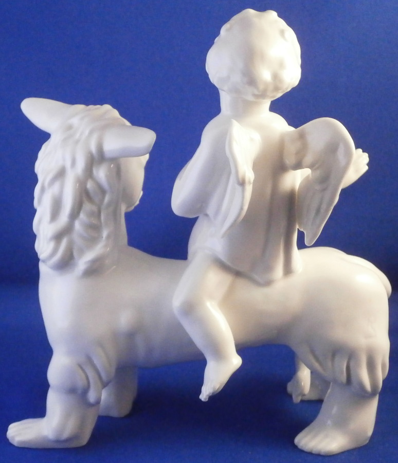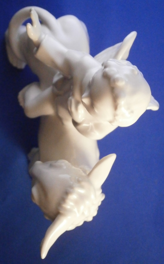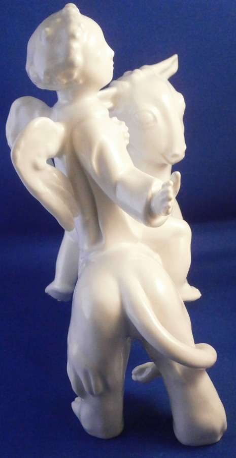 This is an awesome figurine made by KPM in the early 20th century during the Art Nouveau period. It looks very much like it was done by Ruth Schaumann who also made a series of four standing angels but I could not find another example of this piece here. The figure is superbly modeled and left in the white to show off all those details. It is of an angel riding a Fabeltier (an imaginary animal). A really funky looking piece thst is super unusual. The piece is marked underneath with the under glaze blue scepter on each of the feet as shown. Might be a trial piece? The figurine is in perfect condition which is always nice to find! It is 6 inches tall, 2.75 inches wide and 5.5 inches long. Please email me for more information or other pictures.
